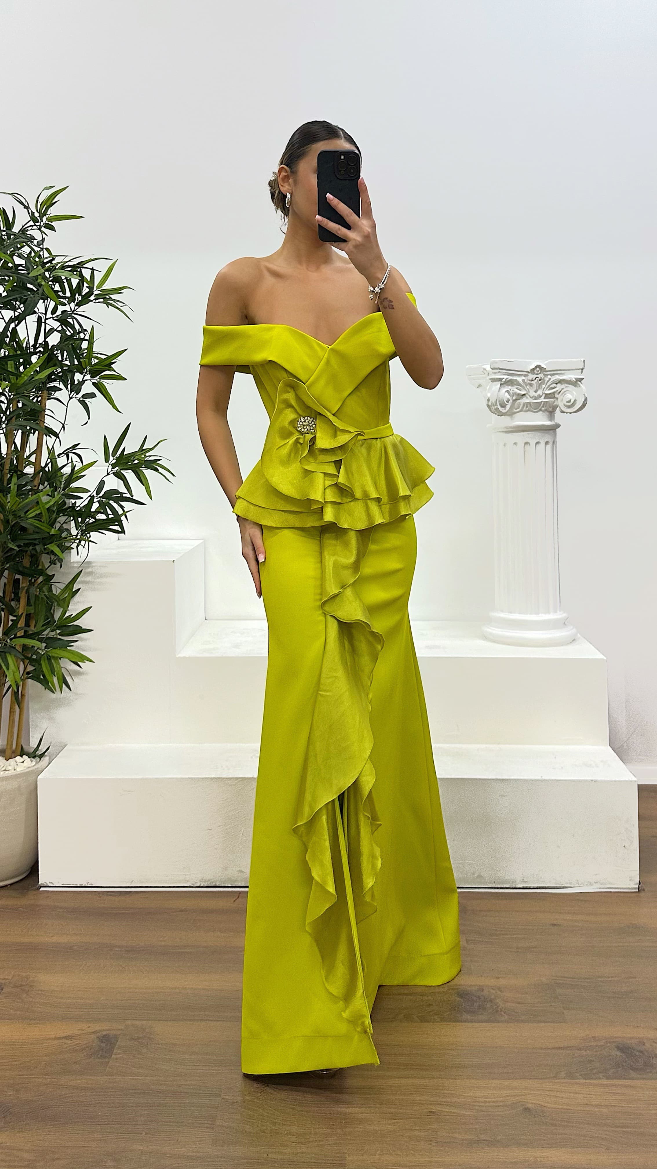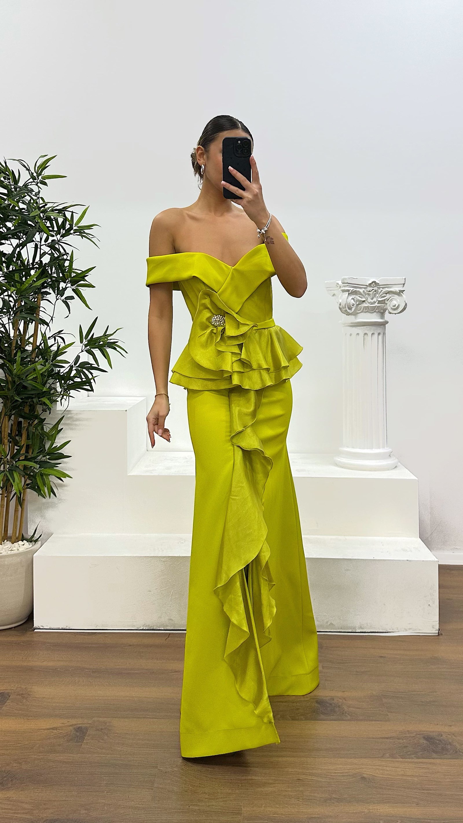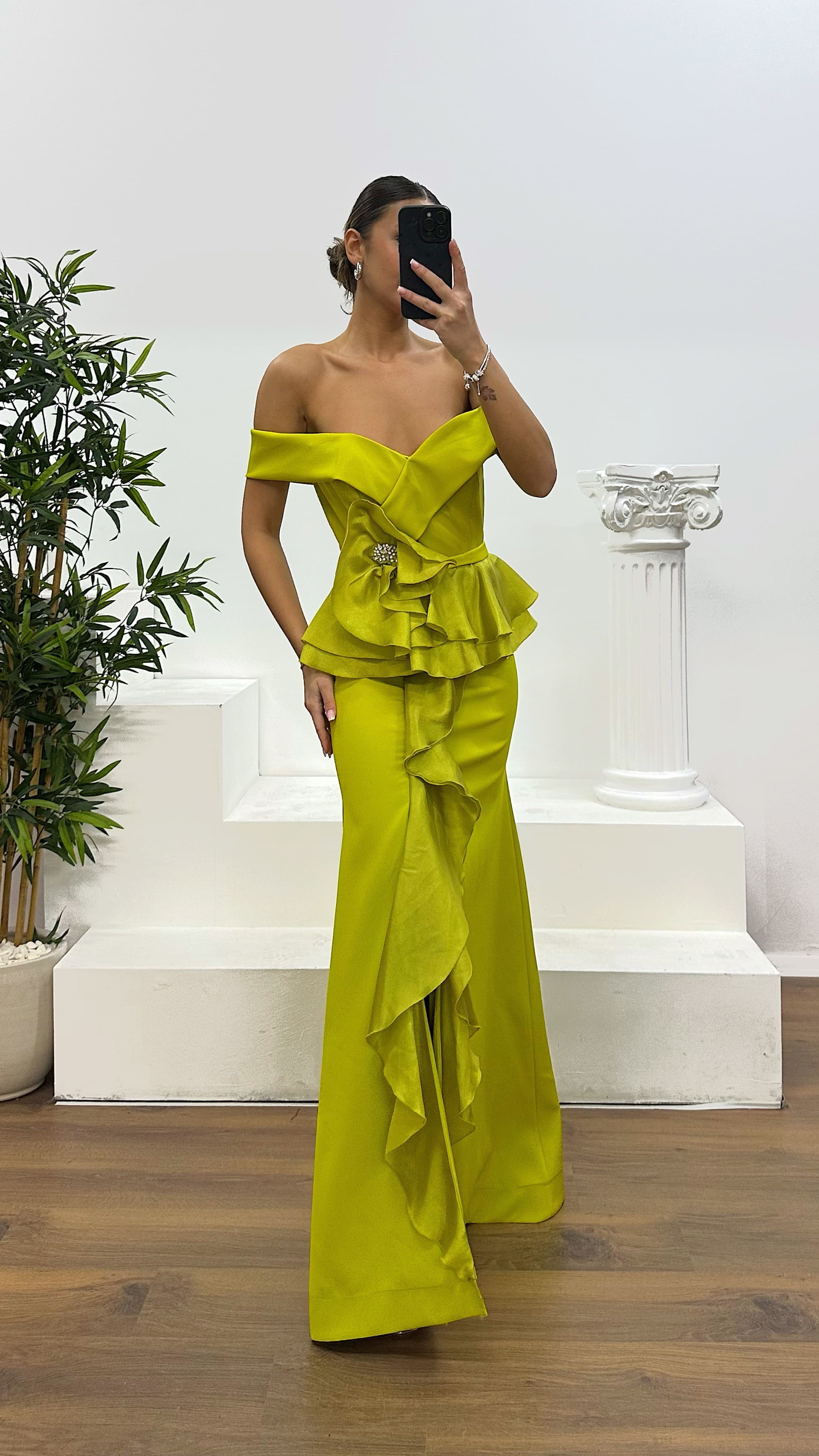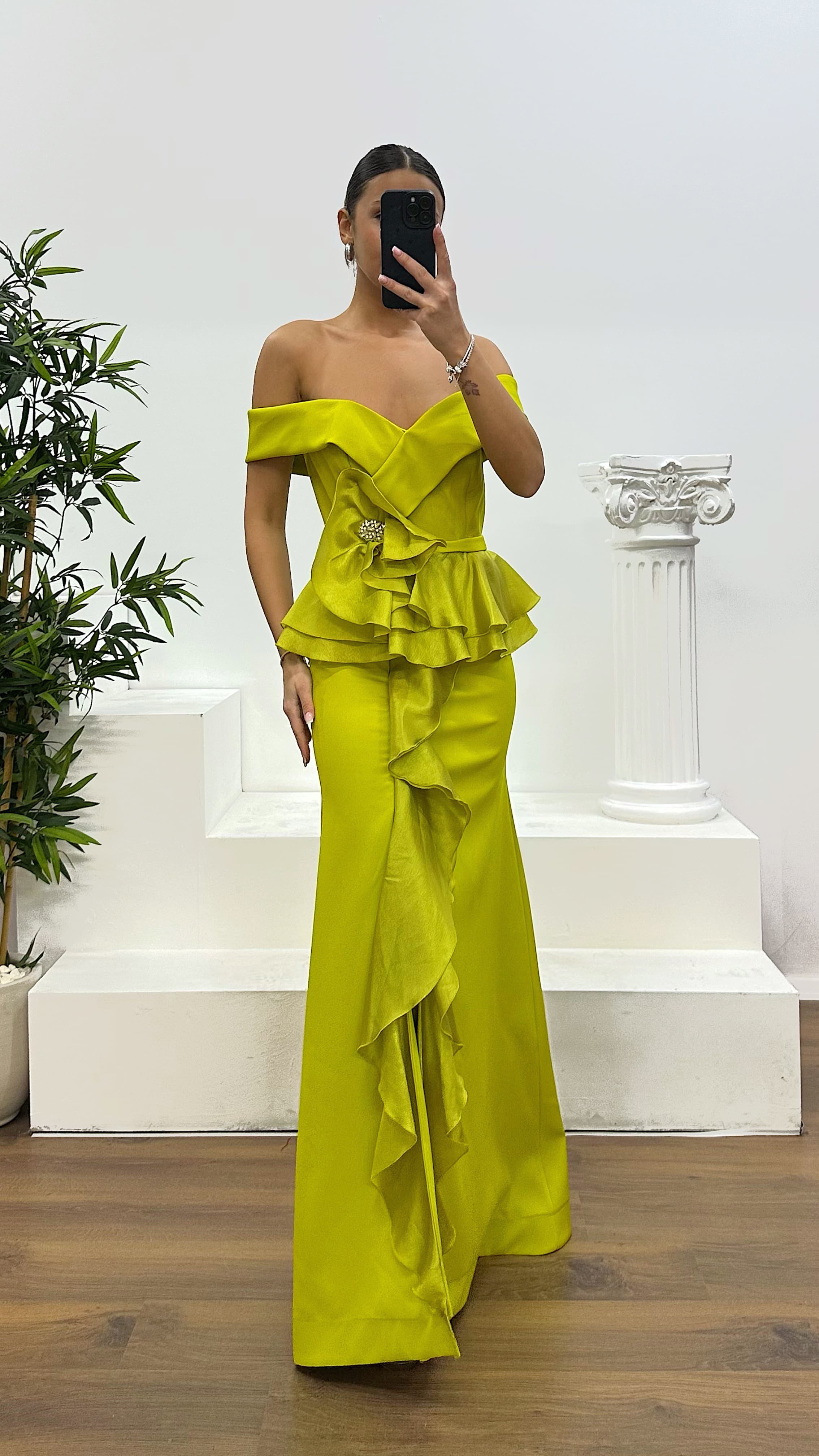• Fıstık Kayık Yaka Volanlı Abiye Elbise