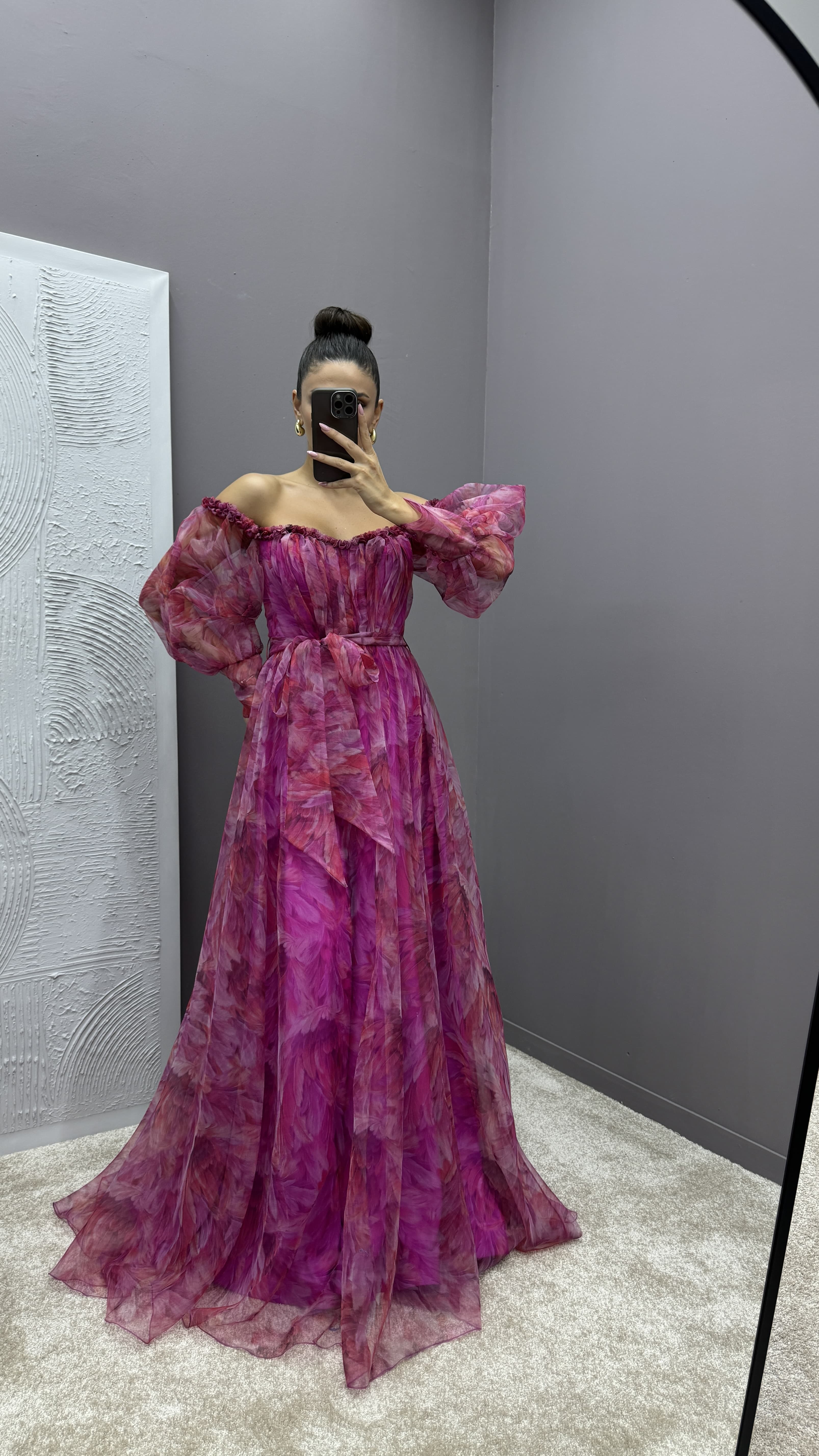 • Fuşya Balon Kol Göğsü Fırfırlı Desenli Tasarım Elbise