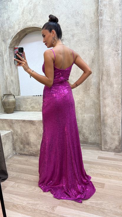 • Zümrüt İp Askılı Göğsü Fiyonk Payet Elbise