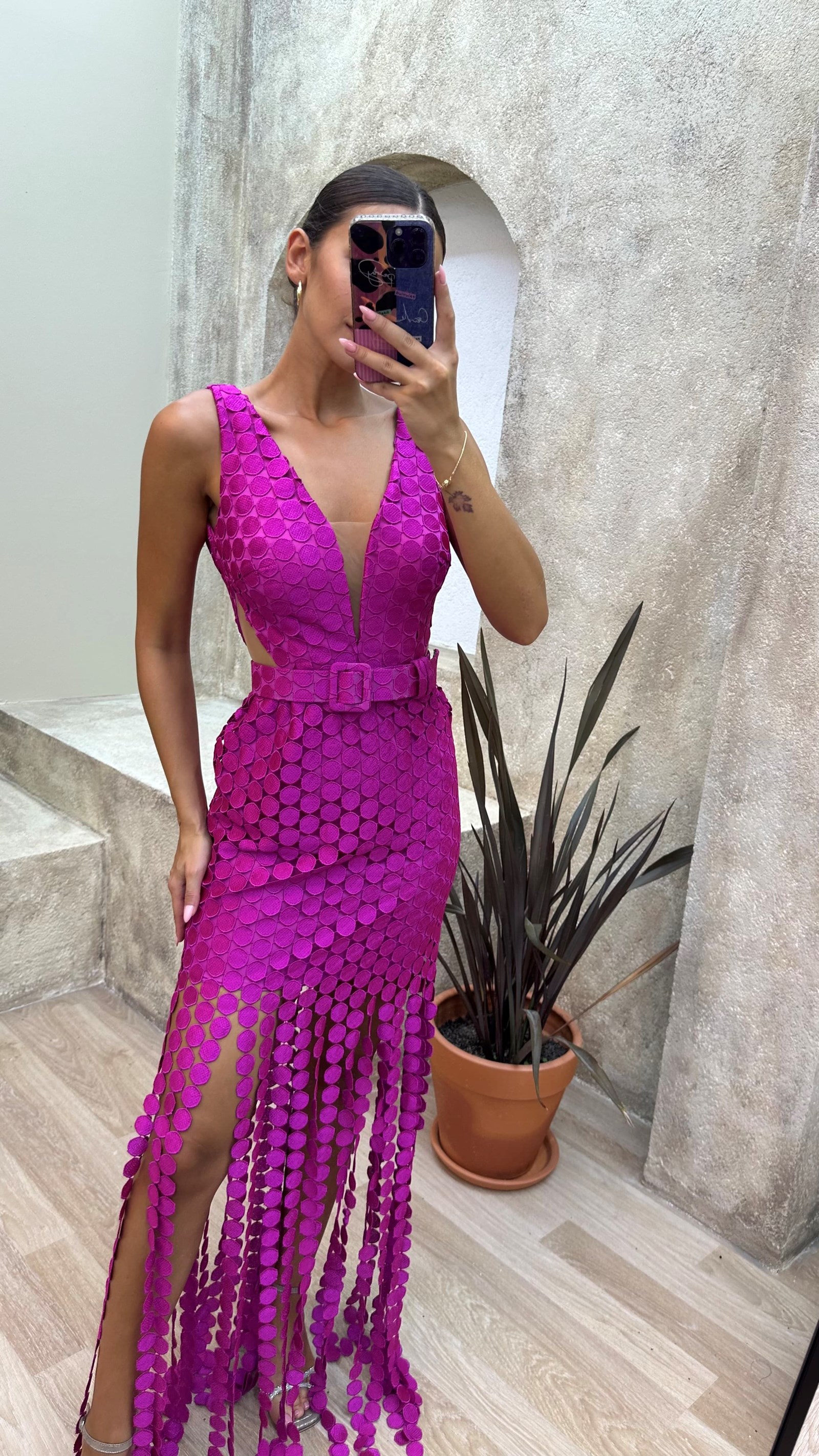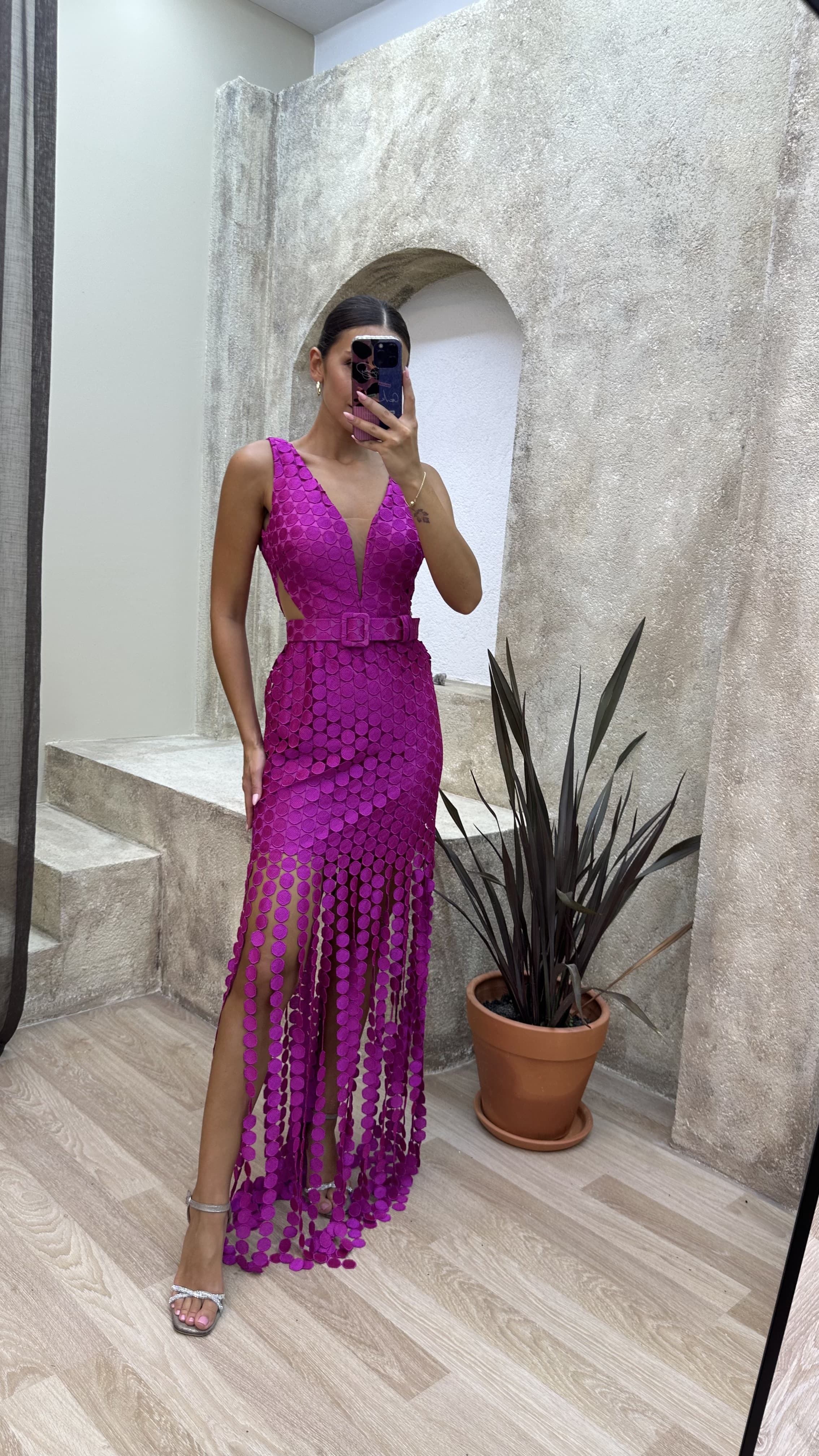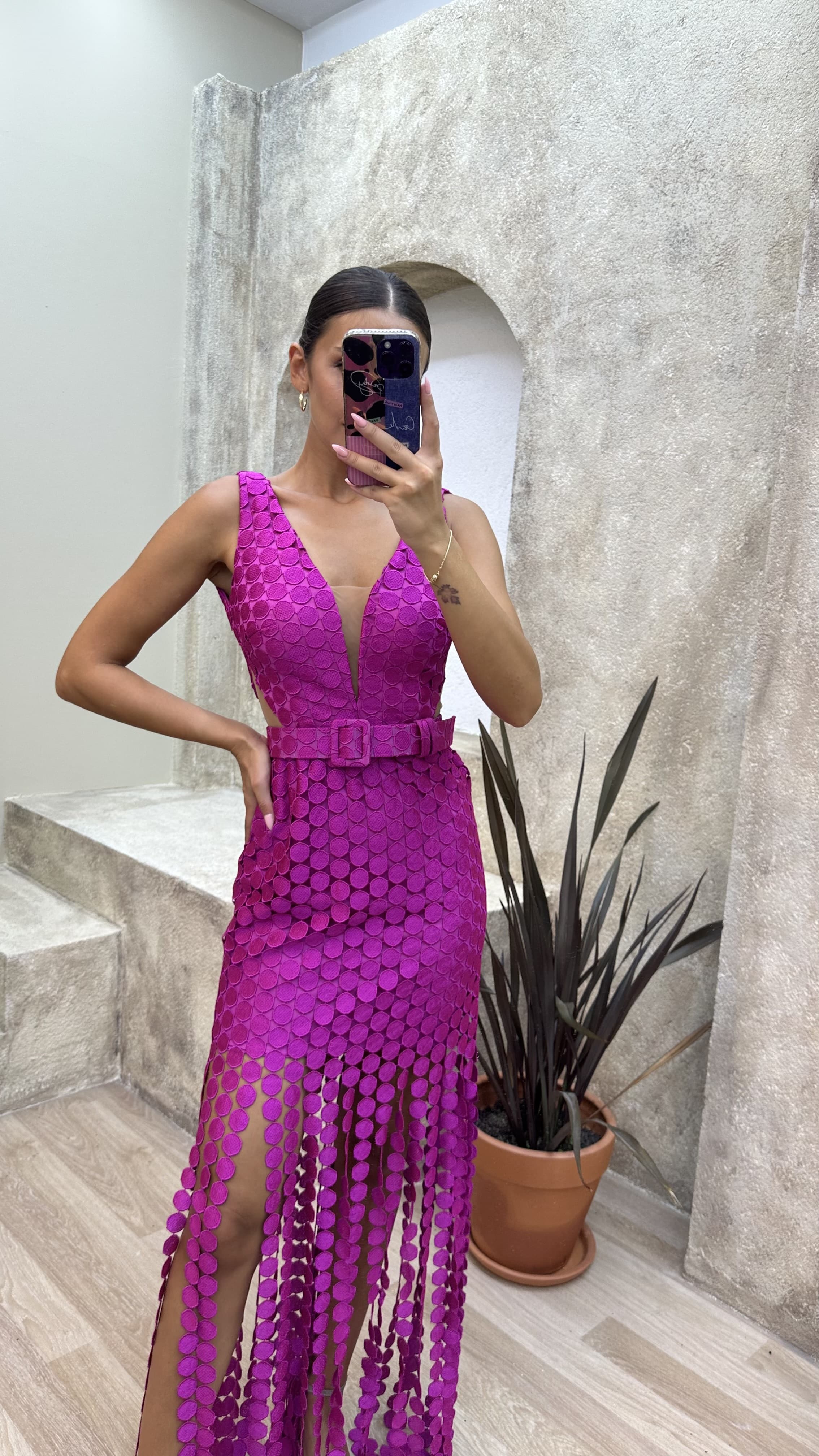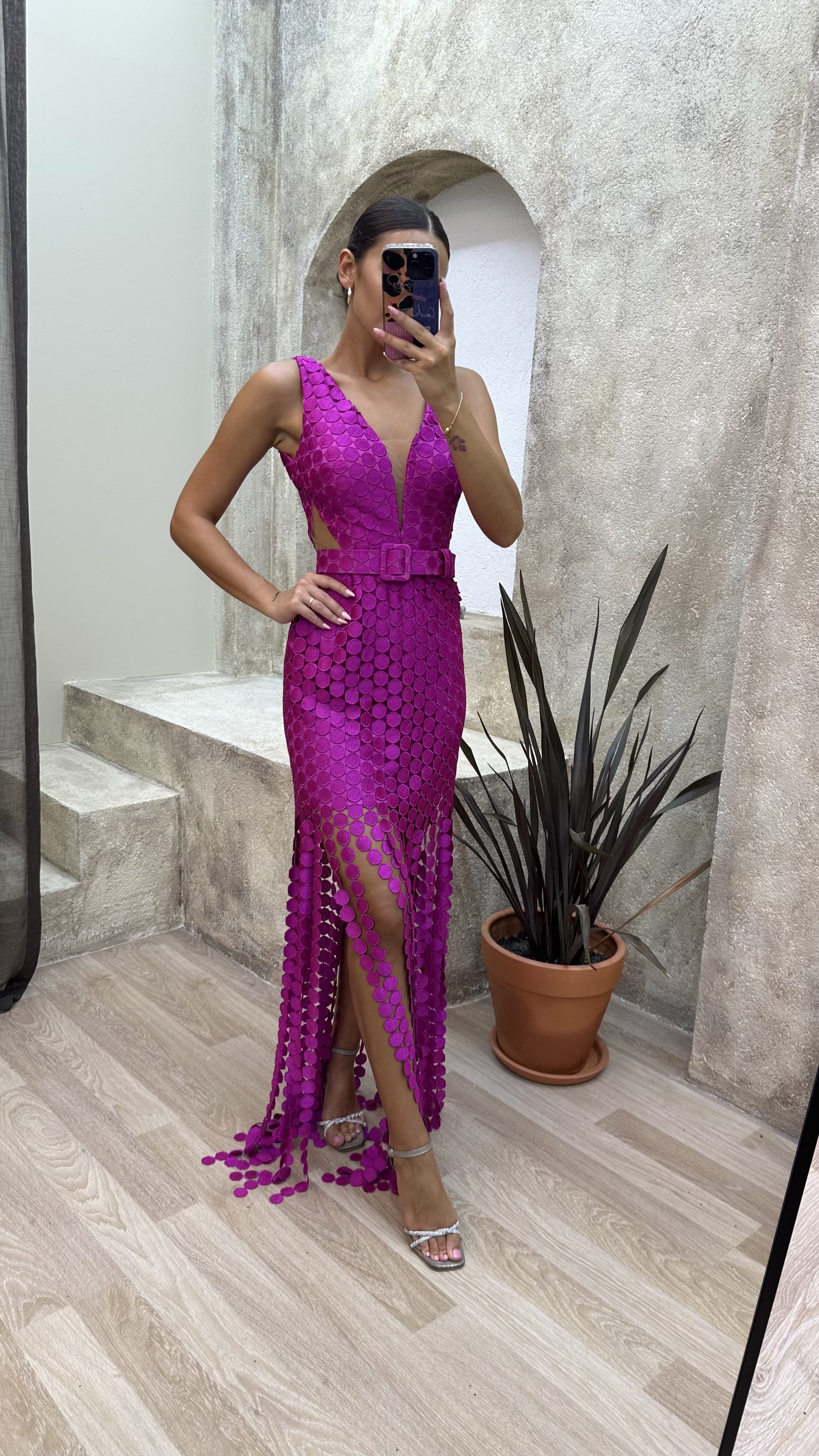 Fuşya Puantiyeli Bel Detay Kemerli Abiye Elbise