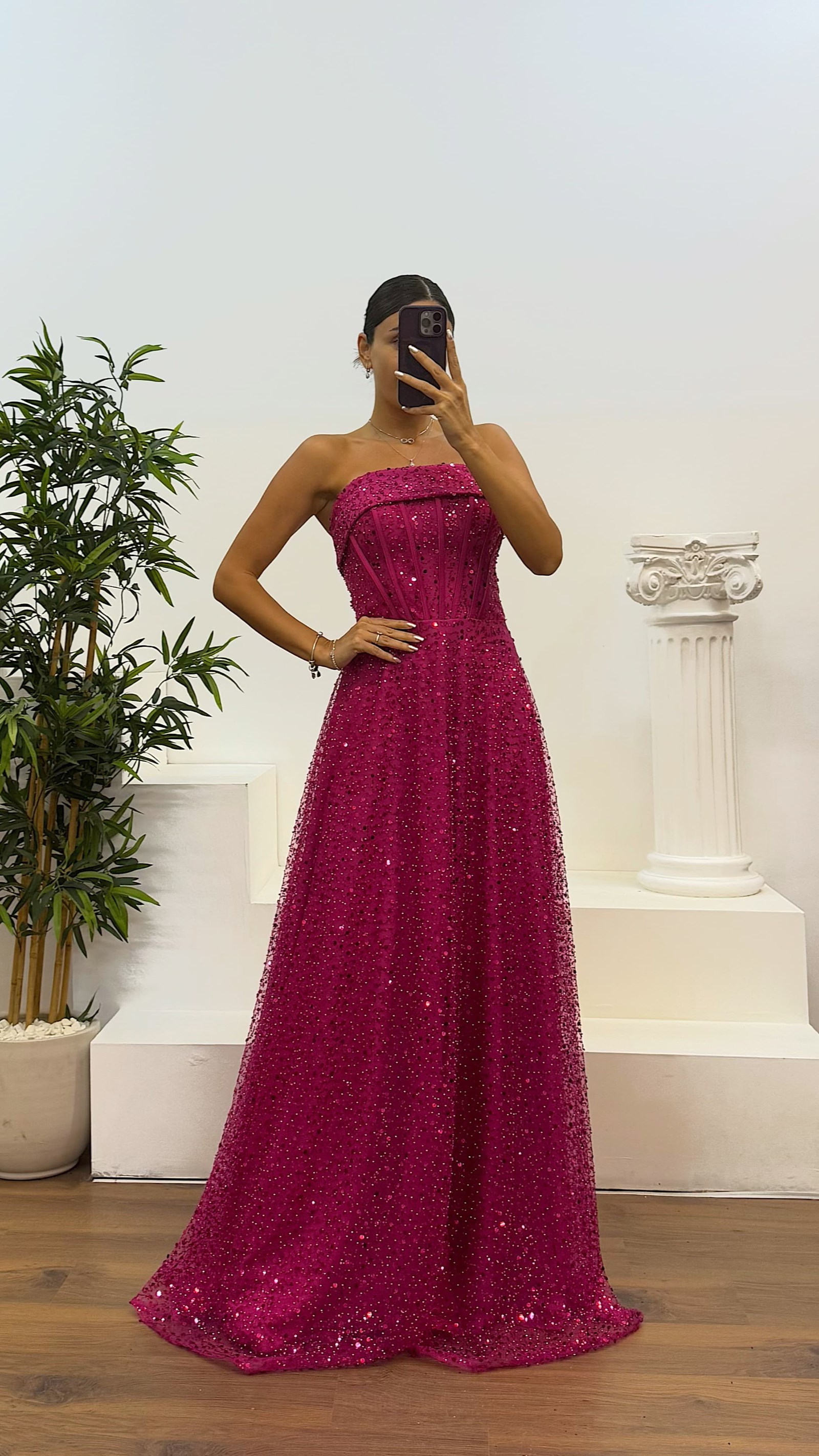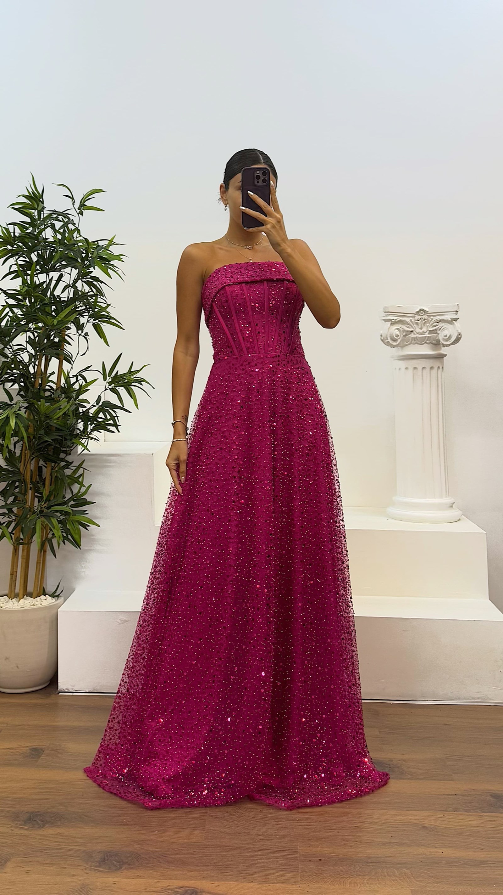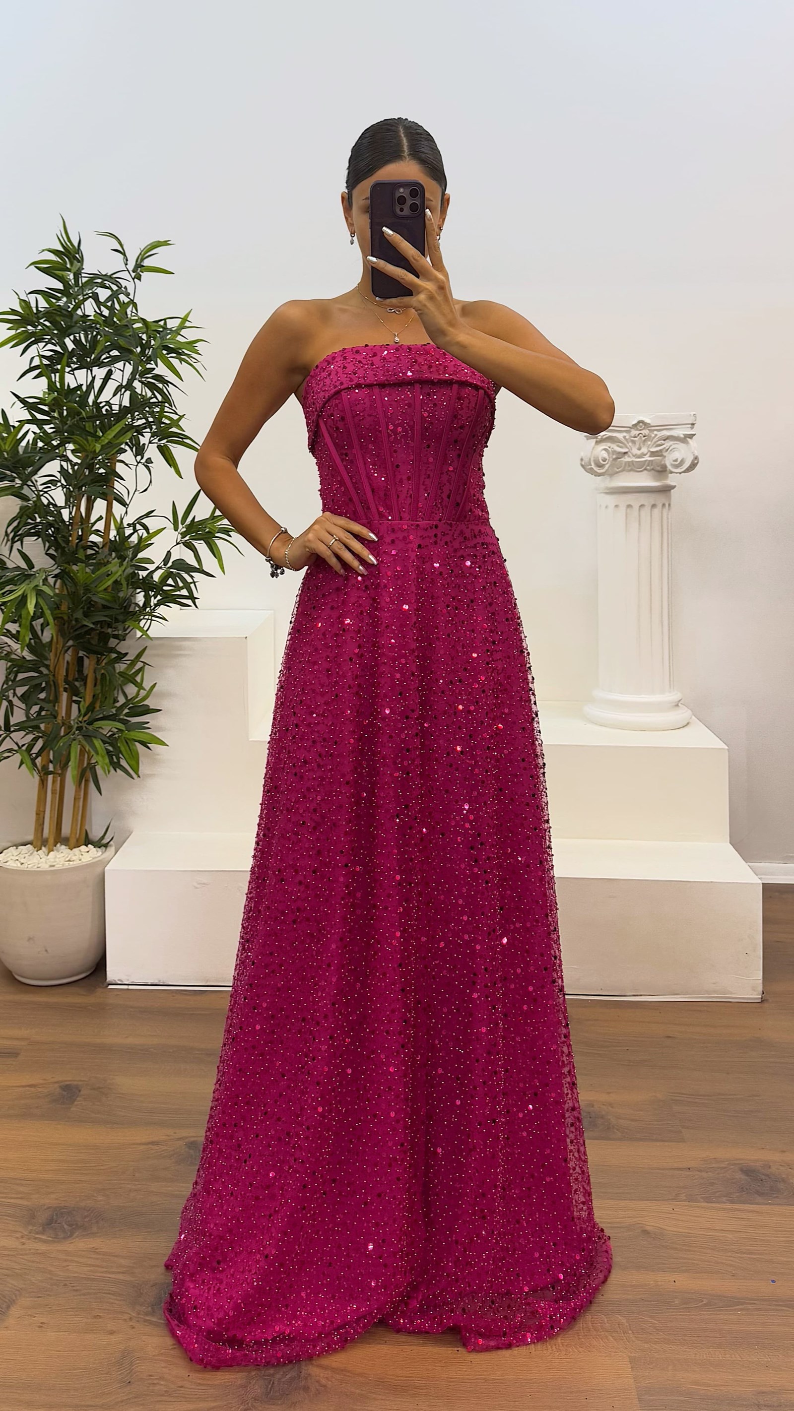 • Fuşya Straplez Boncuklu Abiye Elbise