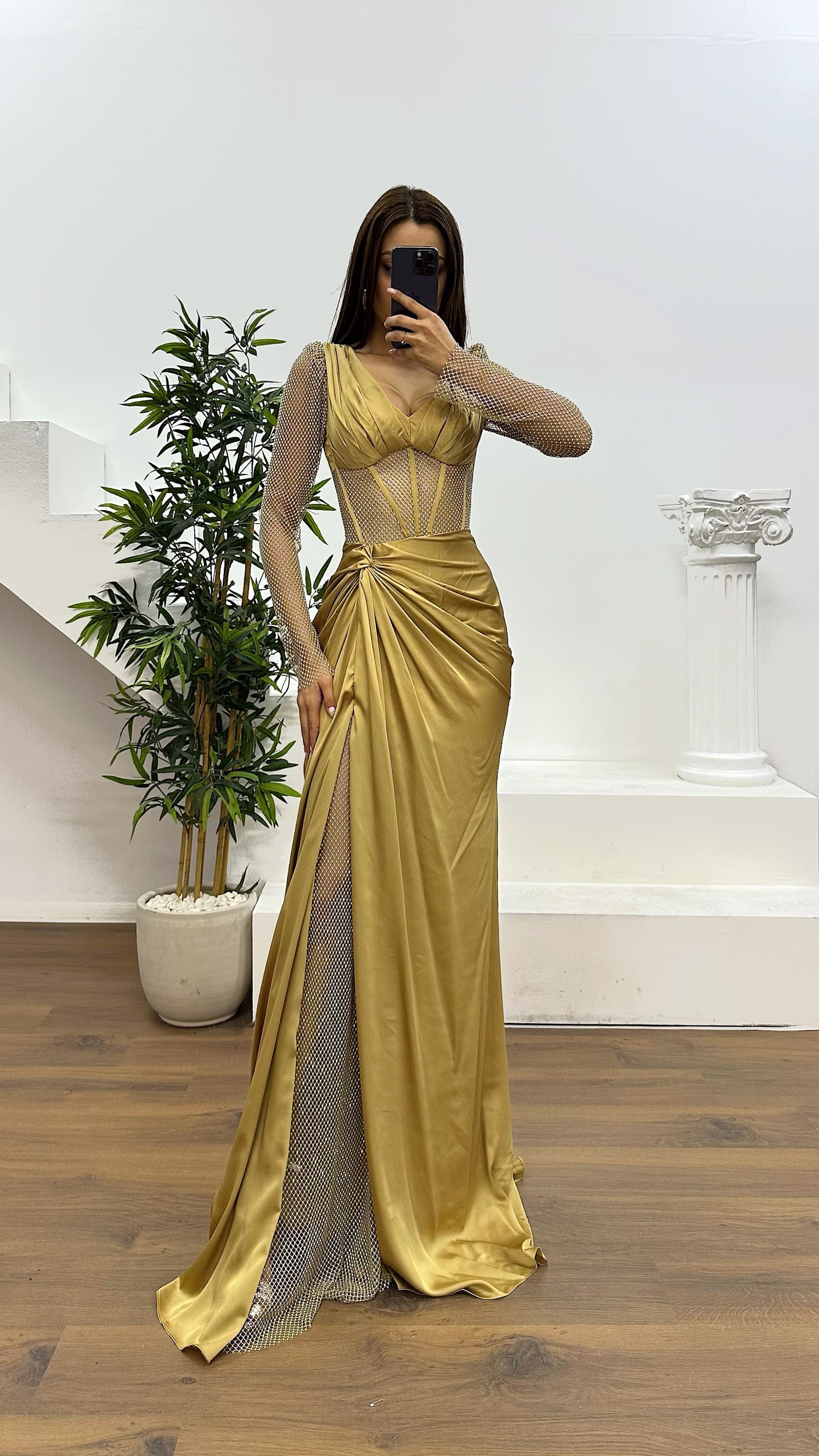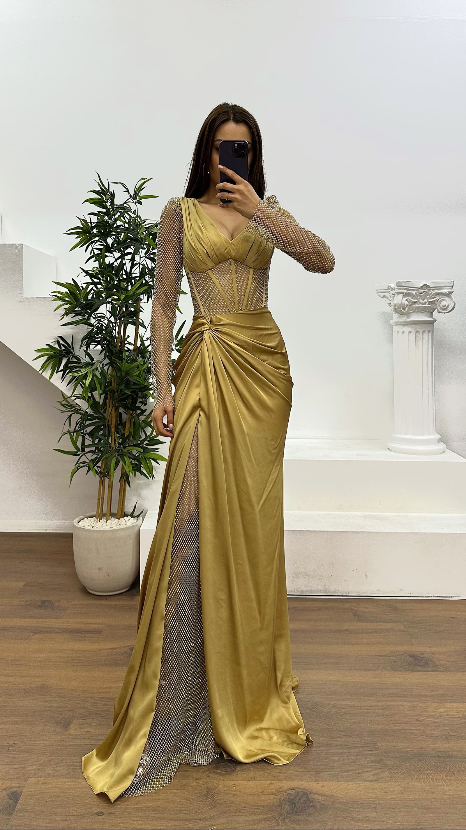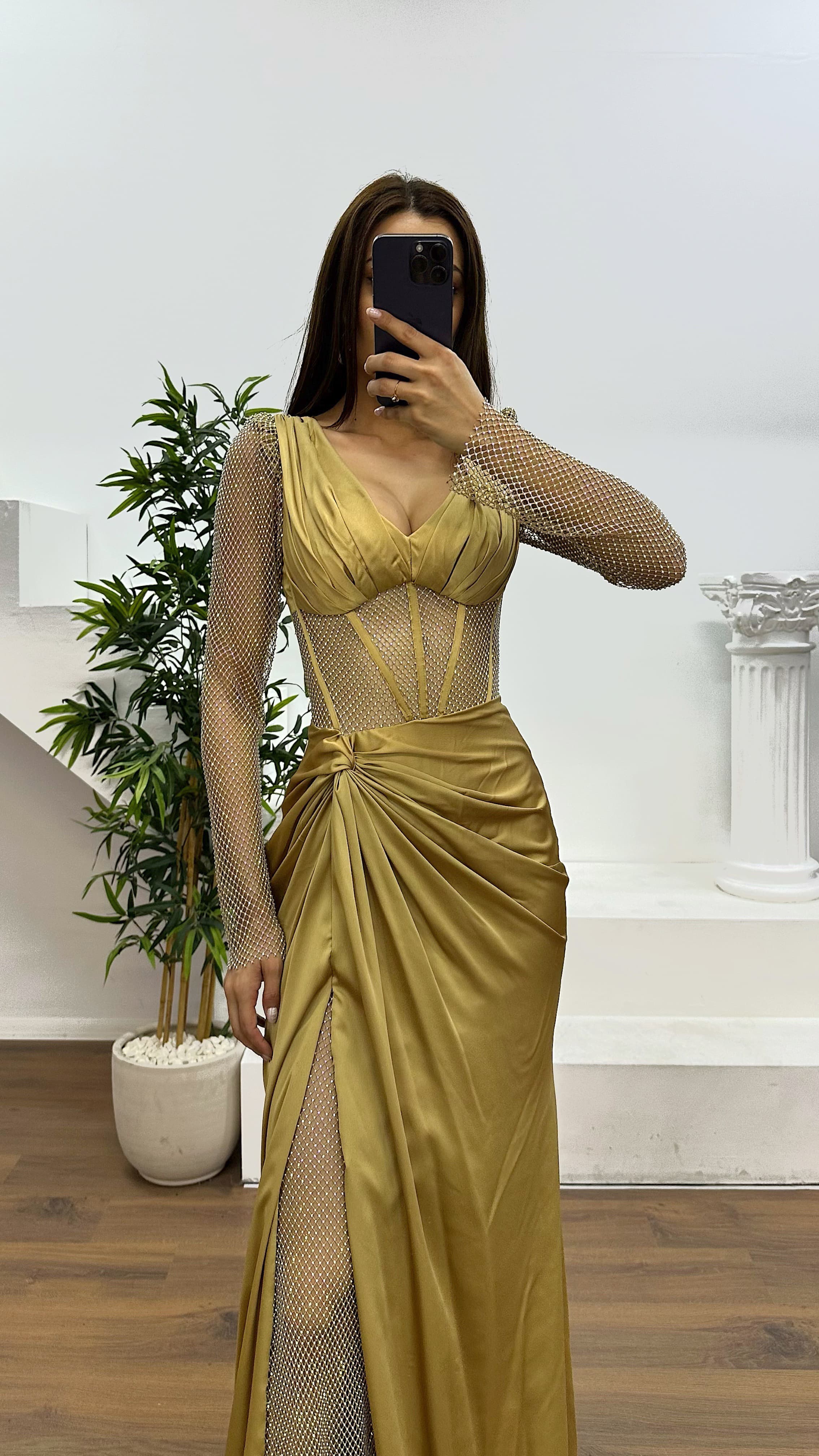 Abito da sera con dettagli in tulle Il prodotto è progettato come abito da sera con dettagli in tulle, adatto per taglie dalla 36 alla 44, con coppe al seno, foderato, chiusura con zip posteriore e spacco. Lunghezza del prodotto: Può variare tra 175-170 cm. Lunghezza manica: 60 cm. Tipo di tessuto: Raso di poliestere, viscosa.