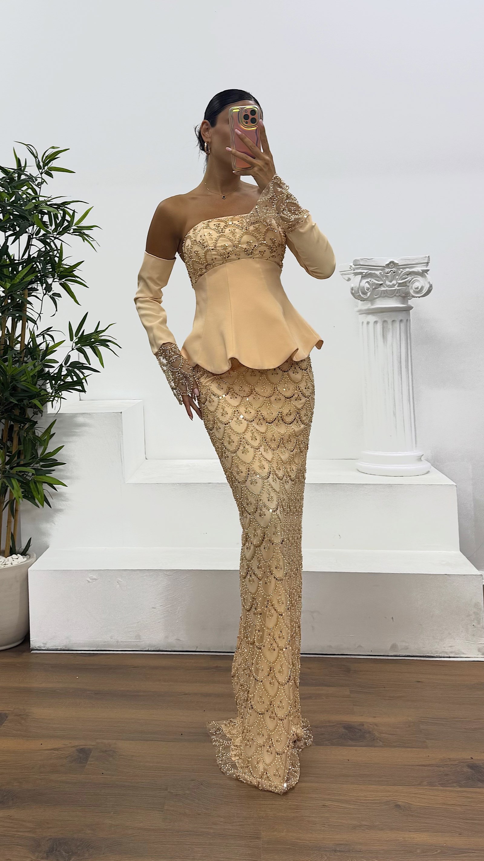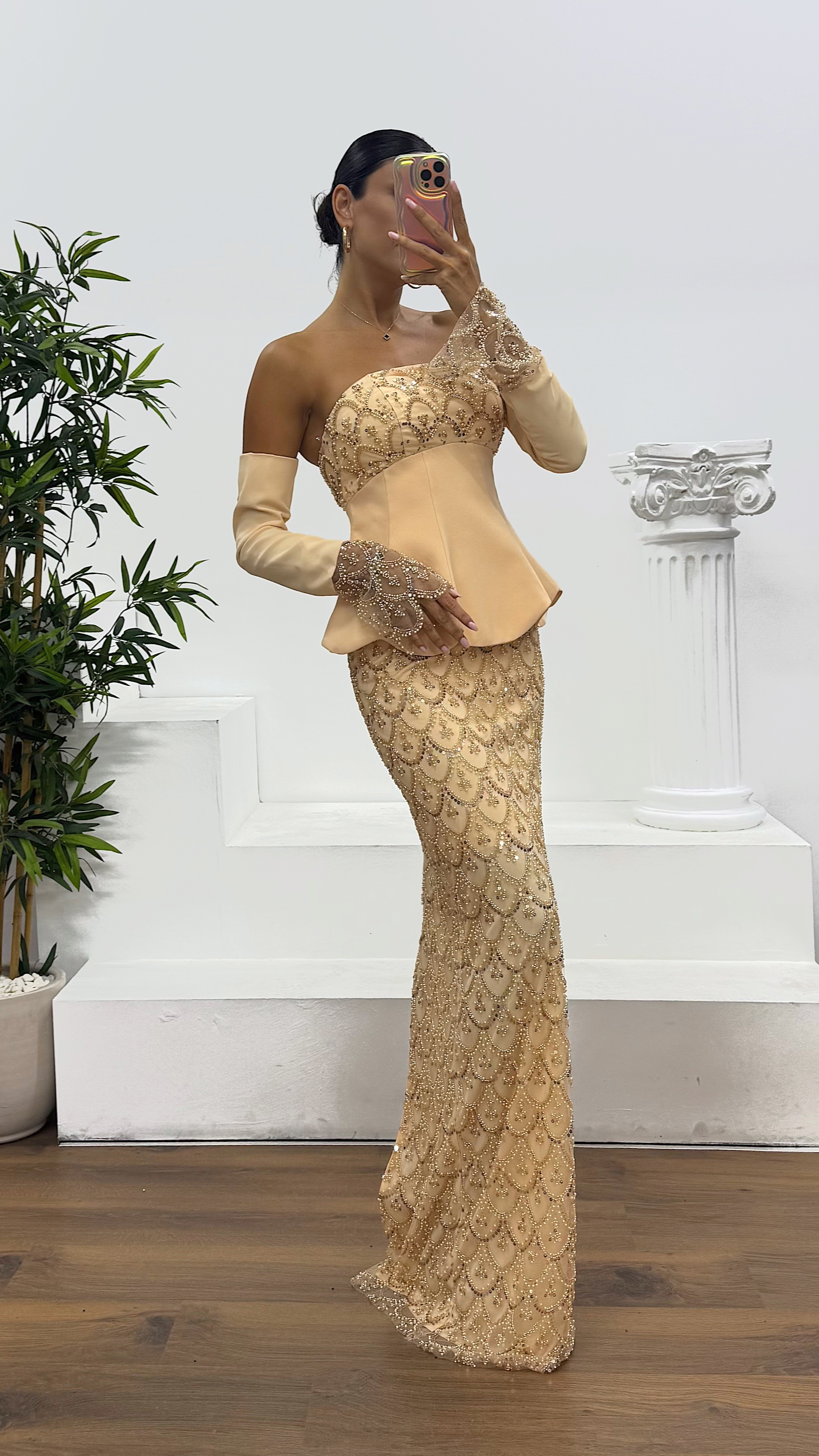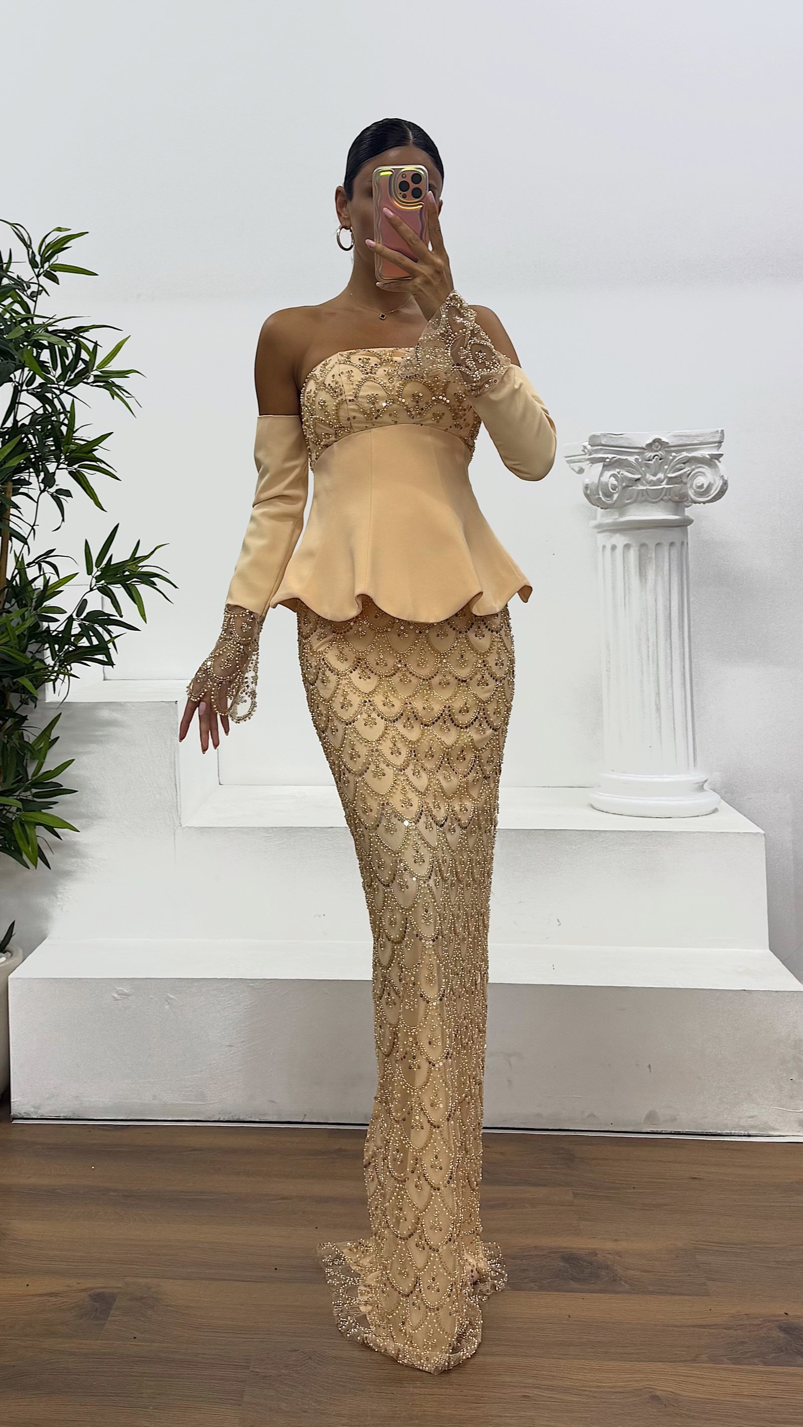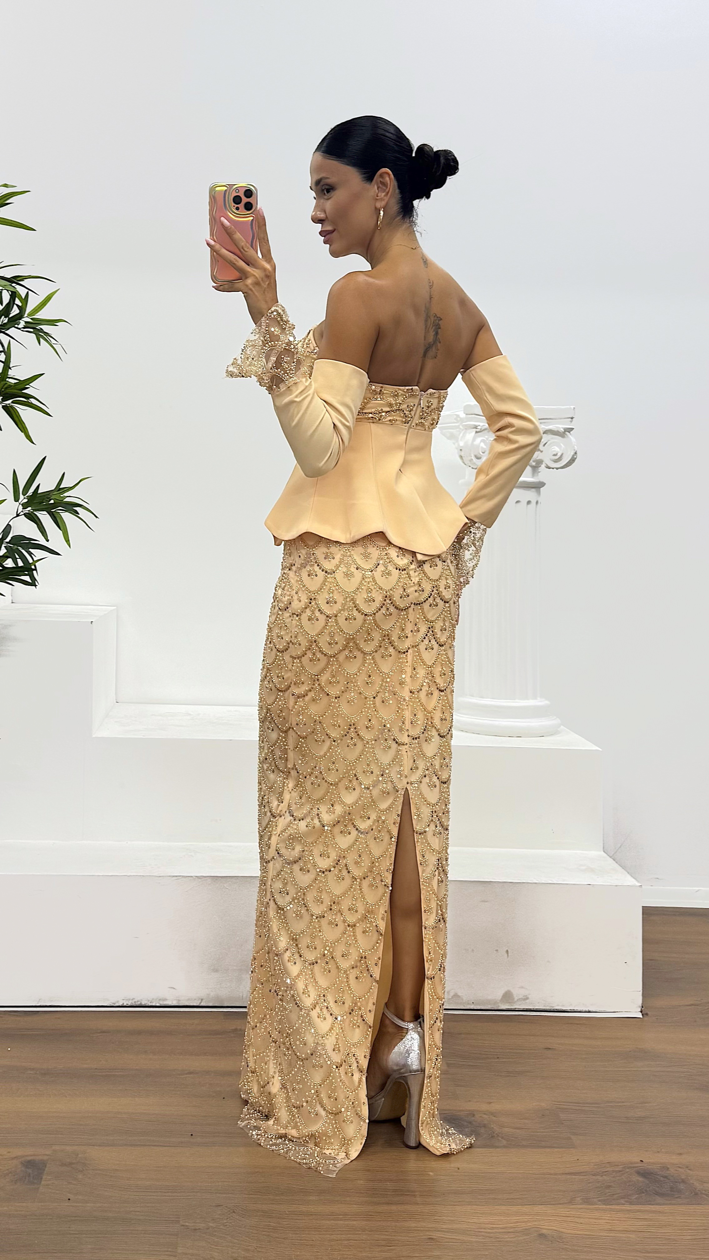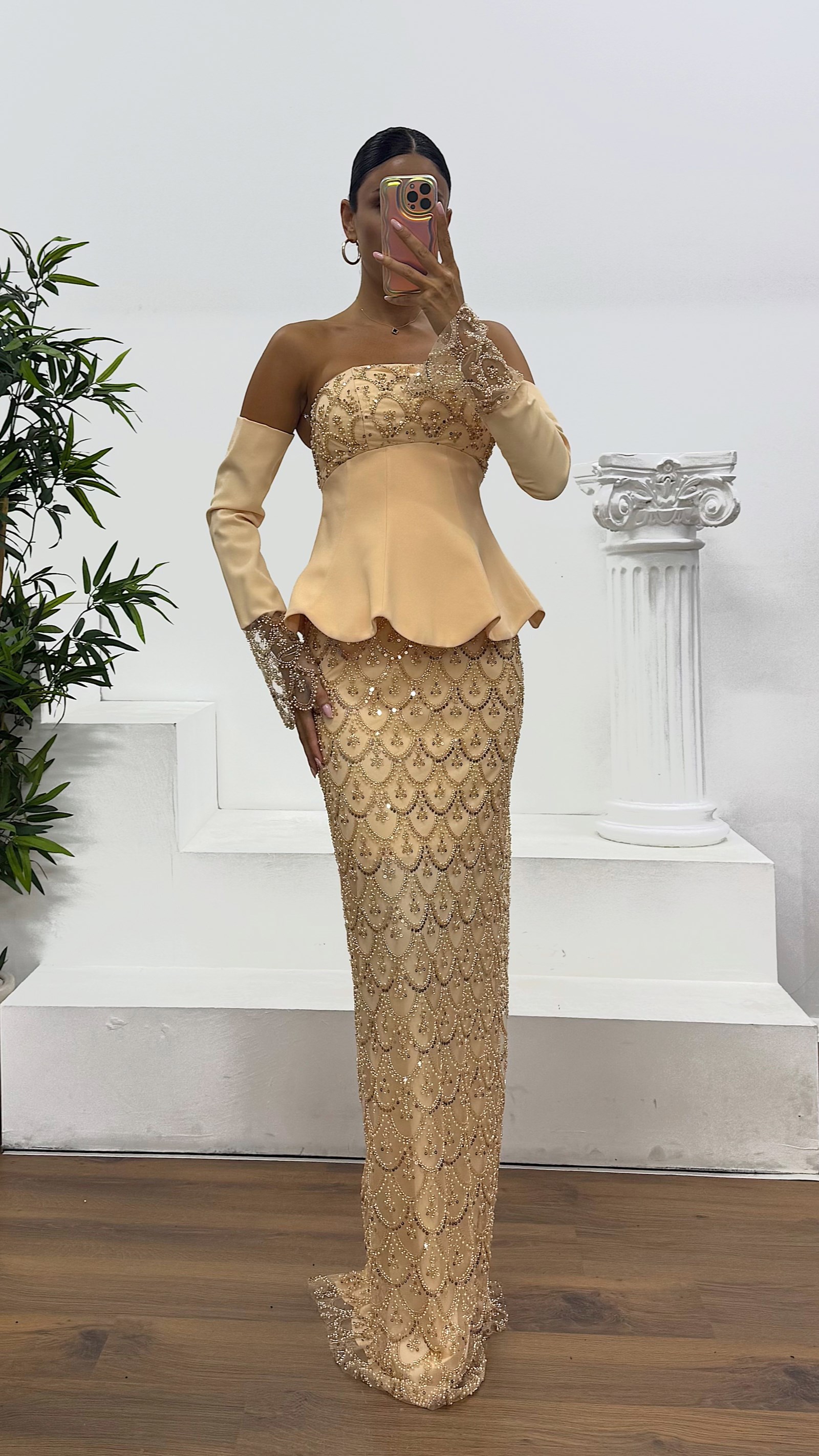 • Gold Straplez İşlemeli Eldivenli Abiye Elbise