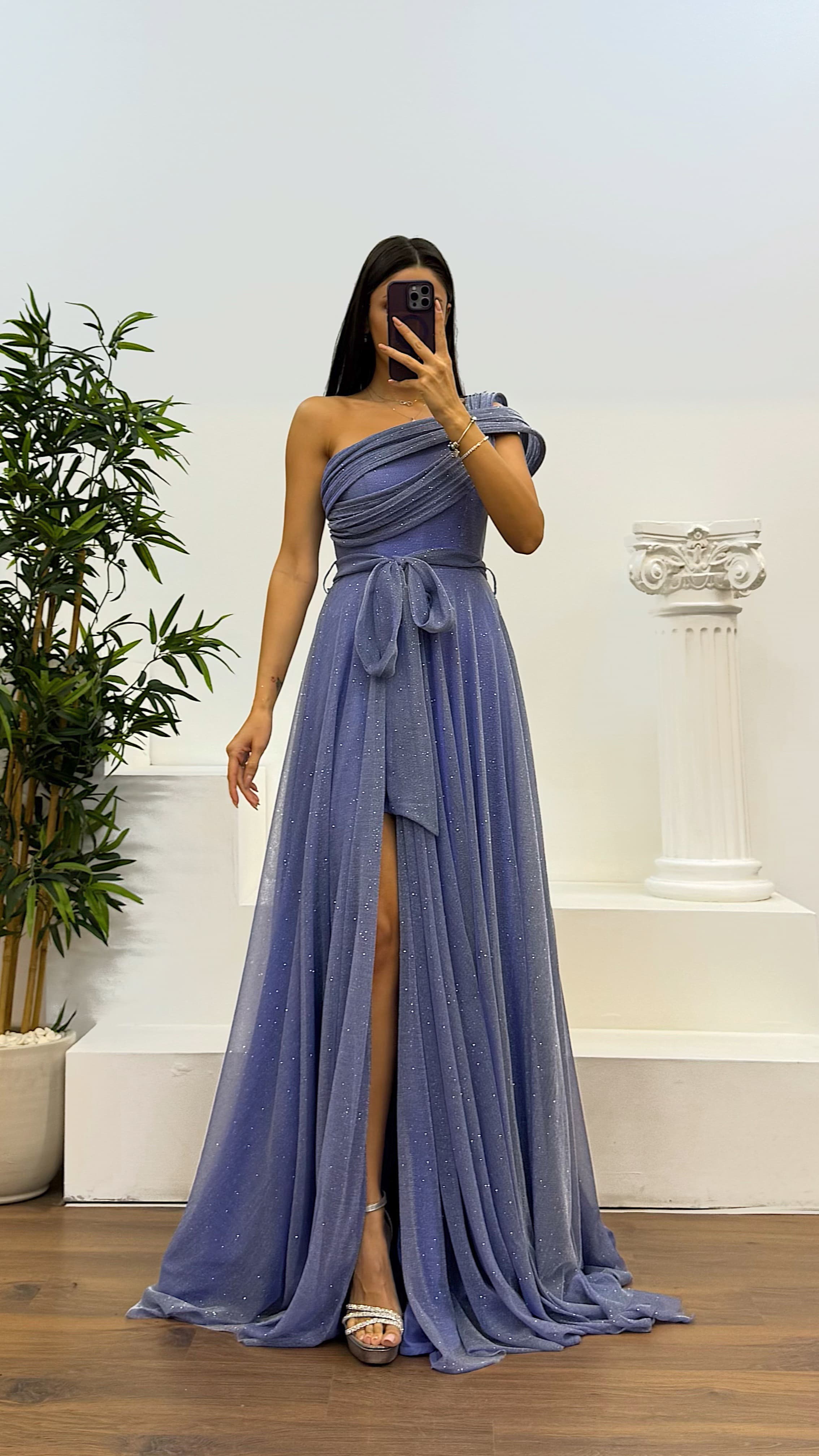 • İndigo Tek Omuz Simli Kabarık Abiye Elbise