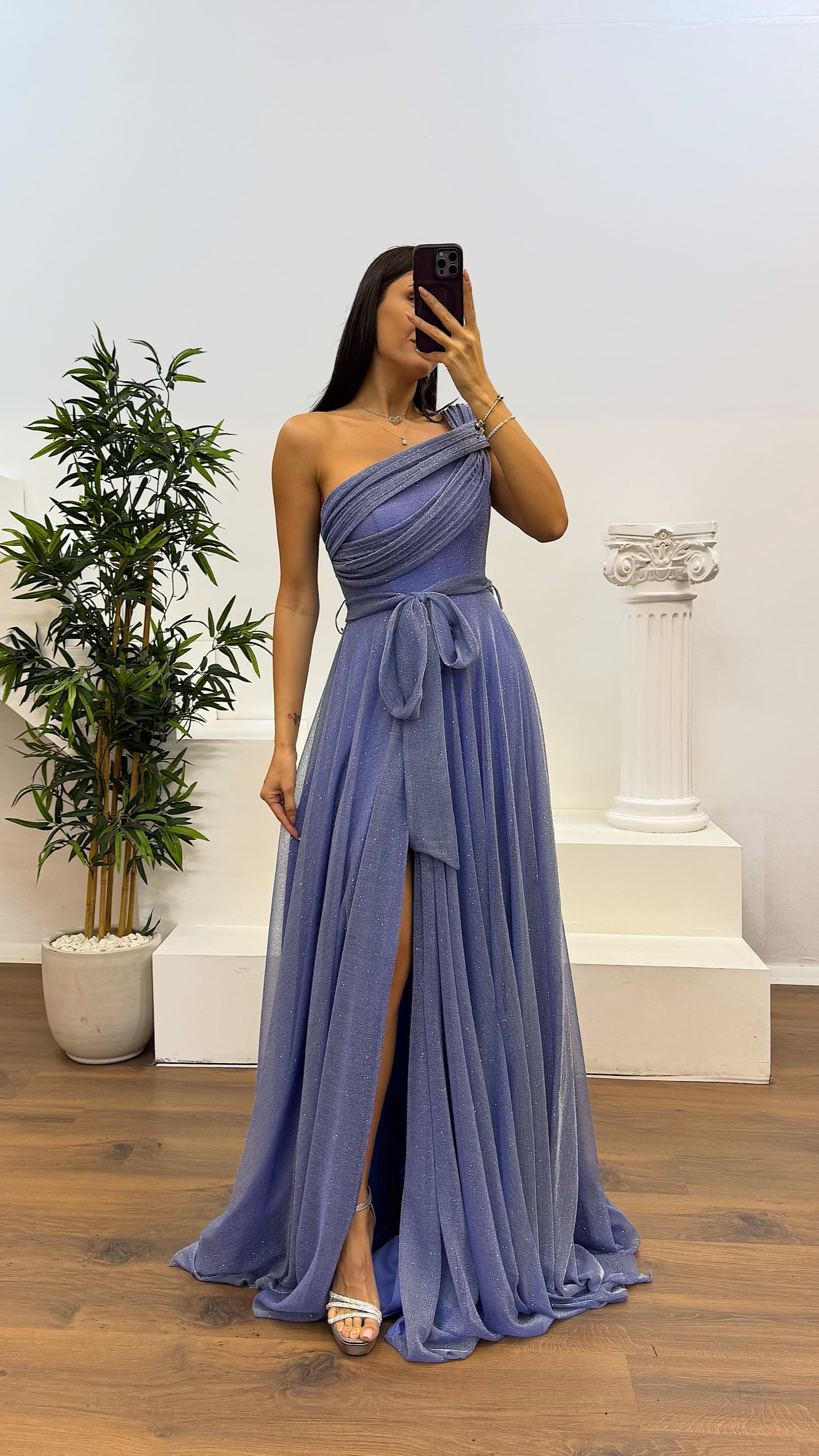 Abito da sera soffice e scintillante con una spalla indaco