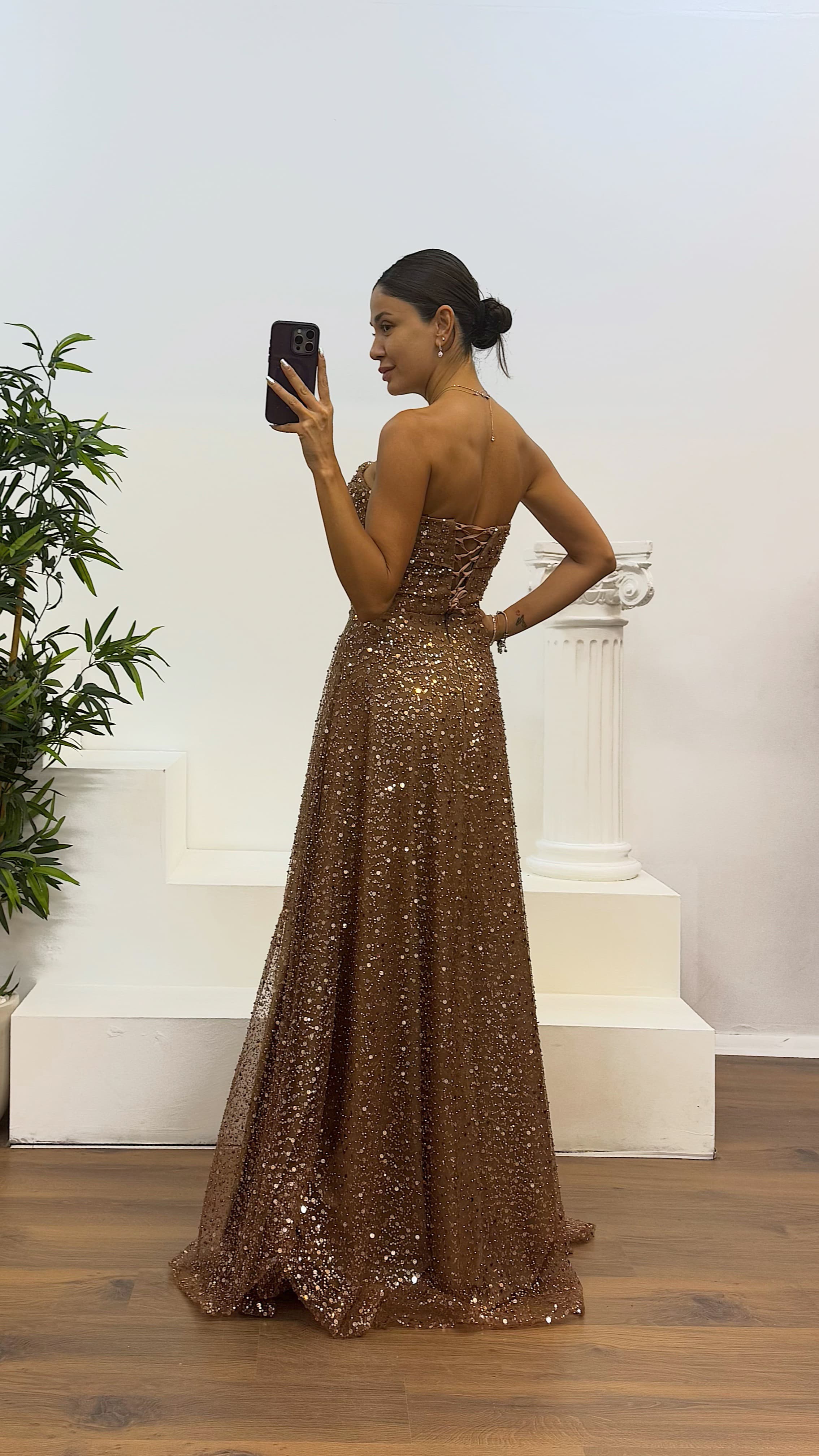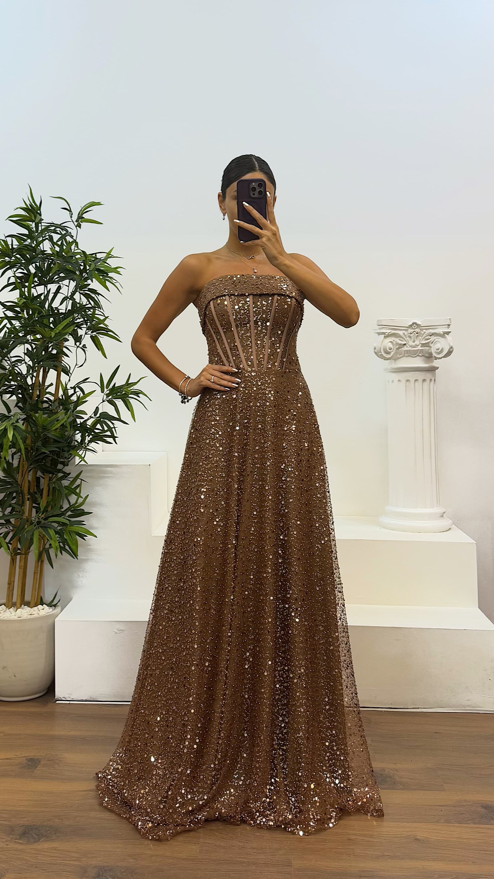 • Yeşil Straplez Boncuklu Abiye Elbise