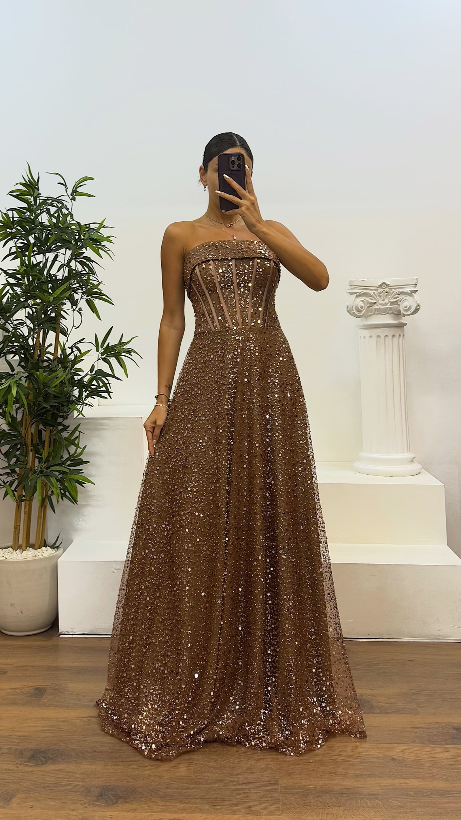 Abito da sera senza spalline con perline Il prodotto è progettato per adattarsi alle taglie dalla 36 alla 42, con imbottitura per il seno, foderato, con spalline incrociate e chiusura con cerniera sul retro, decorato con perline. Lunghezza del prodotto: 160 cm. Tipo di tessuto: tulle 3% lycra, 97% poliestere