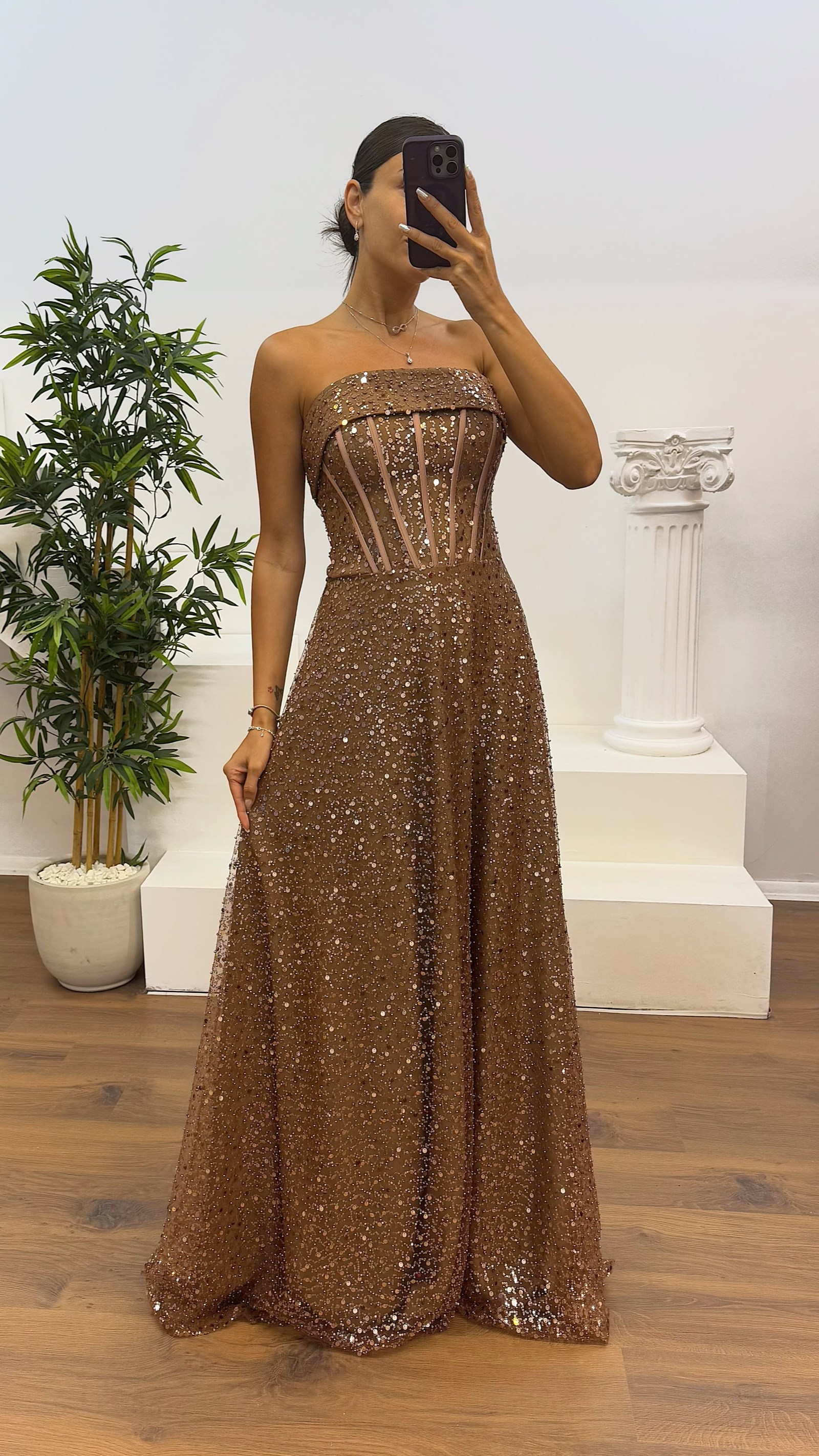 • Fuşya Straplez Boncuklu Abiye Elbise