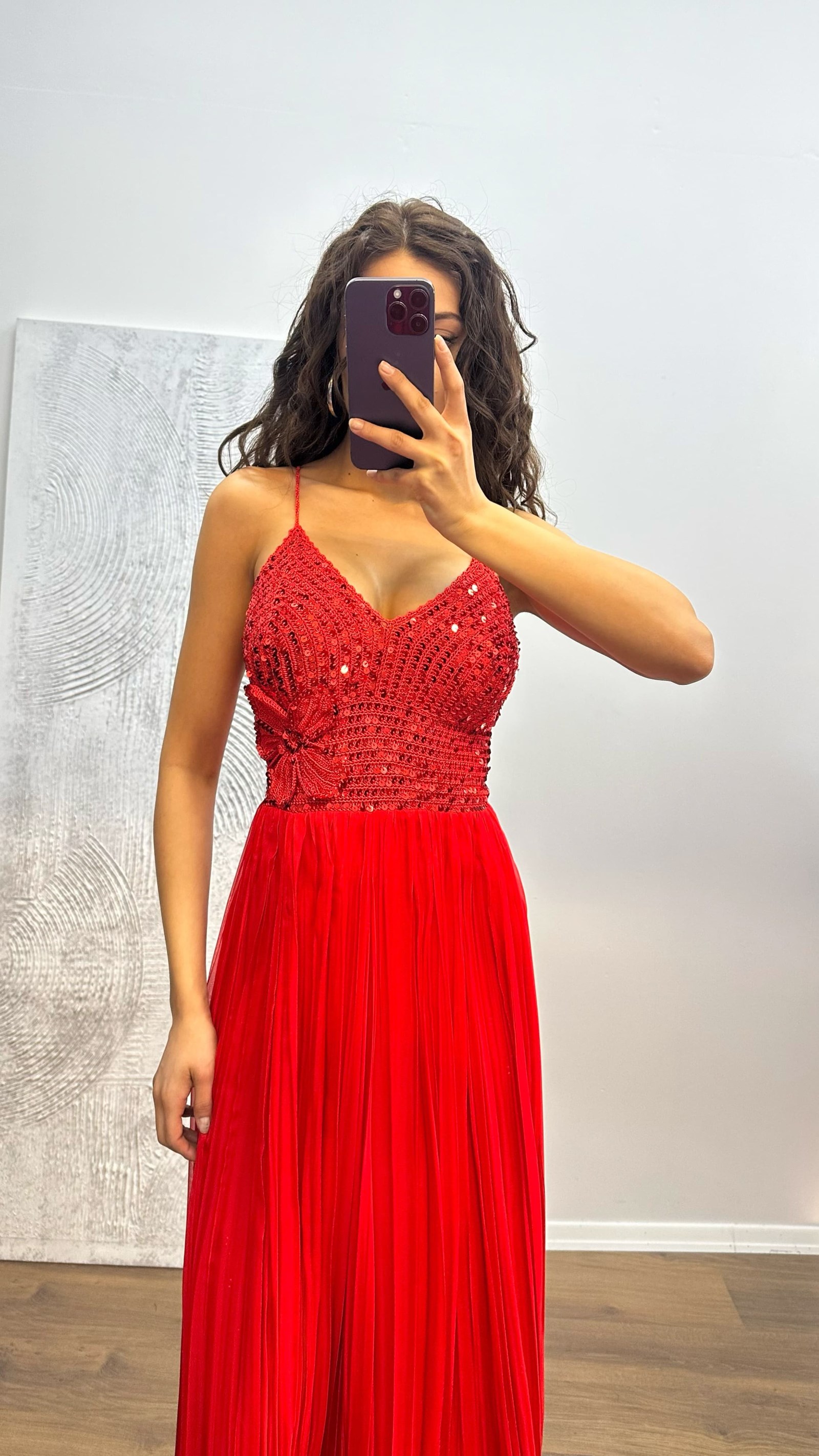 • Kırmızı İp Askılı Örgü Şifon Abiye Elbise
