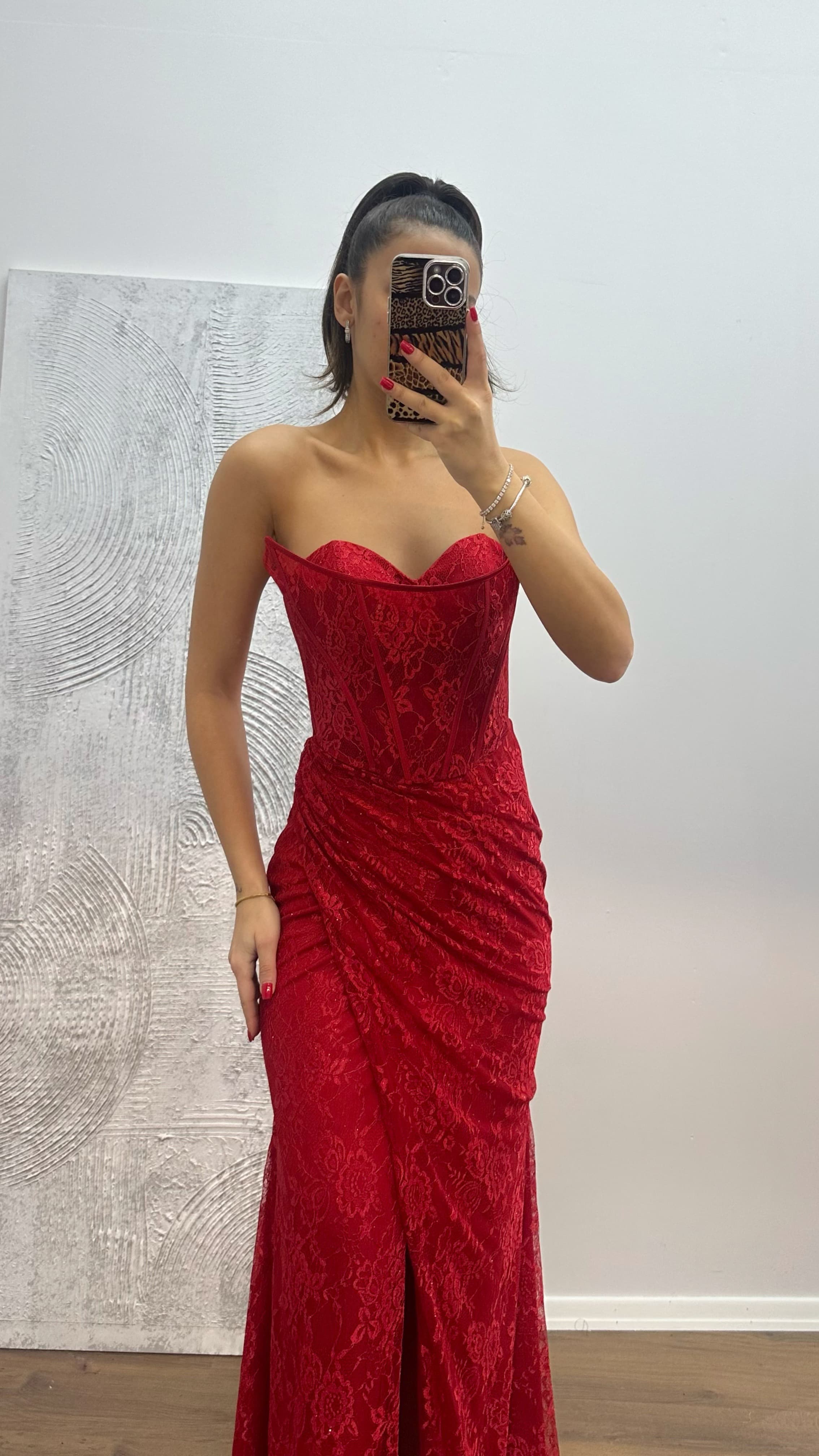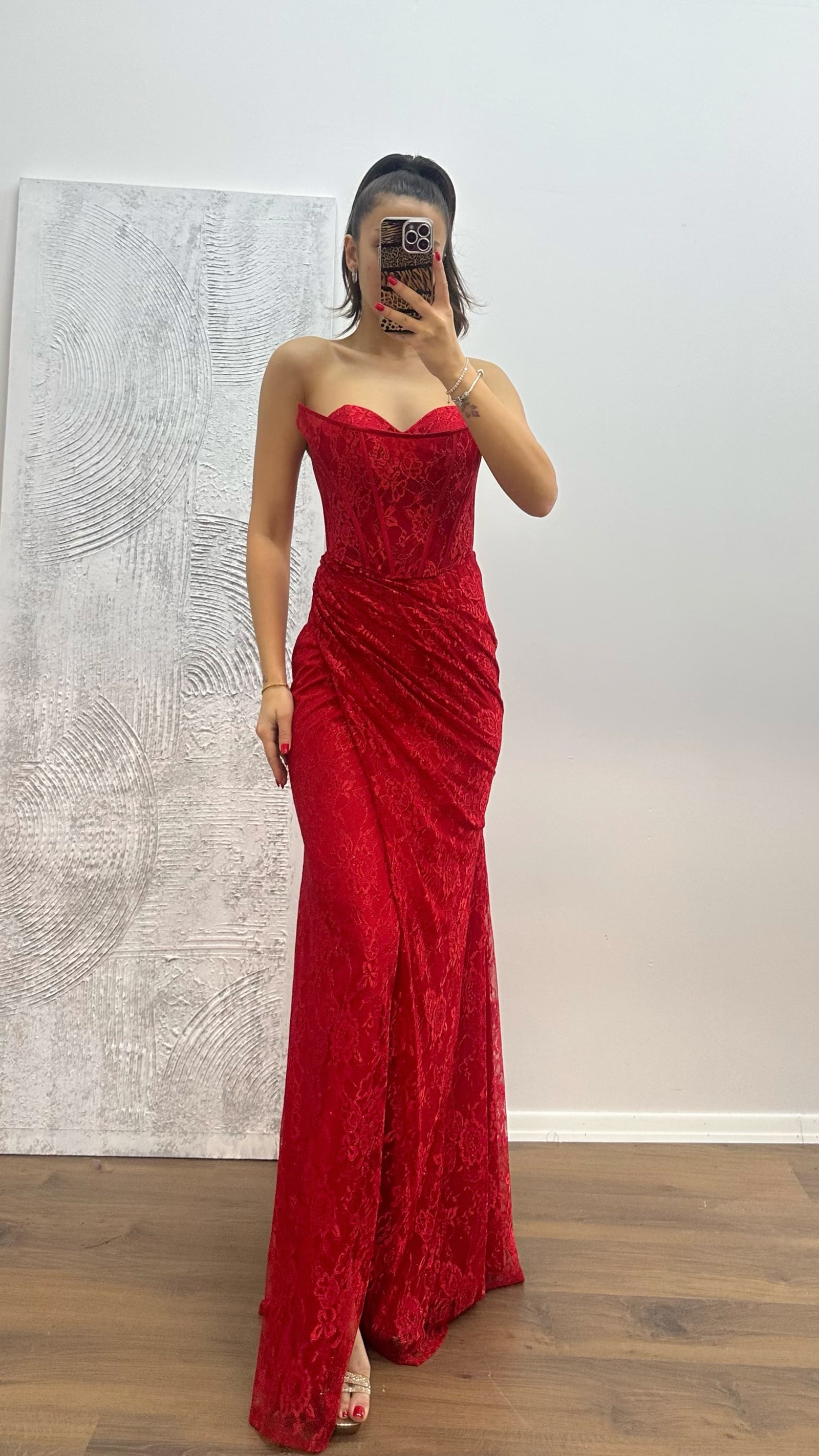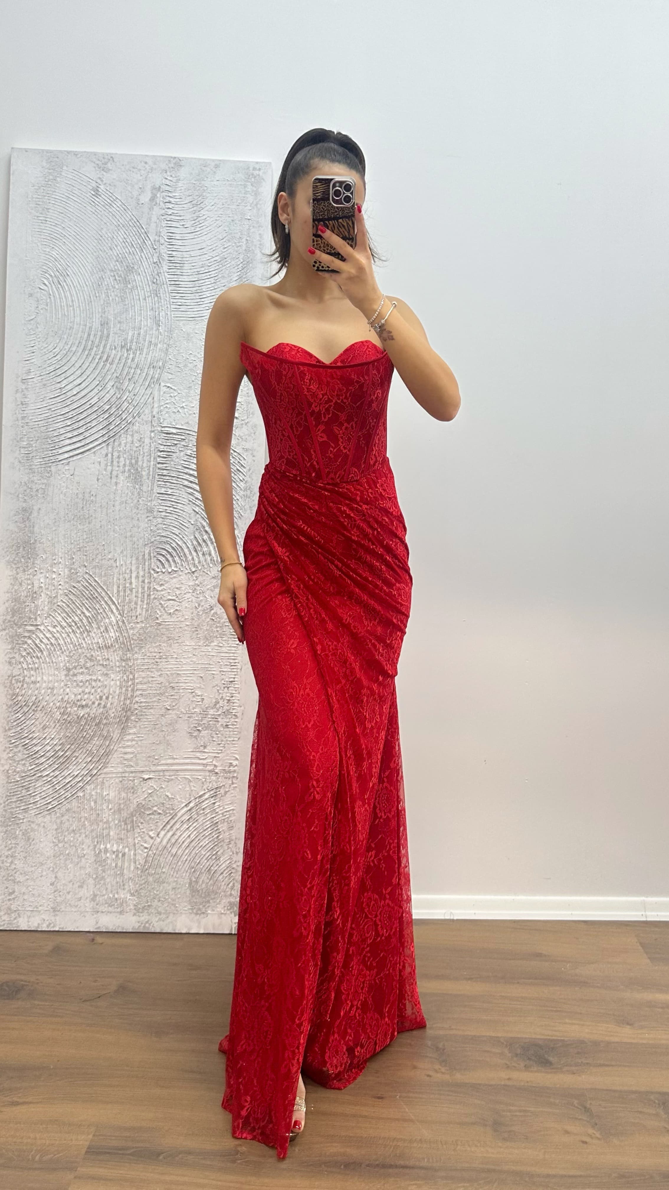 Abito da sera in pizzo senza spalline Il prodotto è adatto per le taglie dalla 36 alla 42, con coppe imbottite, foderato, spacco laterale, chiusura con lacci incrociati sul retro e cerniera. Lunghezza dell'abito: 170-175 cm. Tipo di tessuto: pizzo.