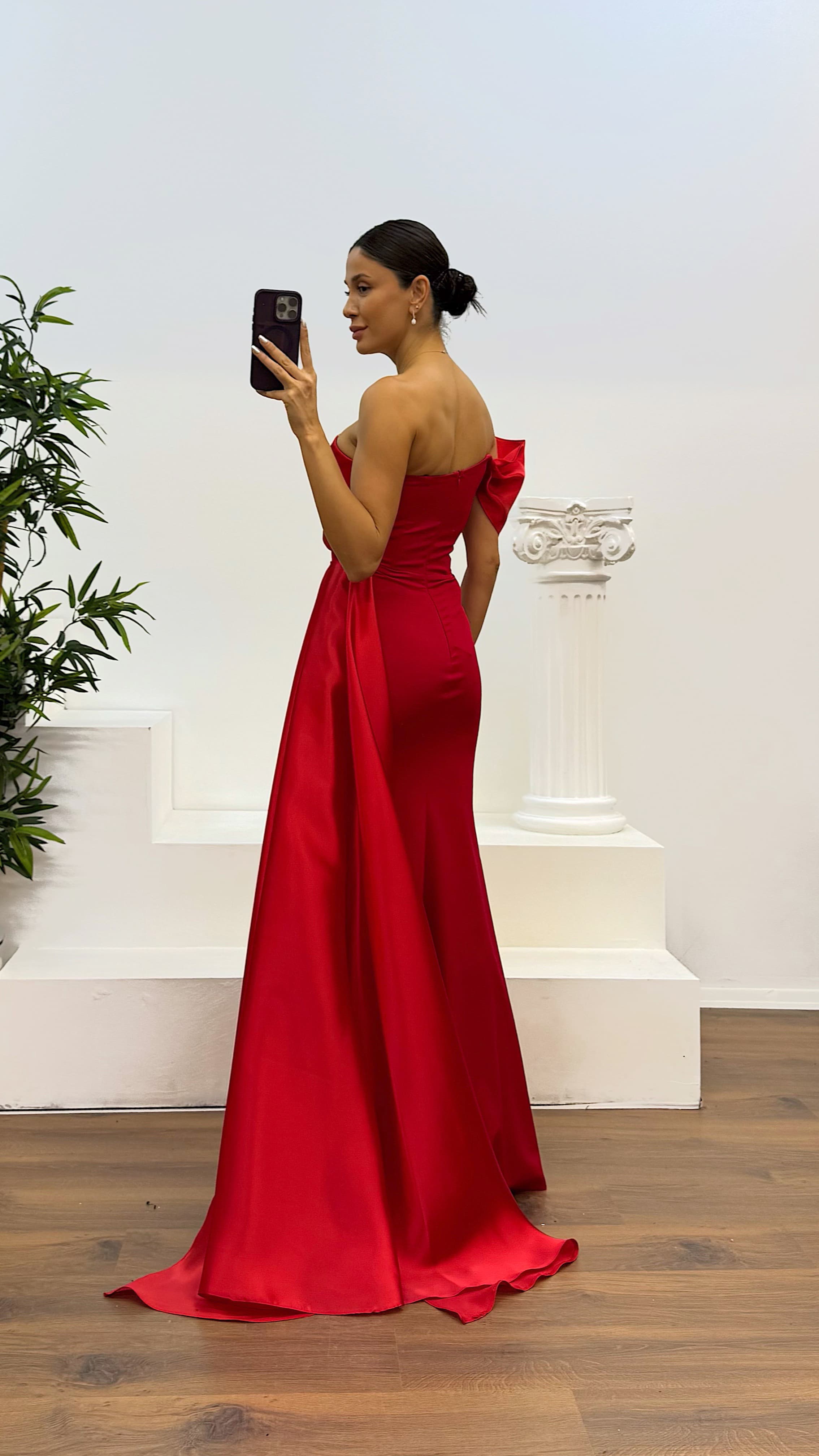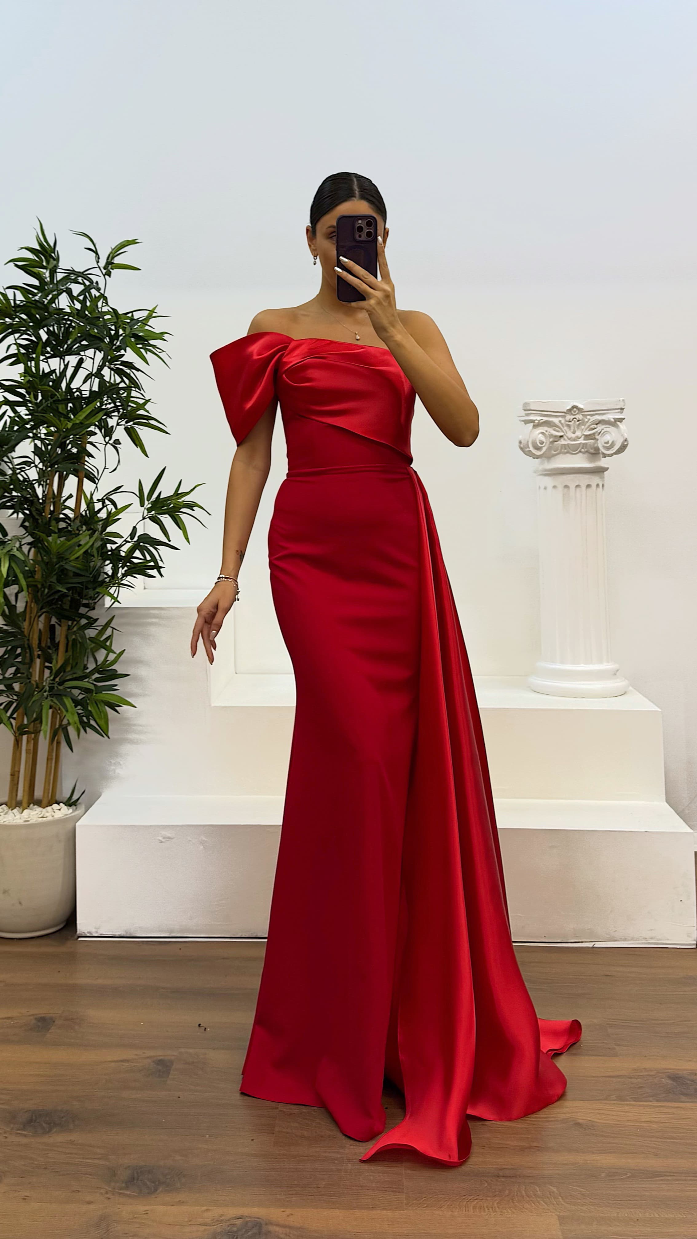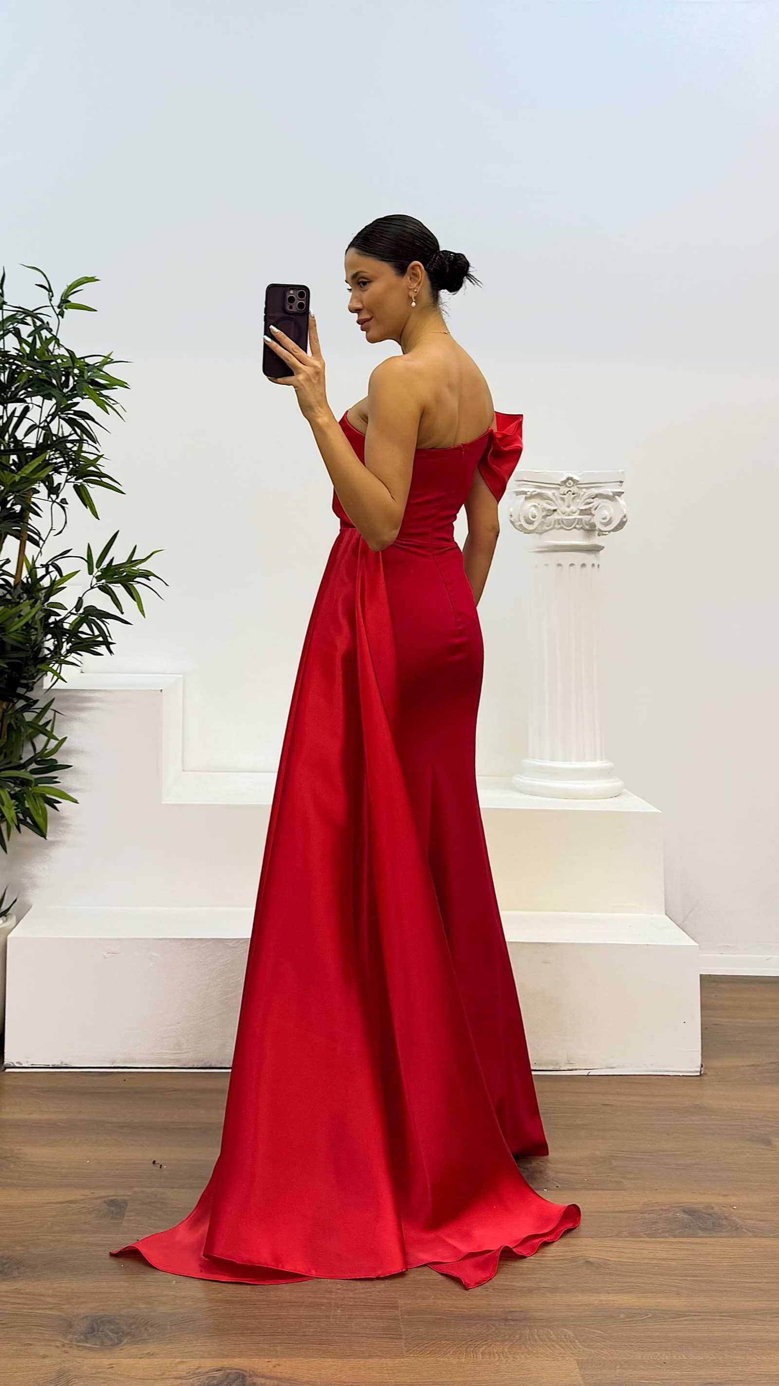 Abito da sera con dettaglio in satin su una spalla Il prodotto è compatibile con le taglie dalla 36 alla 42, con imbottitura nel busto, foderato, con chiusura a zip sul retro, e progettato come un abito da sera a una spalla. Lunghezza del prodotto: può variare tra 170 e 175 cm. Tipo di tessuto: Atlas 100% poliestere - satin poliestere, viscosa.