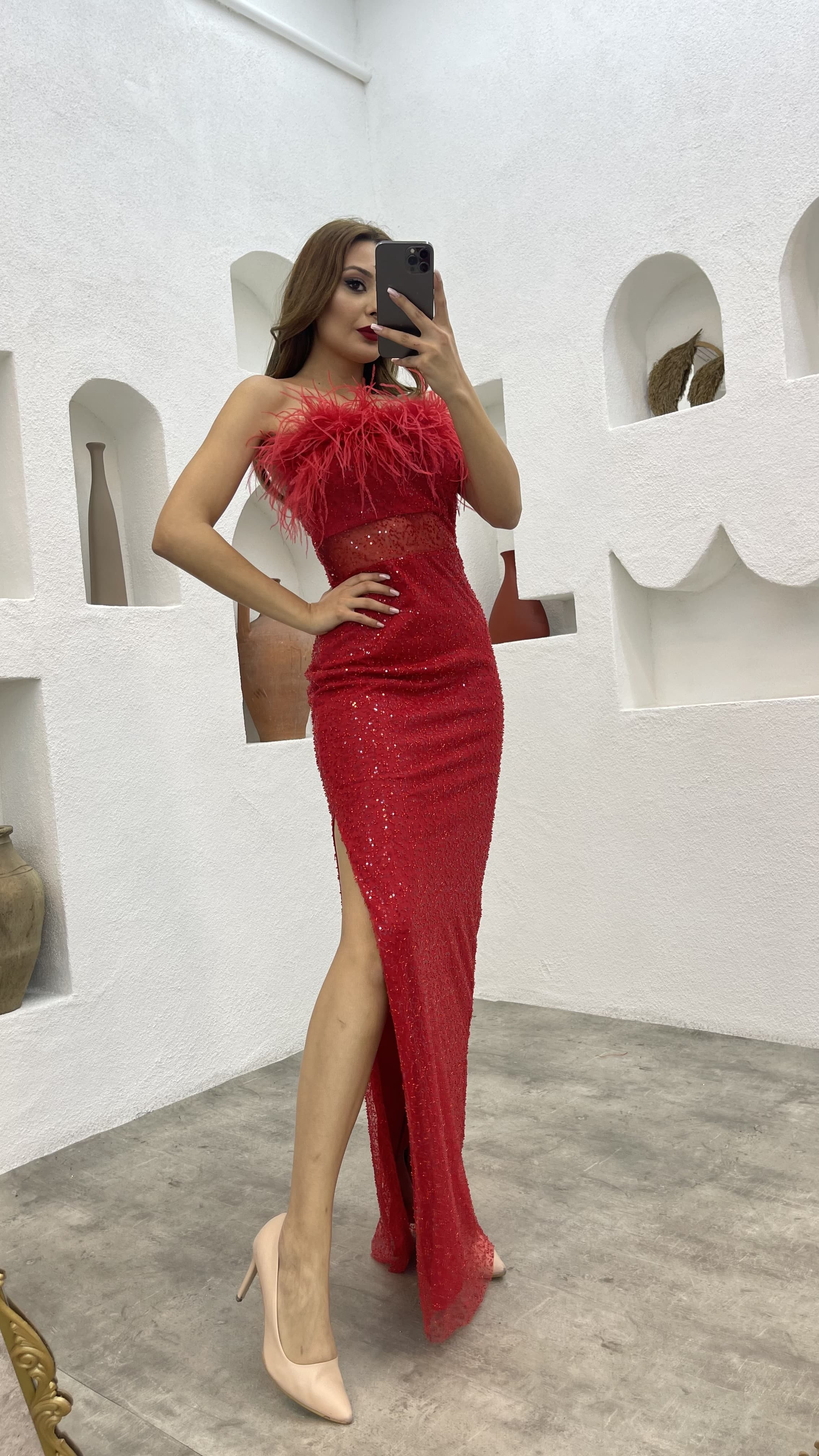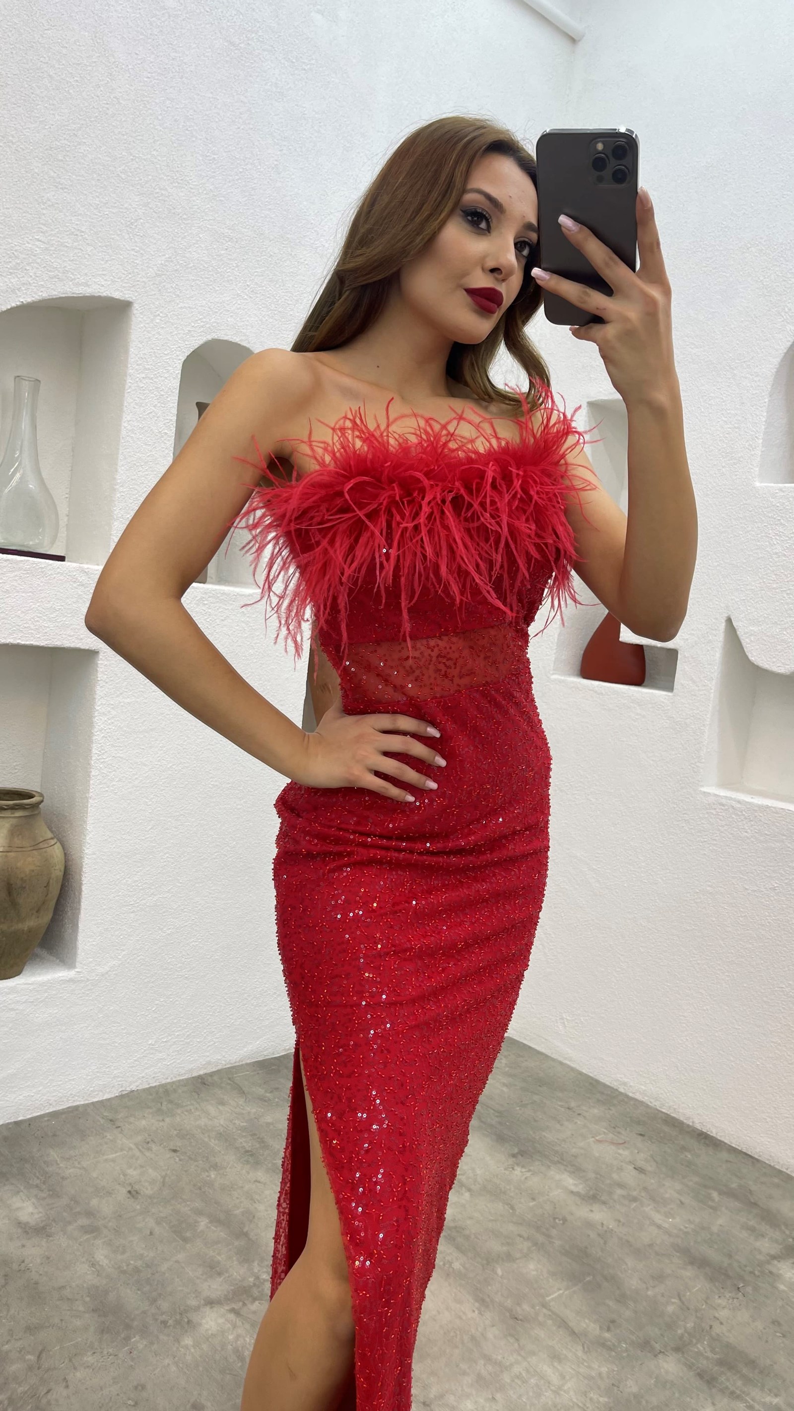 • Kırmızı Tüylü Transparan Detay Abiye Elbise