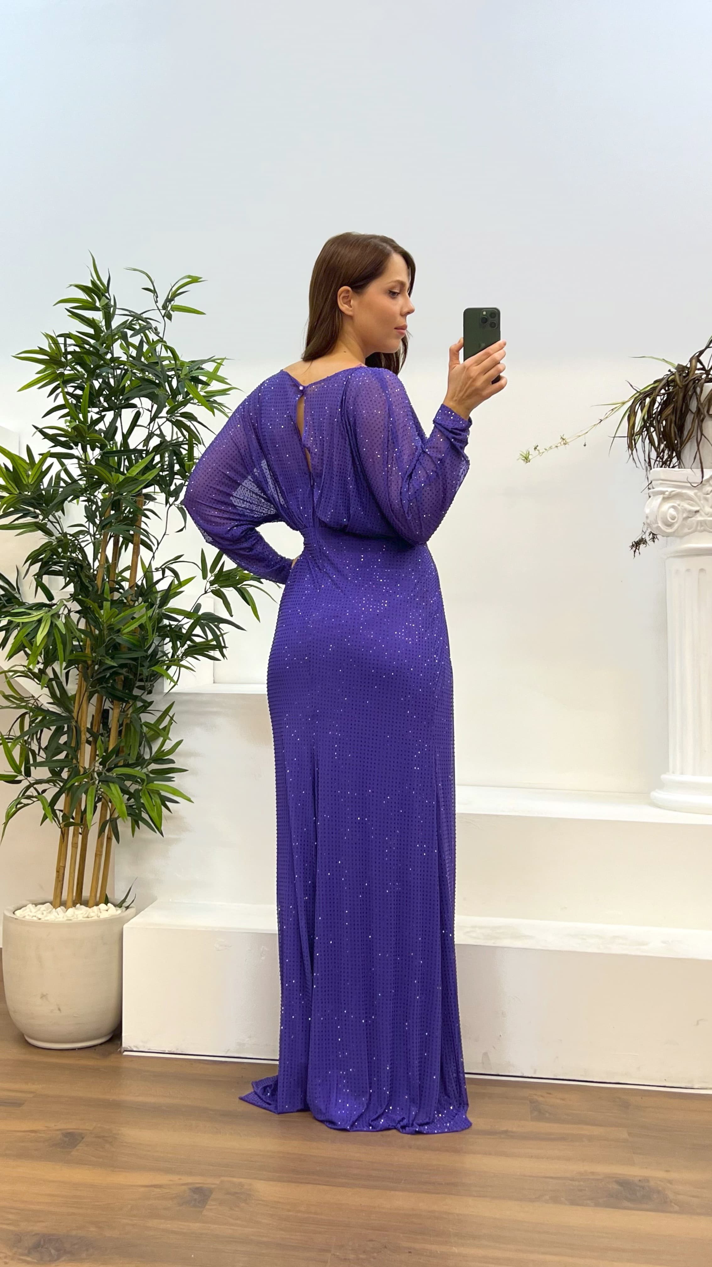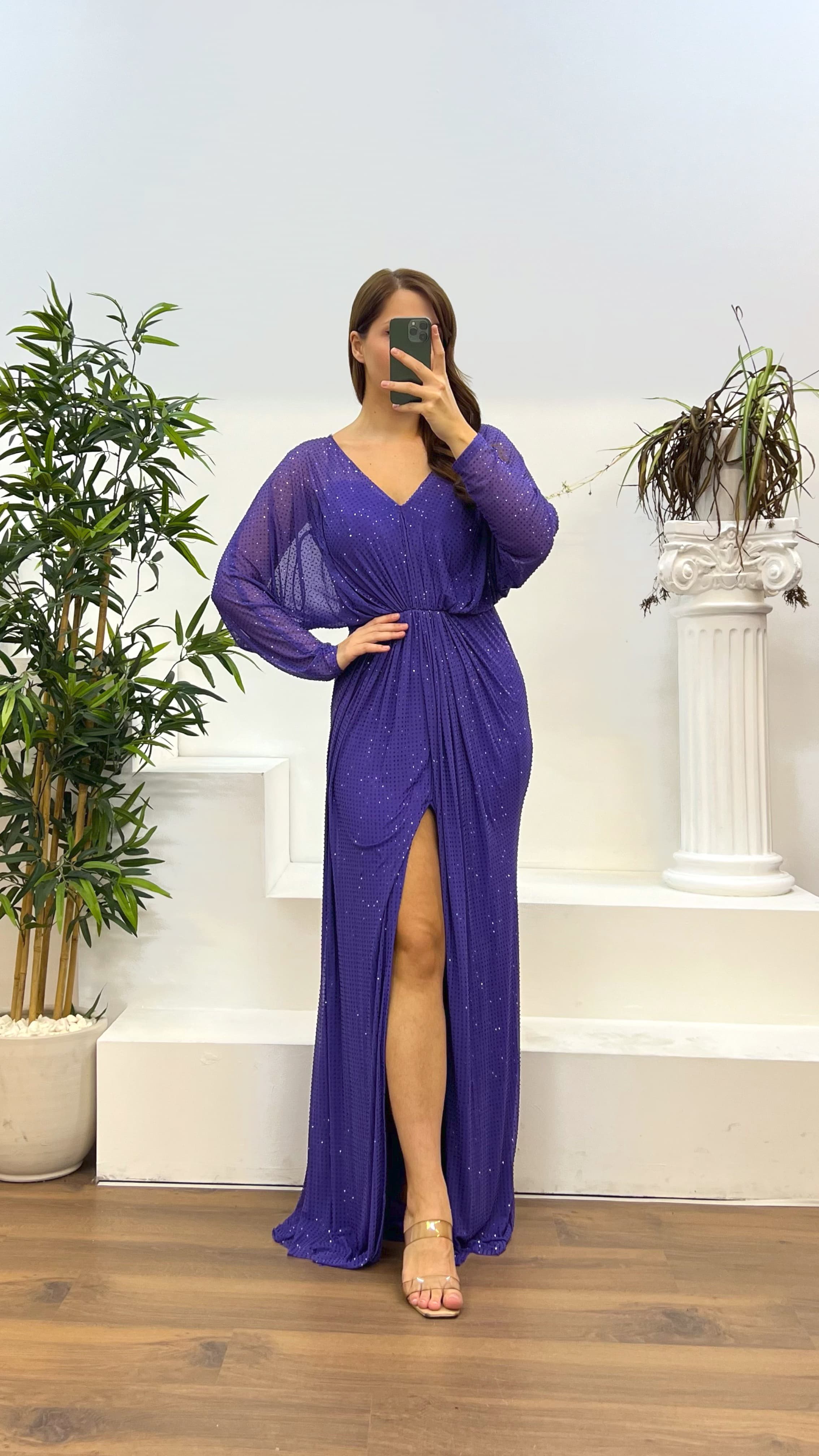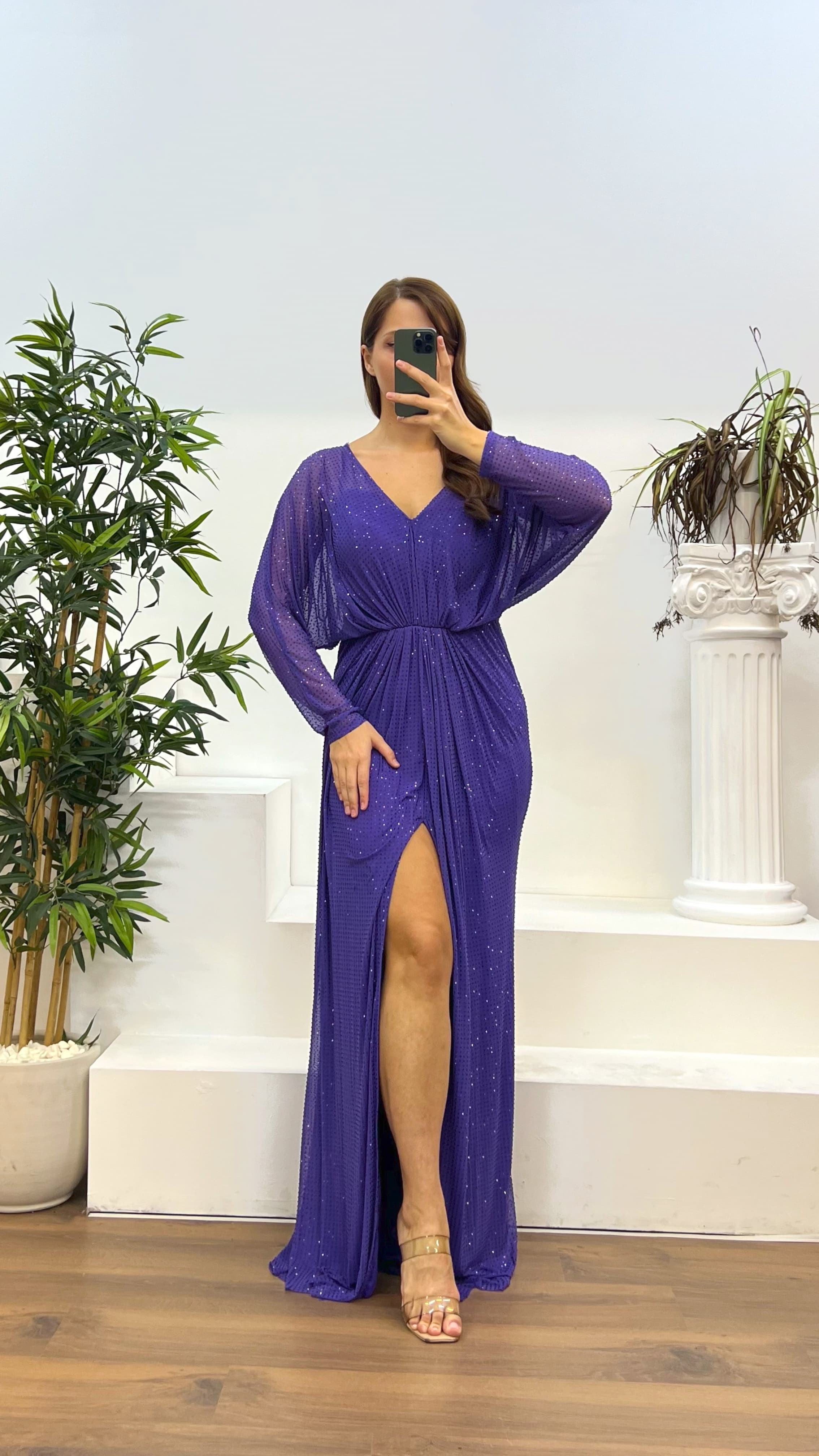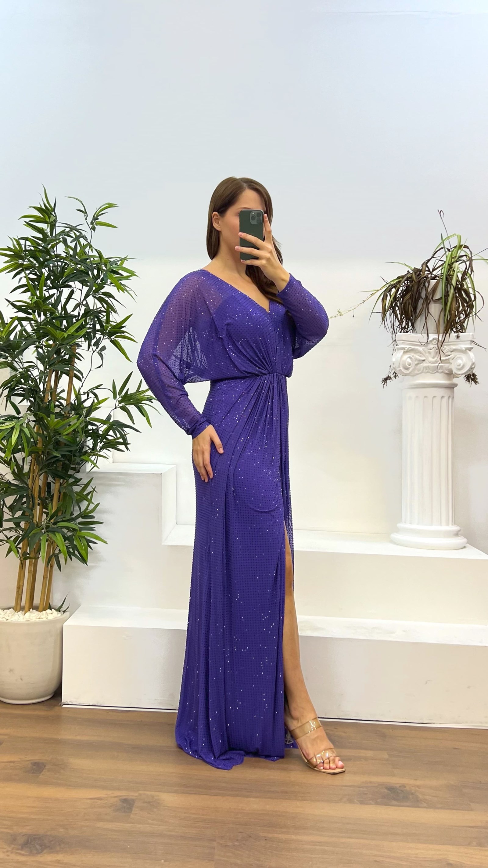 • Koyu Lila V Yaka Transparan Büyük Beden Abiye Elbise