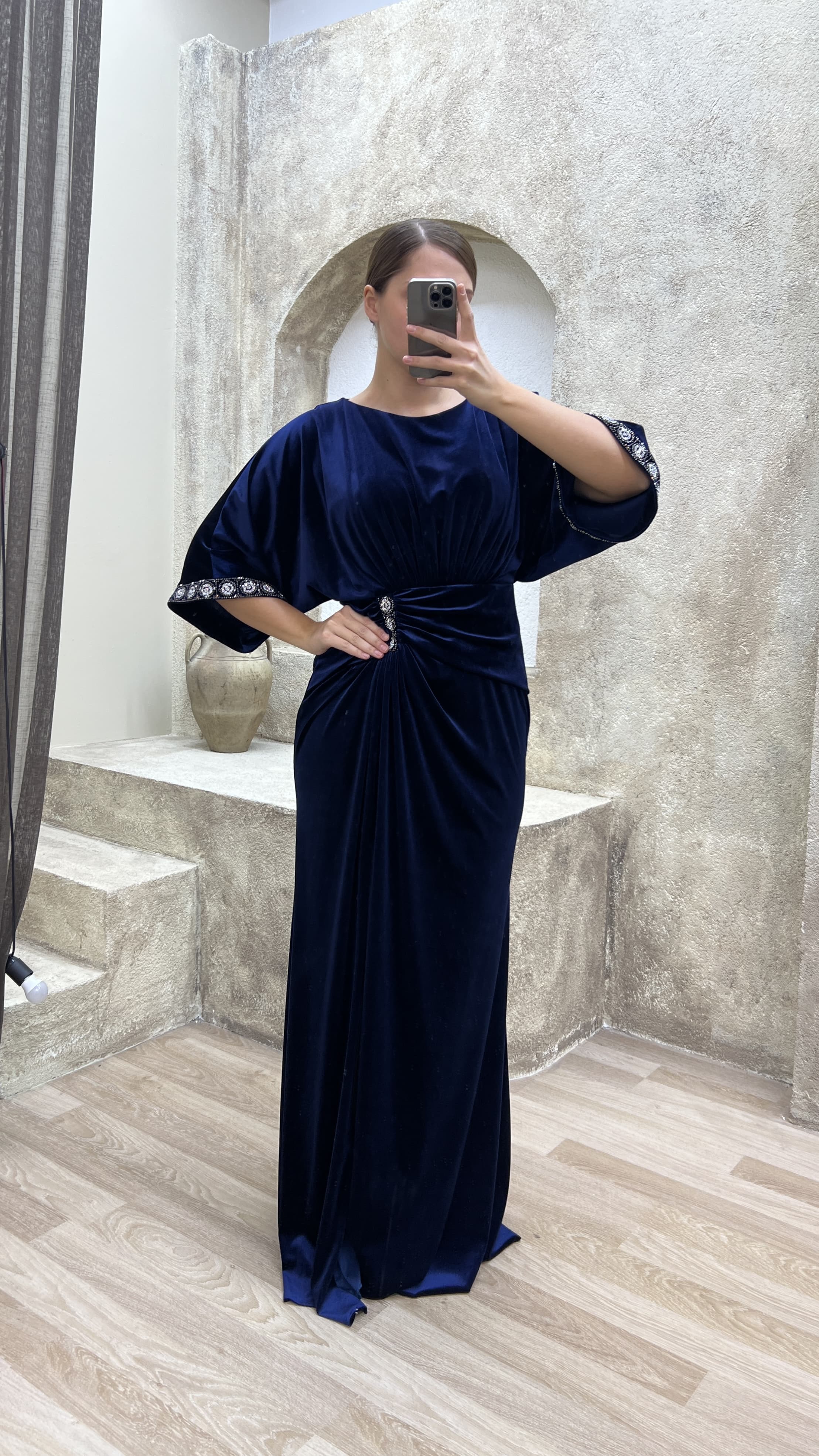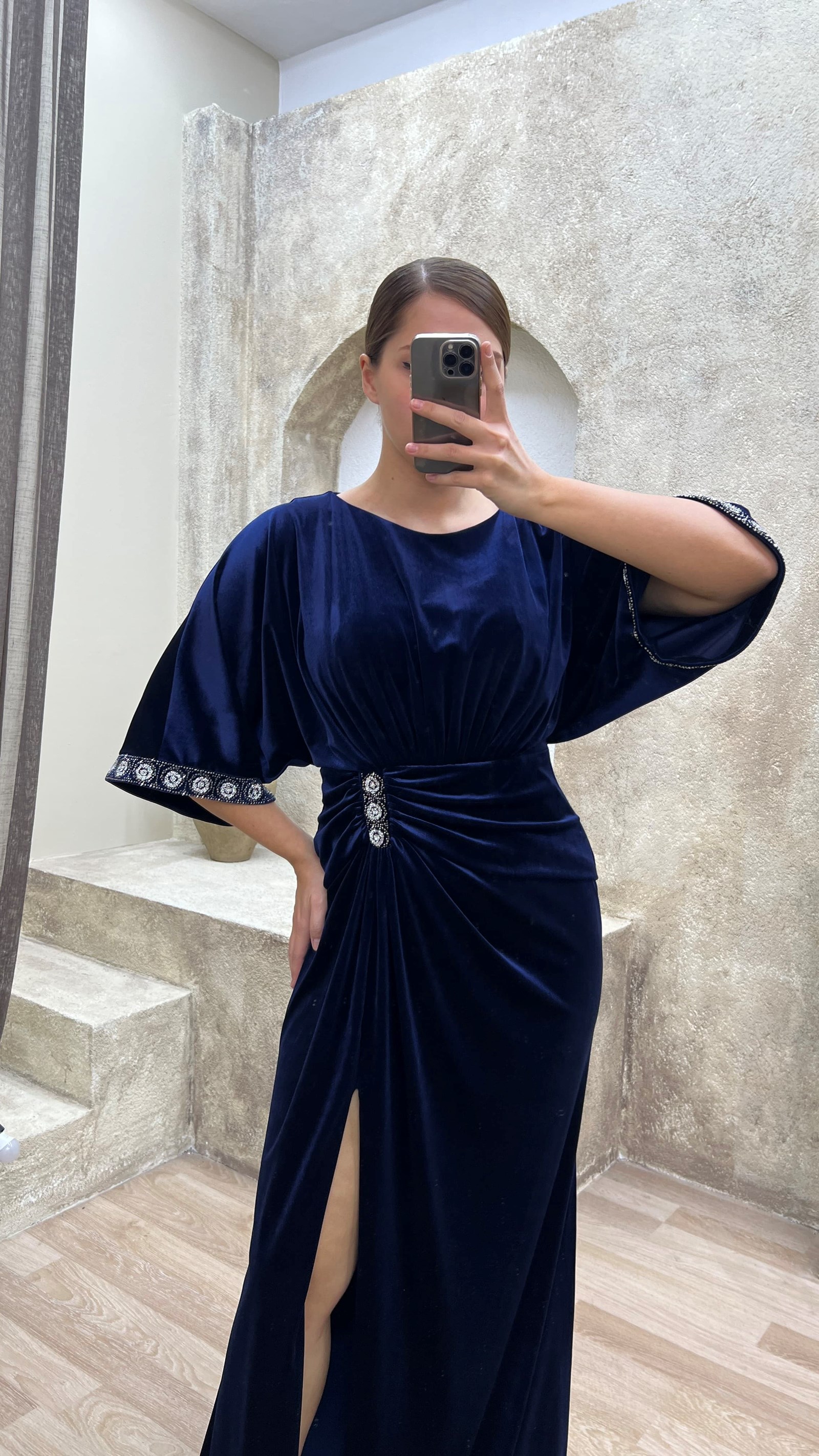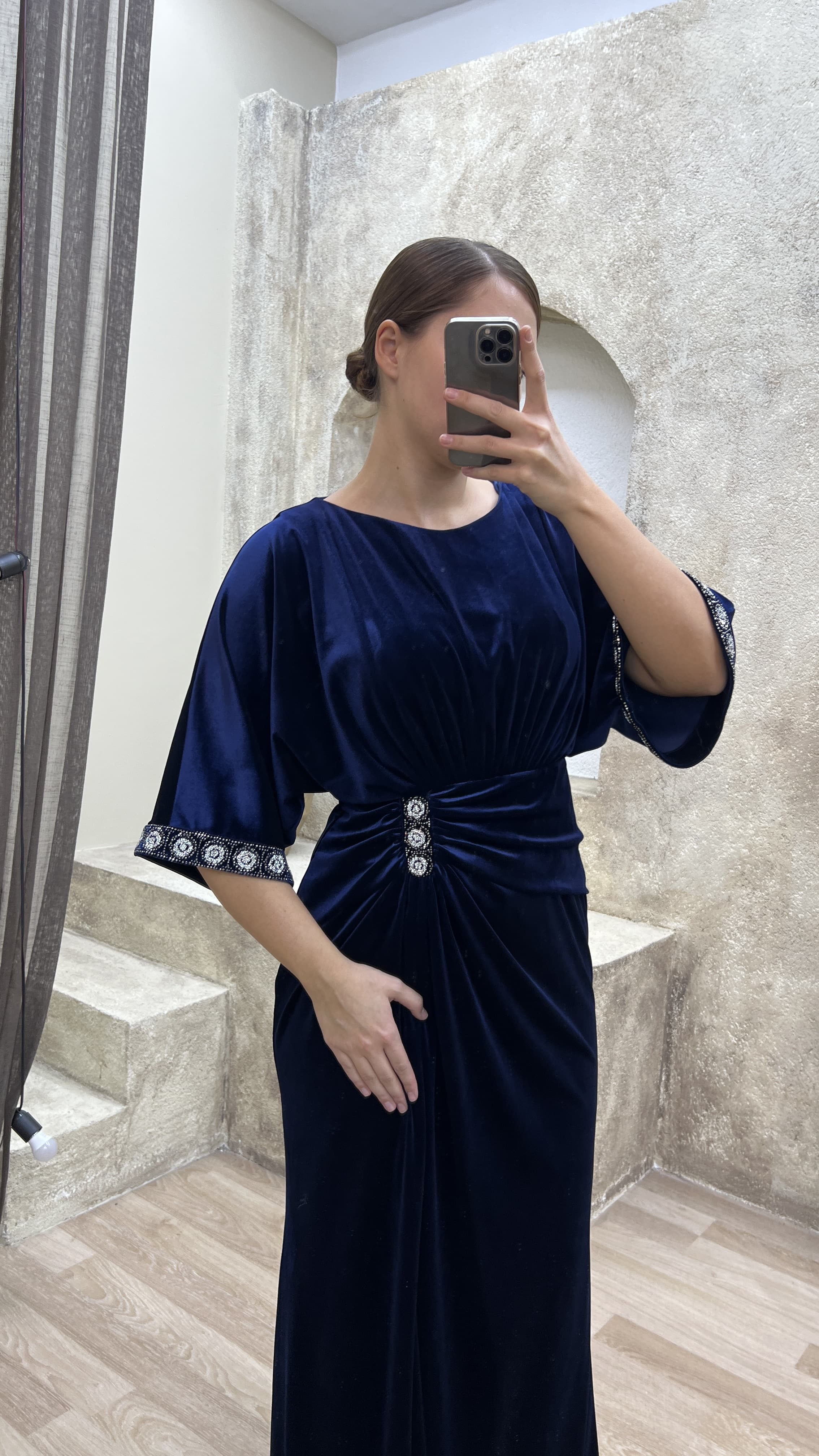 Lacivert Bel Detay İşlemeli Tasarım Kadife Büyük Beden Abiye Elbise