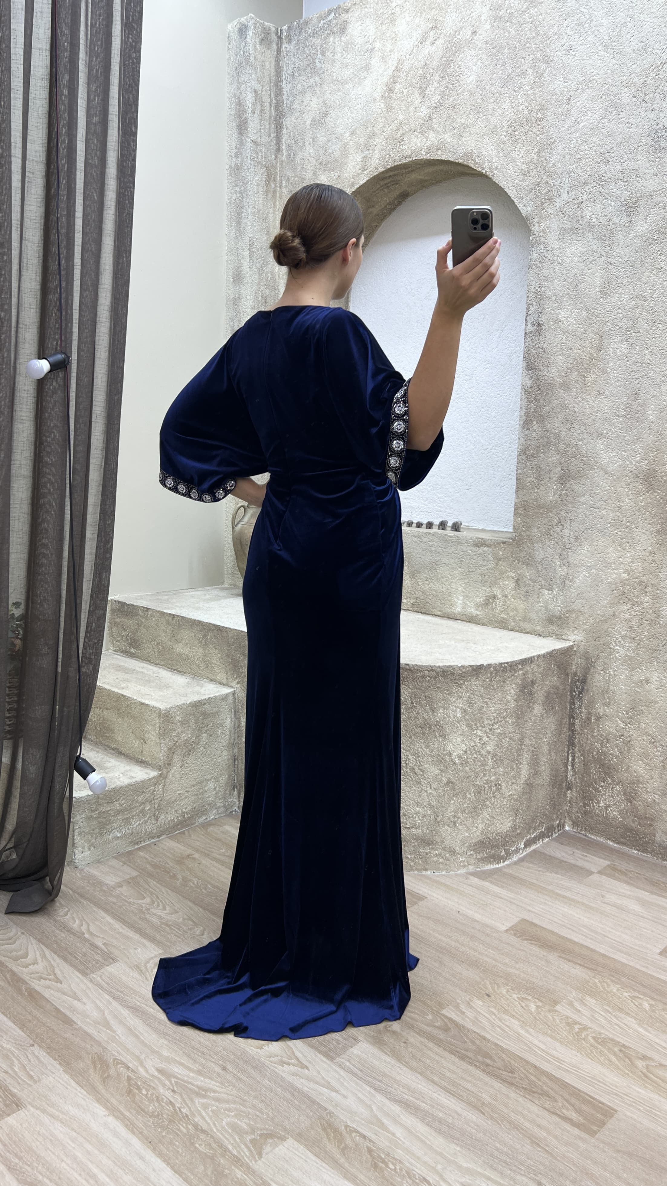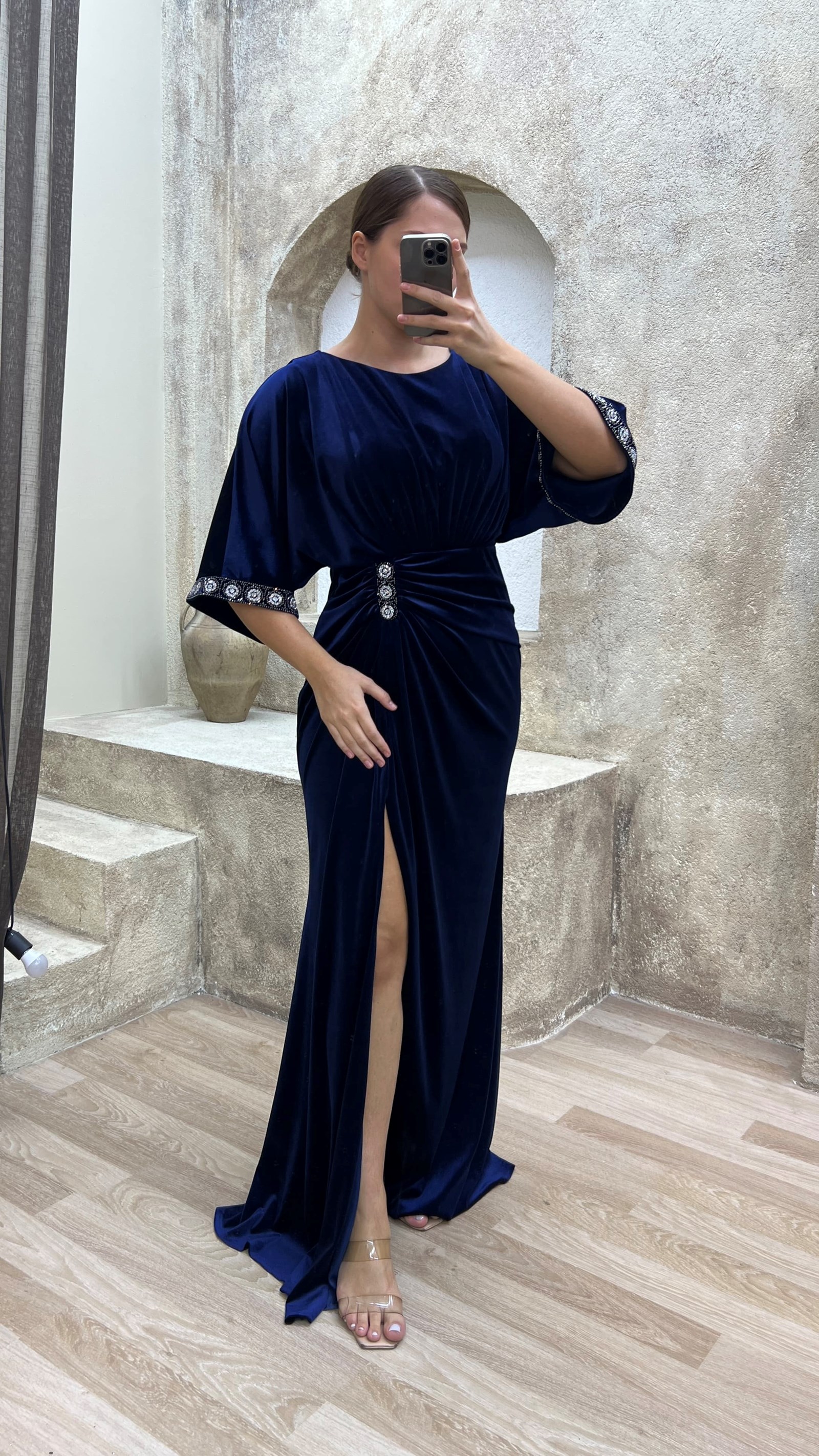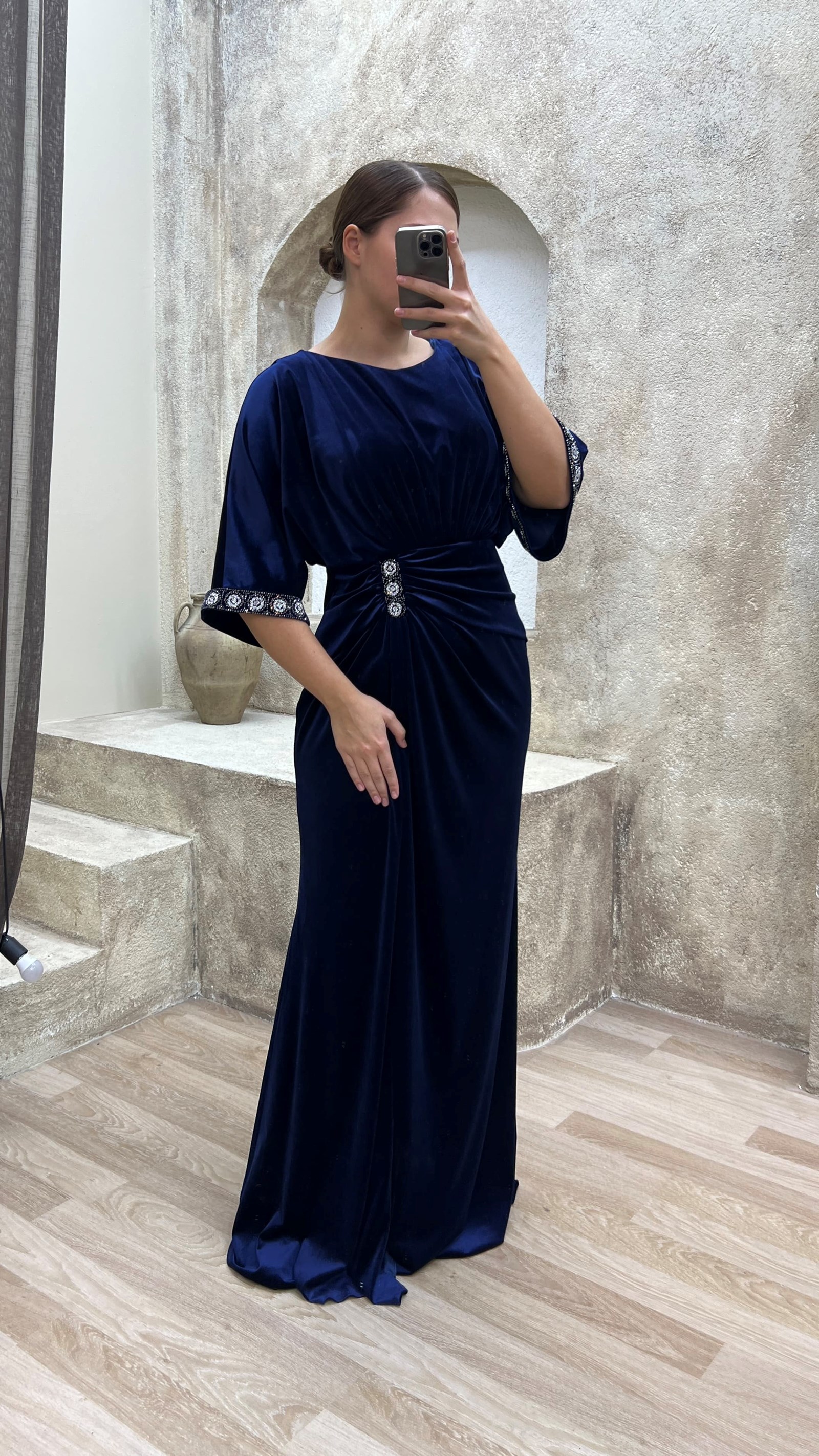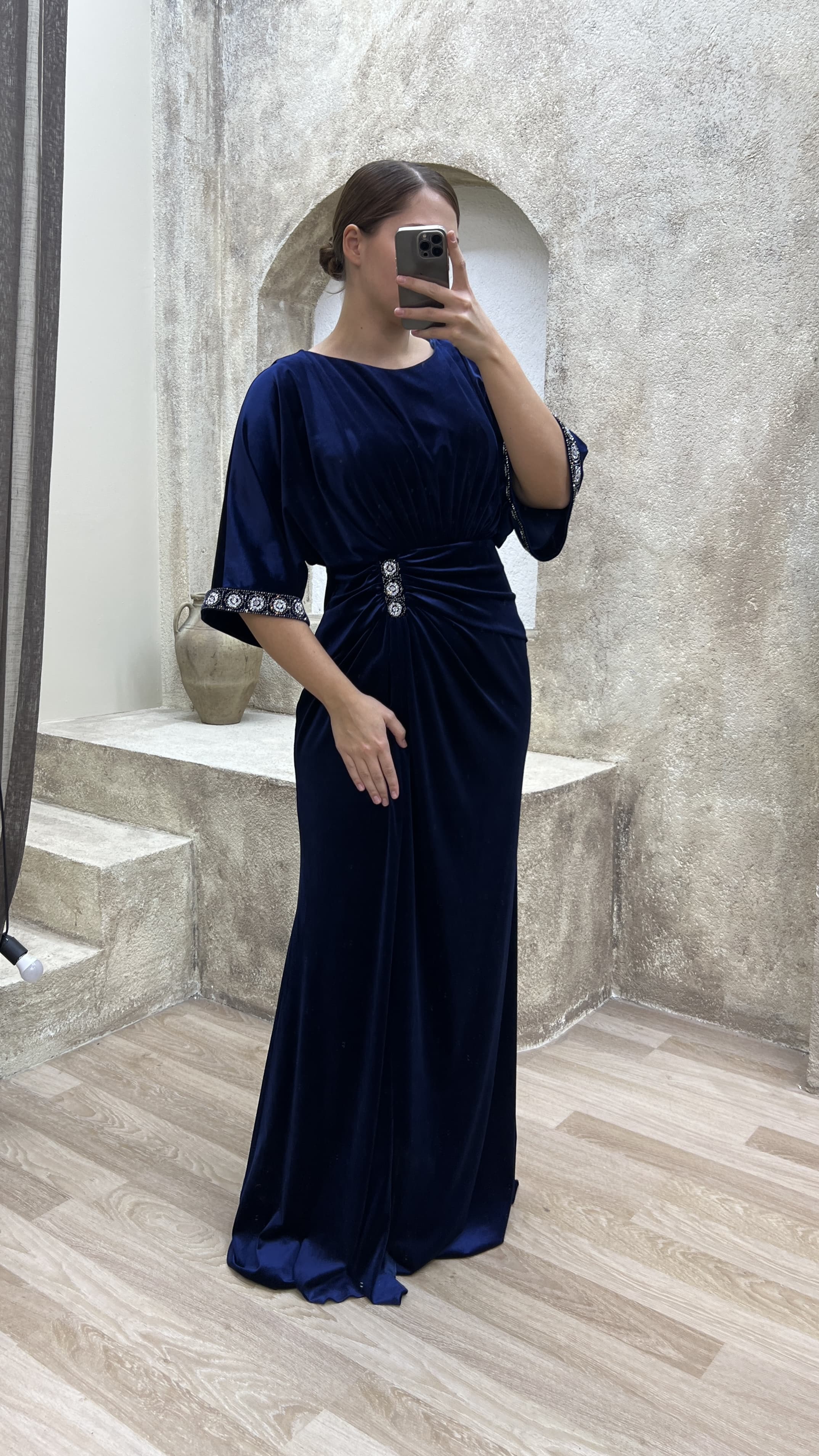 Lacivert Bel Detay İşlemeli Tasarım Kadife Büyük Beden Abiye Elbise