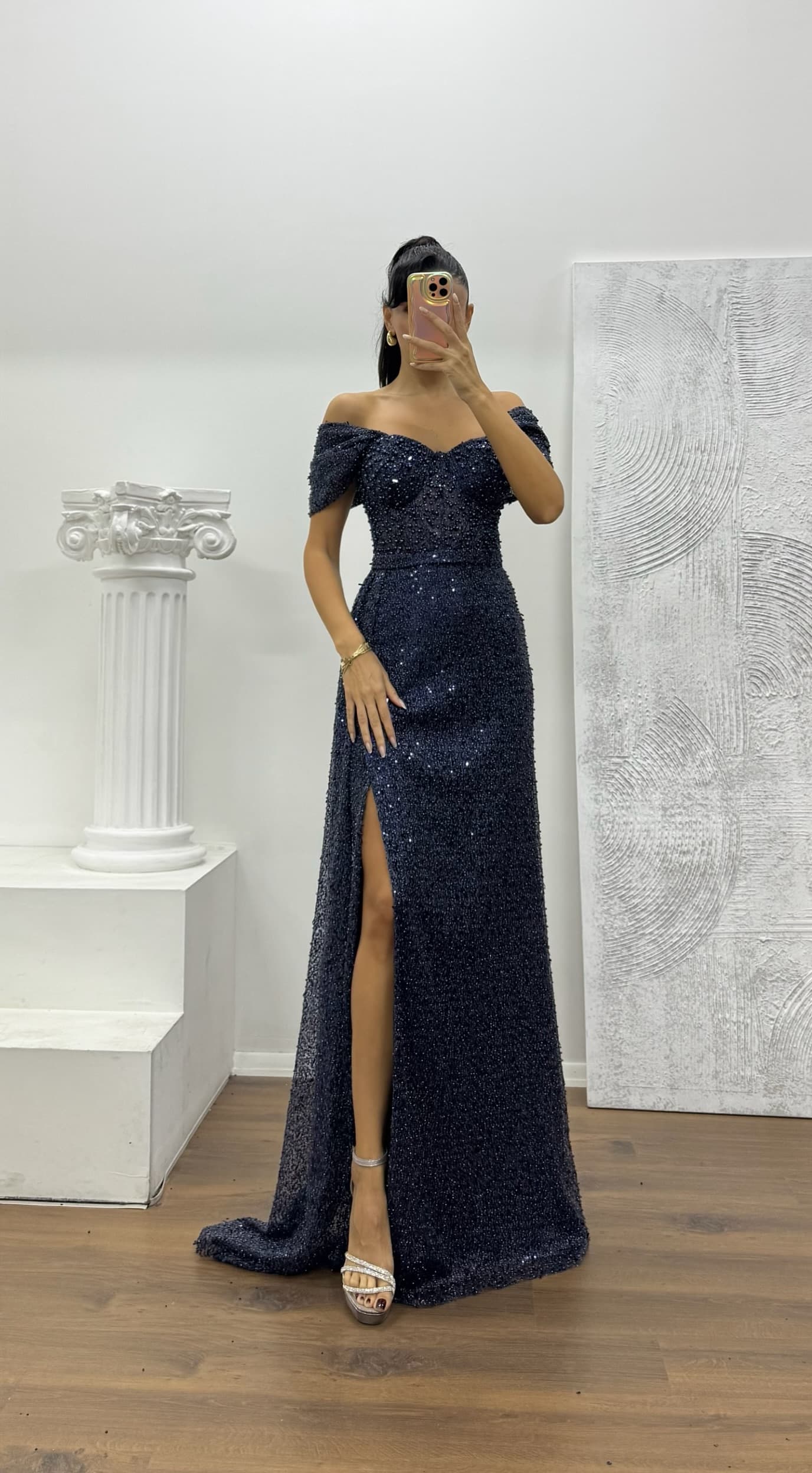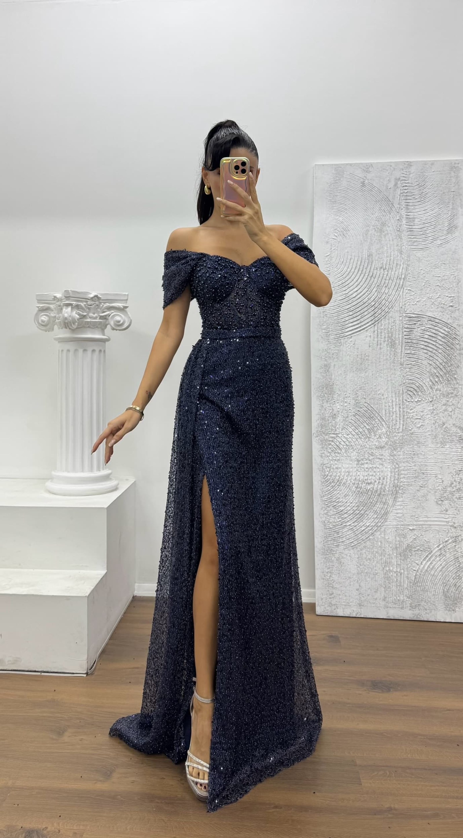 • Lacivert Bel Transparan Detay Abiye Elbise