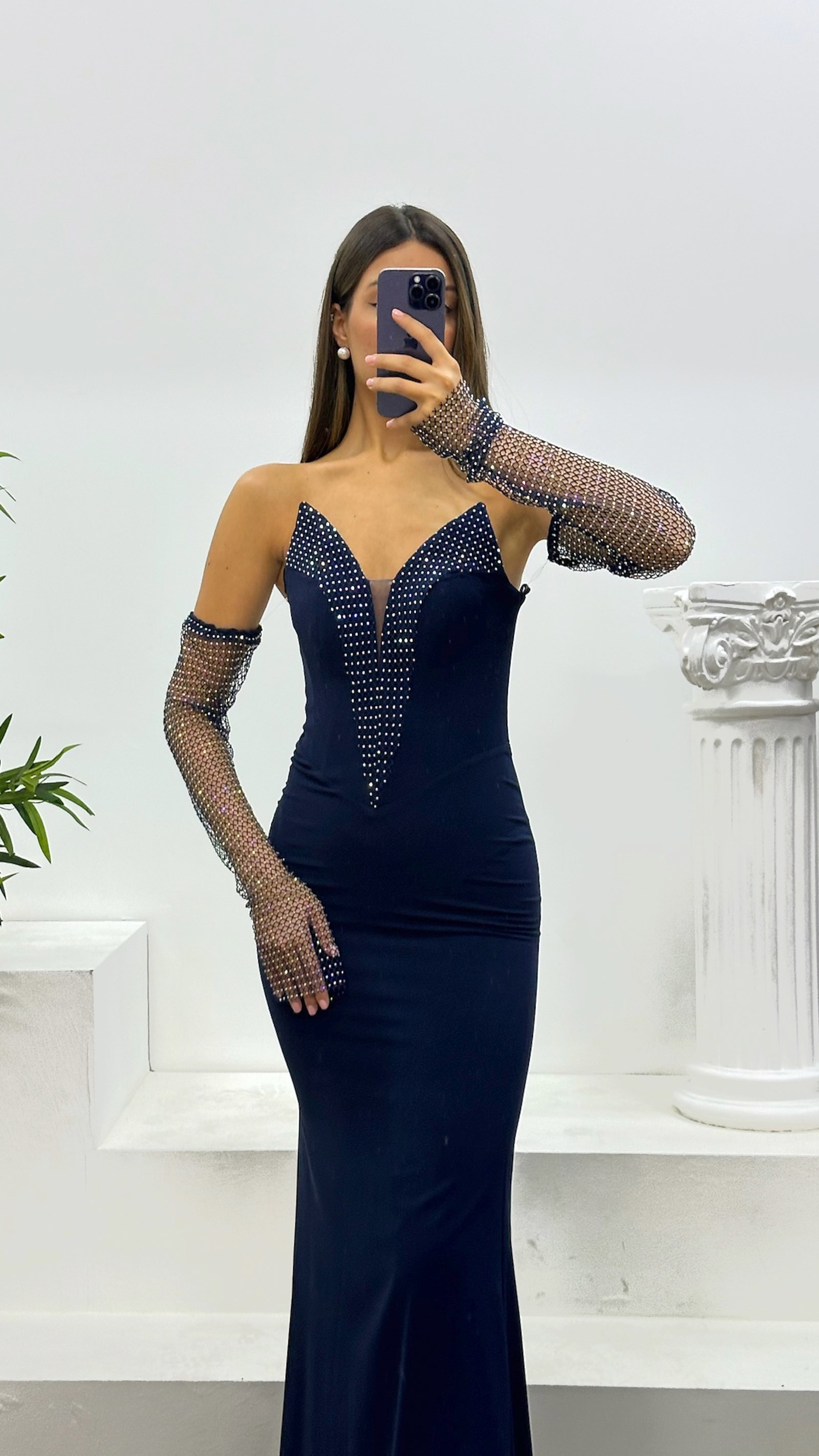 Abito da sera senza spalline con dettagli in pietra Adatto per taglie dalla 36 alla 42, con coppe imbottite, foderato, chiusura con zip sul retro. Progettato come abito da sera con dettagli in pietra. Lunghezza: Può variare tra 170 e 175 cm. Tipo di tessuto: Atlas, 100% poliestere.