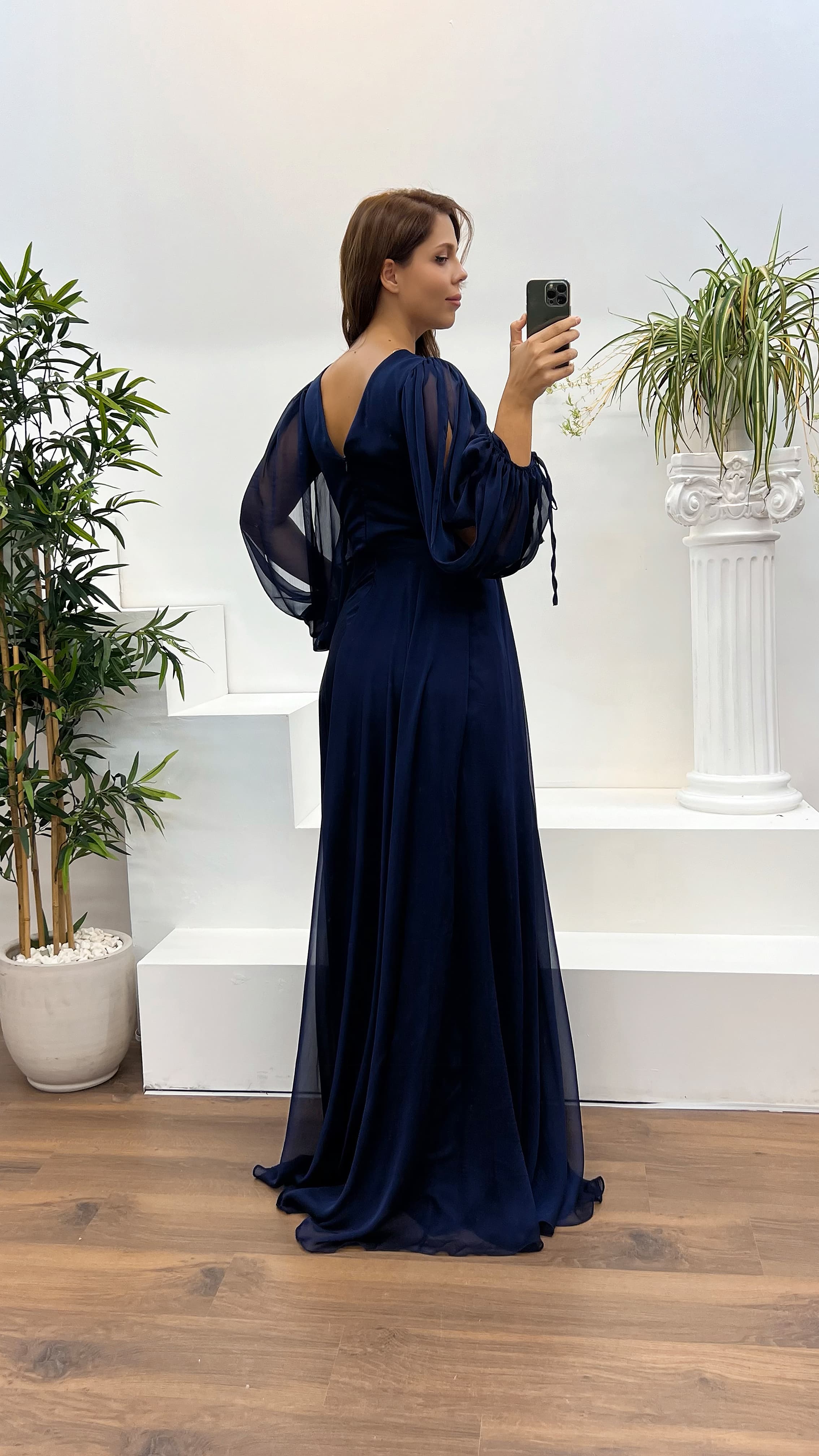 • Lacivert V Yaka Bel İşleme Detay Büyük Beden Abiye Elbise