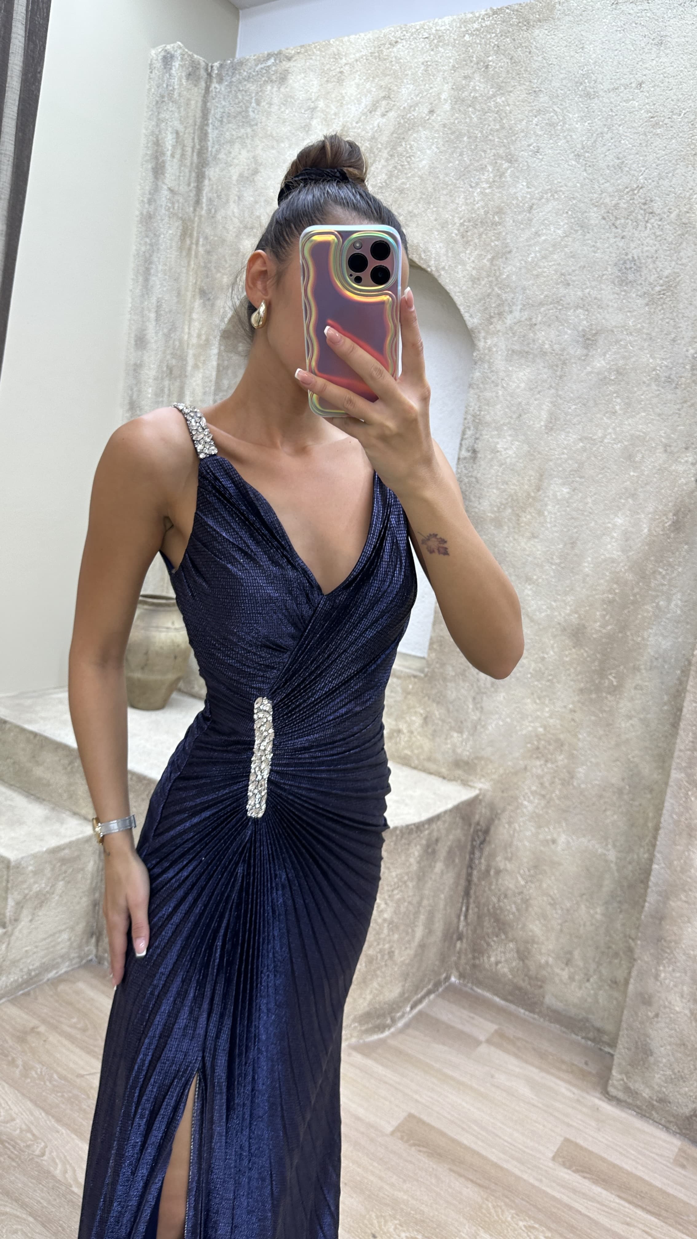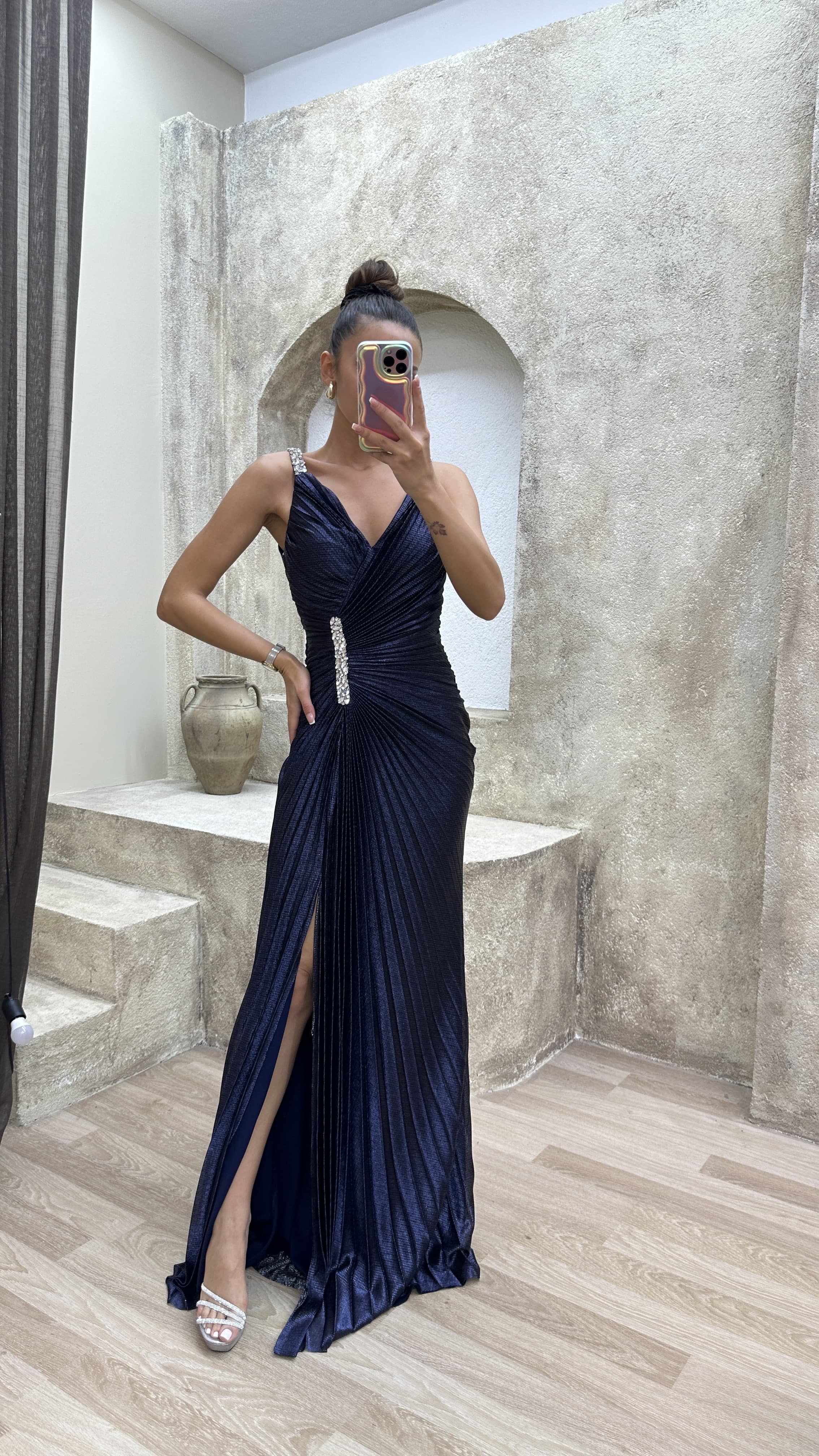 • Lacivert V Yaka Broşlu Abiye Elbise