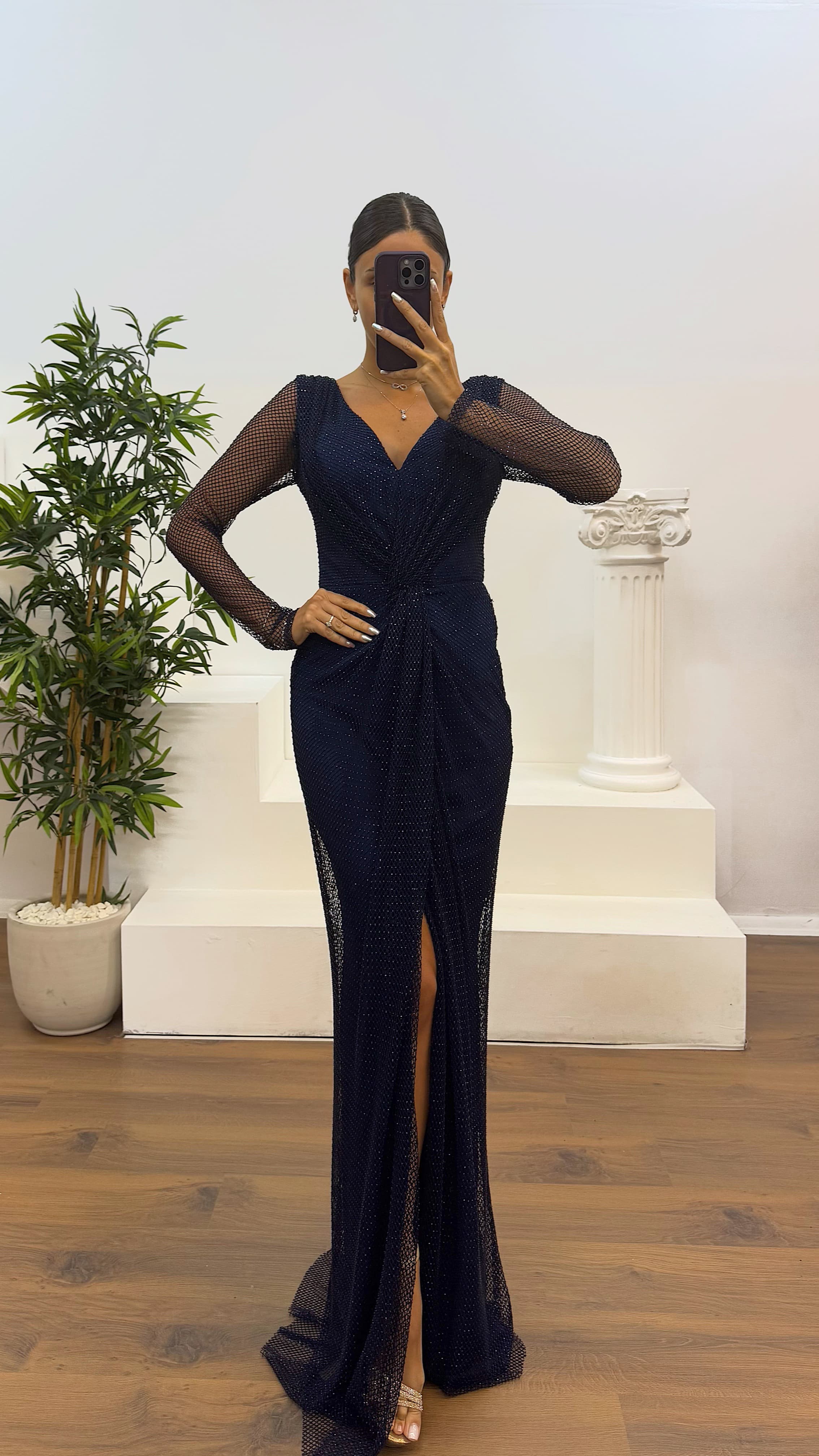 Abito da sera in rete con scollo a V Il prodotto è compatibile con le taglie dalla 36 alla 42, progettato con imbottiture per il seno, foderato, con cerniera sul retro e spacco. Lunghezza del prodotto: può variare tra i 165 e i 170 cm. Lunghezza delle maniche del prodotto: 60 cm. Tipo di tessuto: tessuto in rete con pietre.