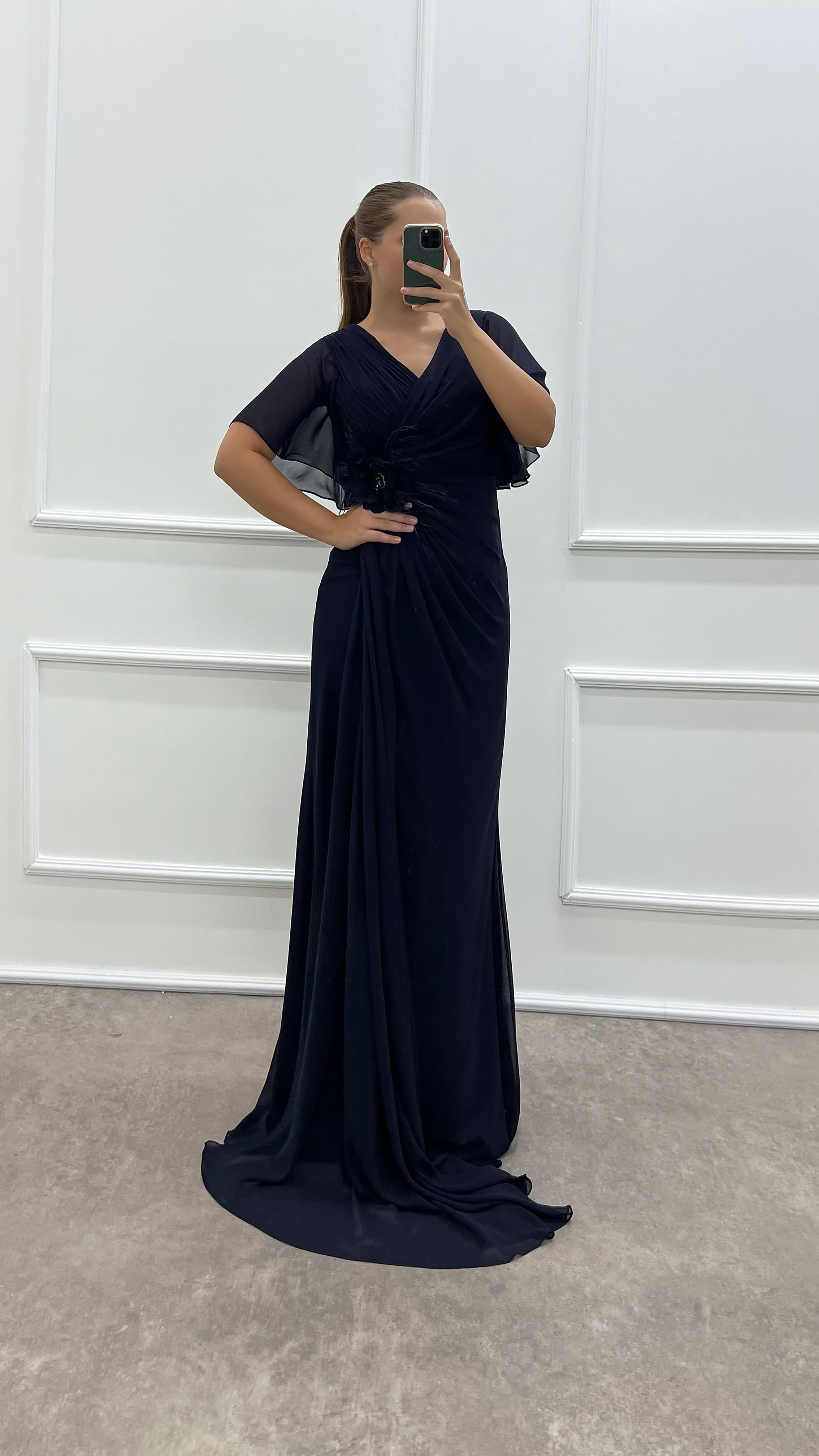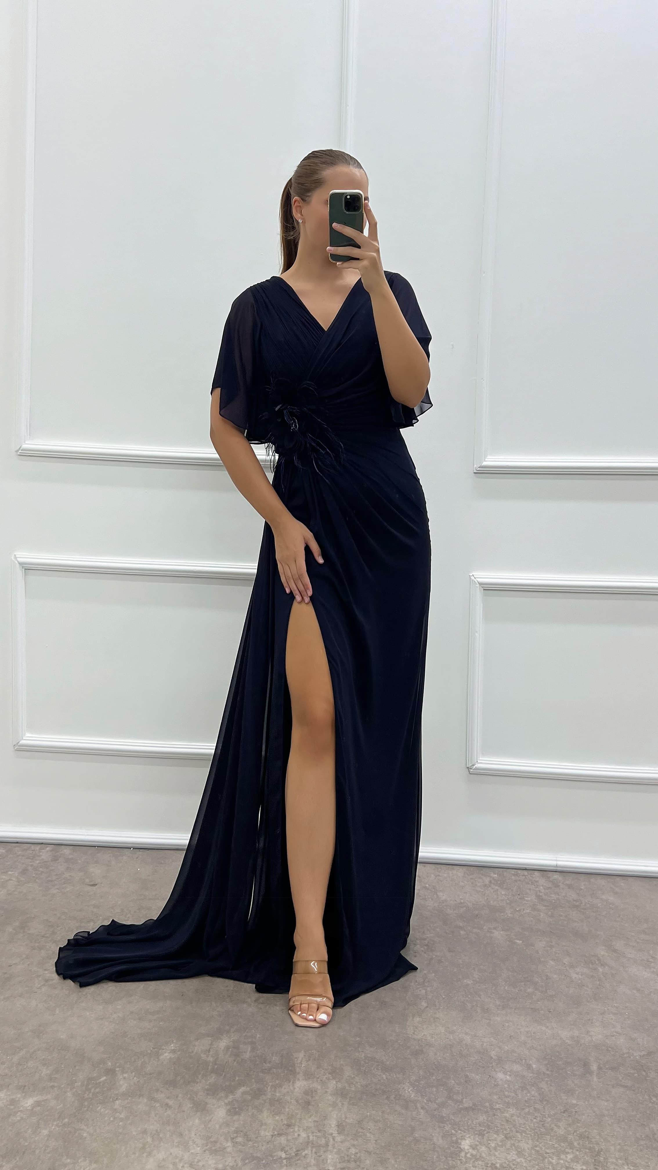 • Lacivert V Yaka Gül Detay Büyük Beden Abiye Elbise