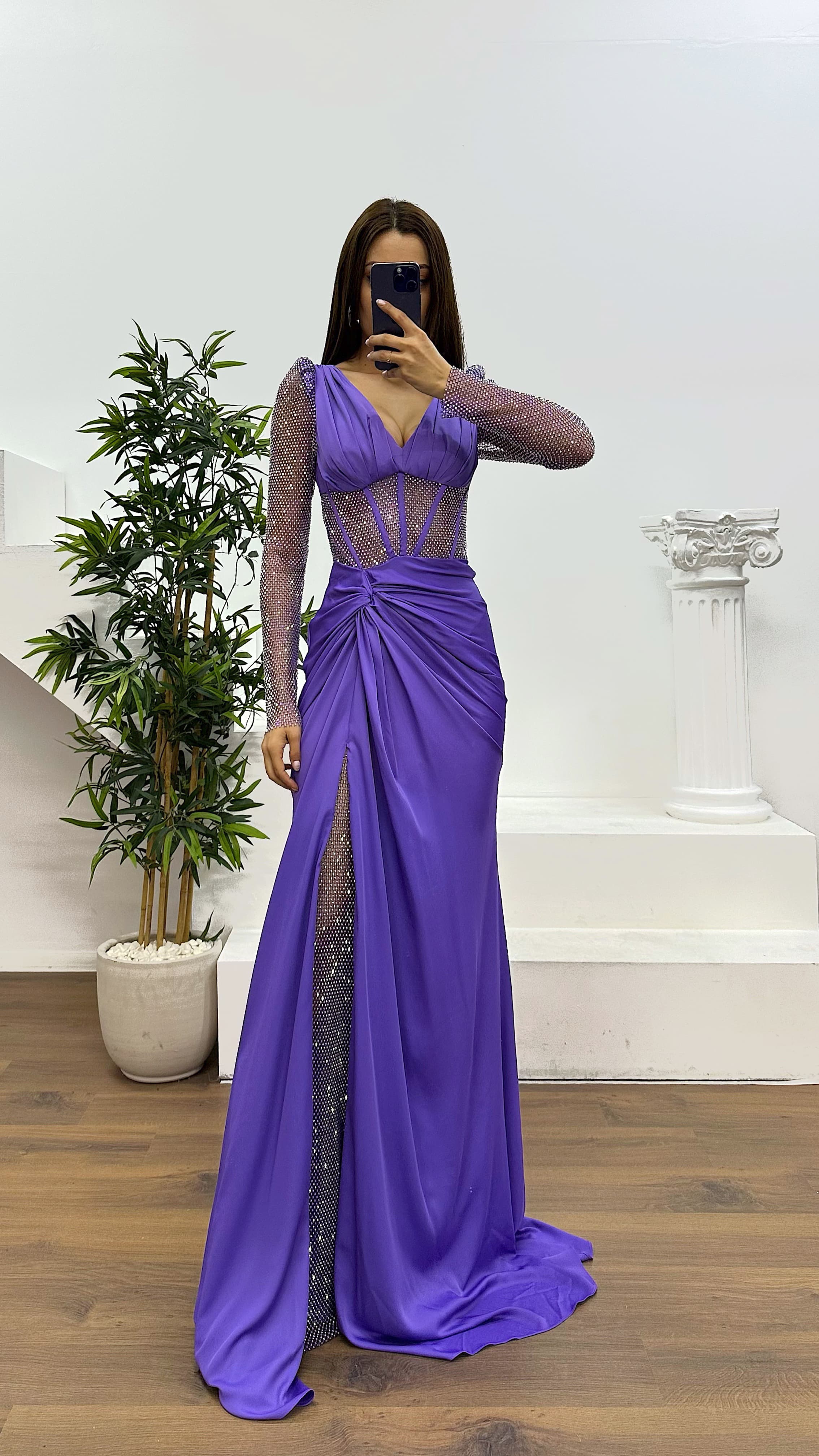 Abito da sera con dettagli in tulle Il prodotto è progettato come abito da sera con dettagli in tulle, adatto per taglie dalla 36 alla 44, con coppe al seno, foderato, chiusura con zip posteriore e spacco. Lunghezza del prodotto: Può variare tra 175-170 cm. Lunghezza manica: 60 cm. Tipo di tessuto: Raso di poliestere, viscosa.