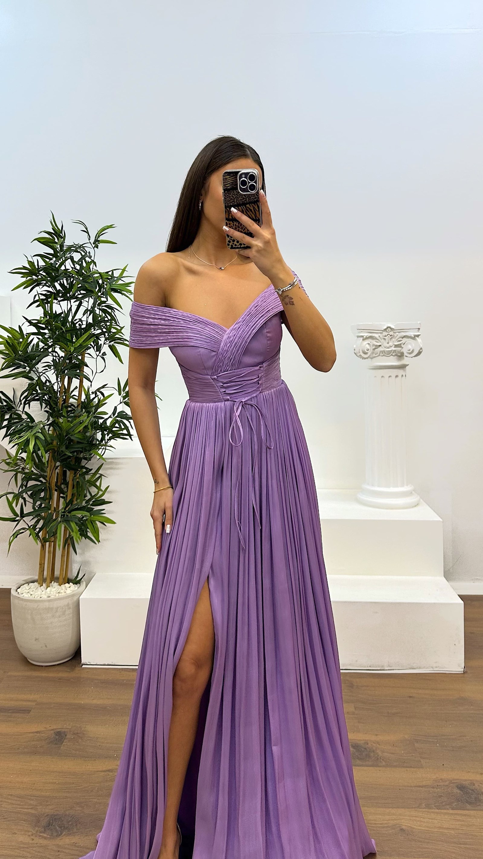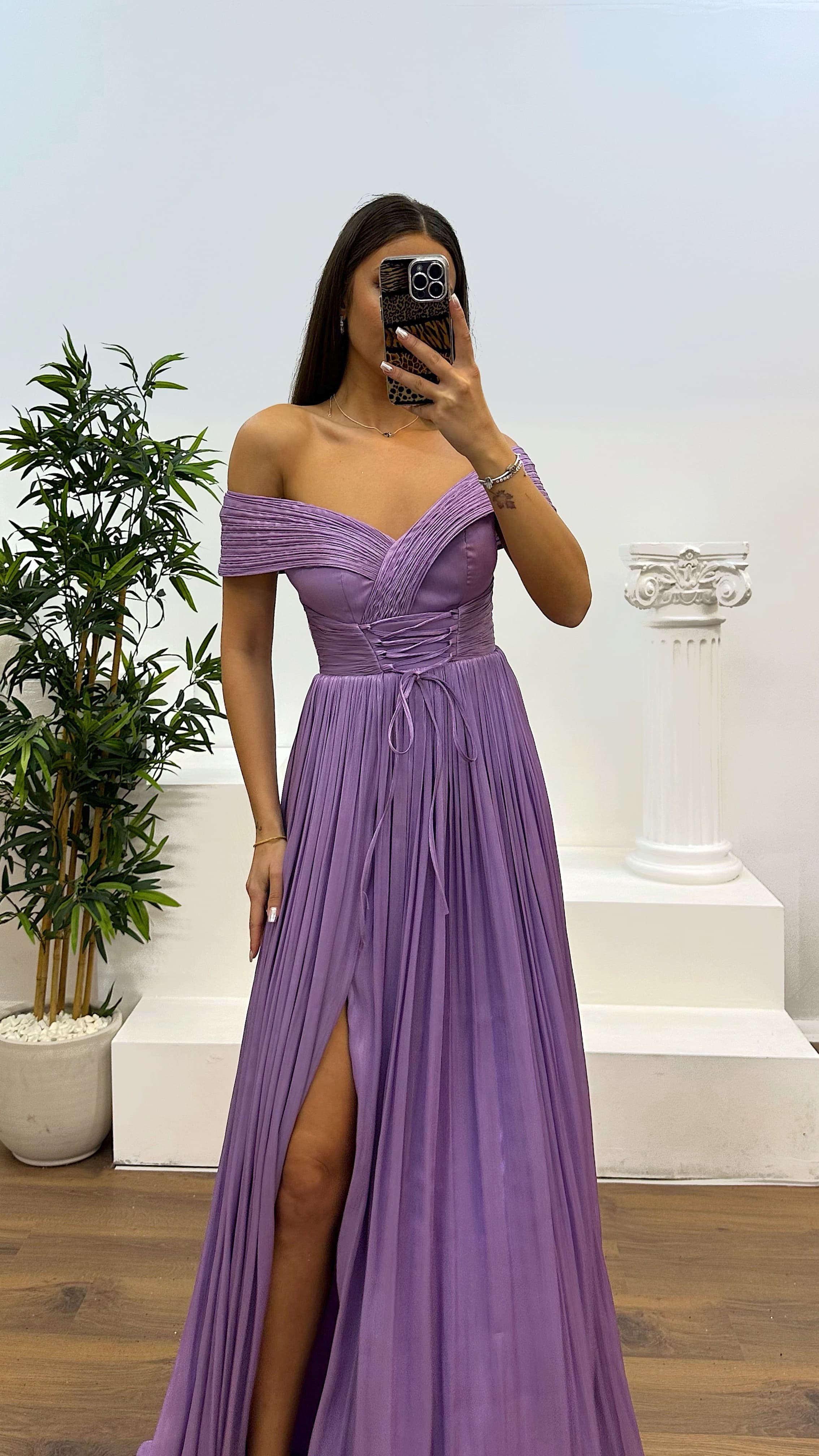 Abito da sera plissettato con colletto della Madonna color lavanda