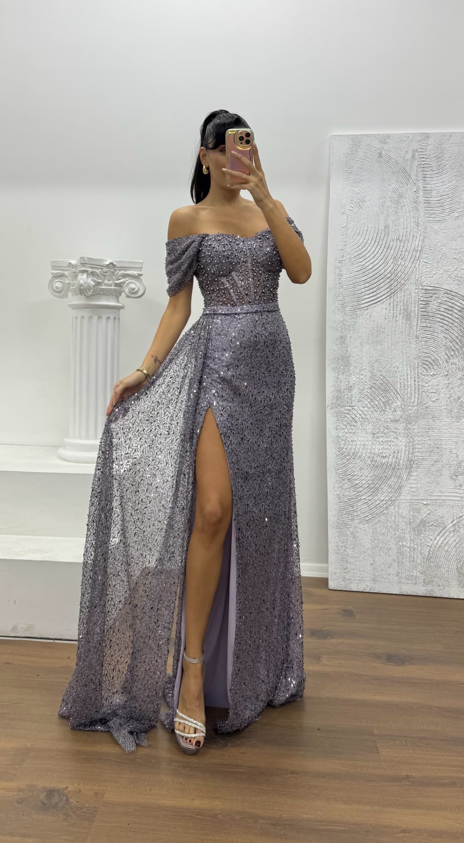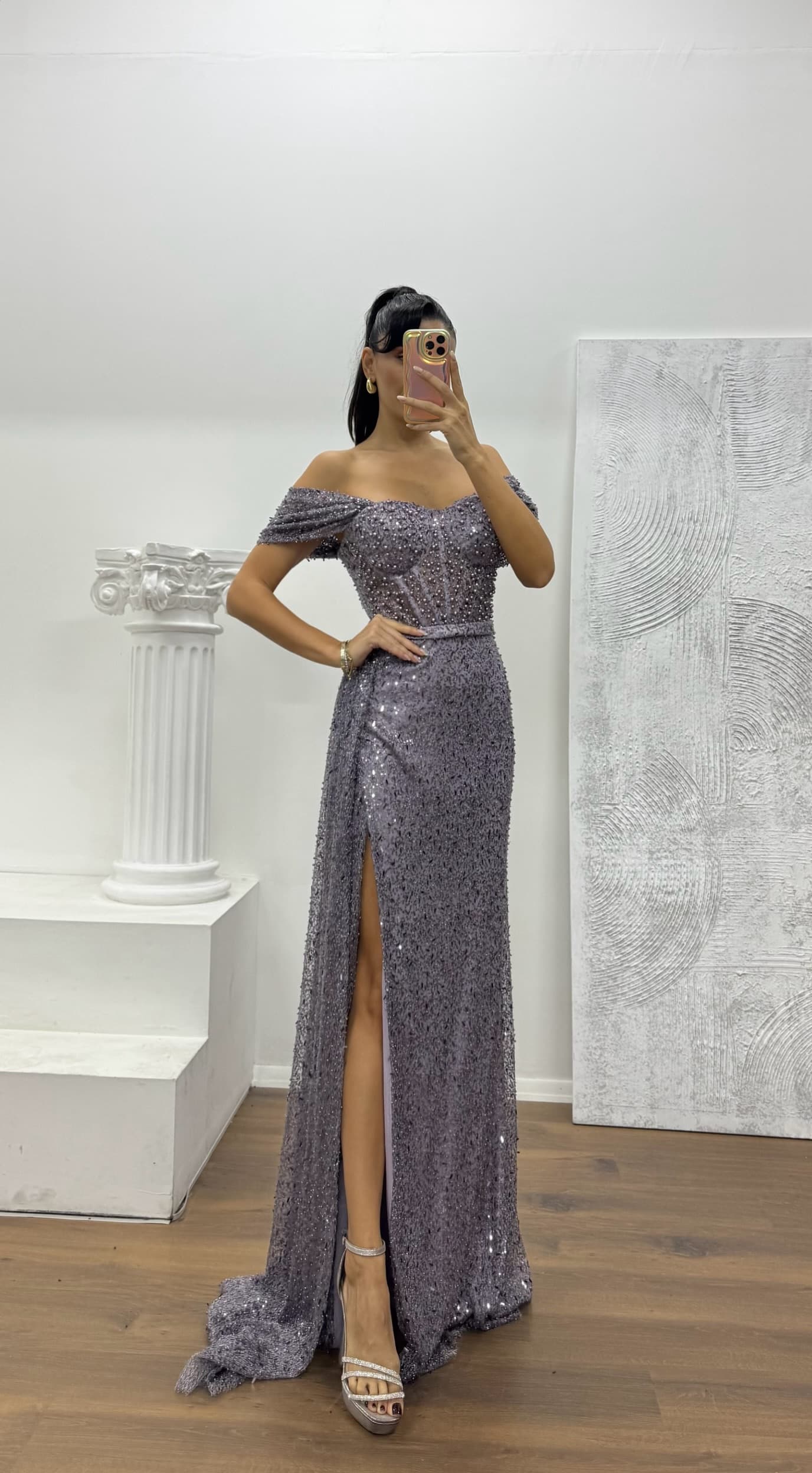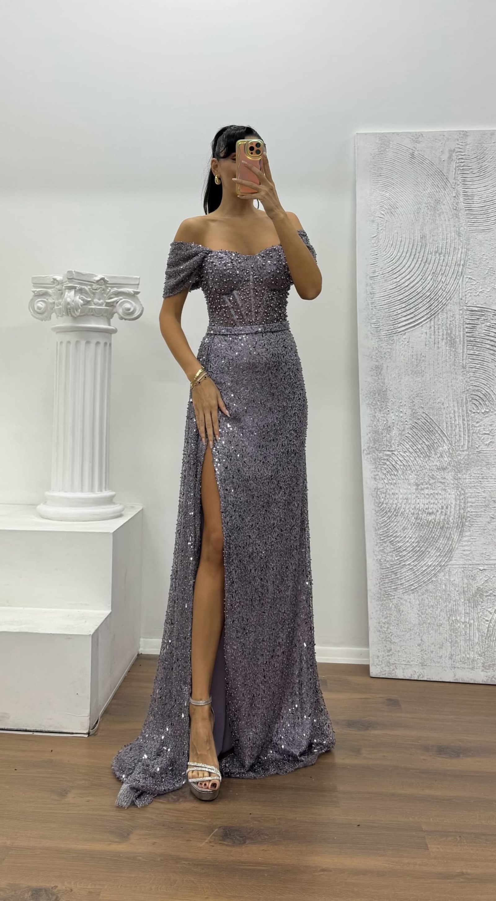 Abito da sera con scollo a barca e dettaglio trasparente in vita Il prodotto è adatto alle taglie 36–44, ha coppe integrate, è foderato, presenta una chiusura con zip sul retro ed è progettato con uno spacco. Lunghezza del prodotto: può variare tra 170 e 175 cm. Tipo di tessuto: tessuto paillettes, 100% poliestere. Una scelta ideale per distinguerti con eleganza a matrimoni, fidanzamenti, lauree o eventi speciali.