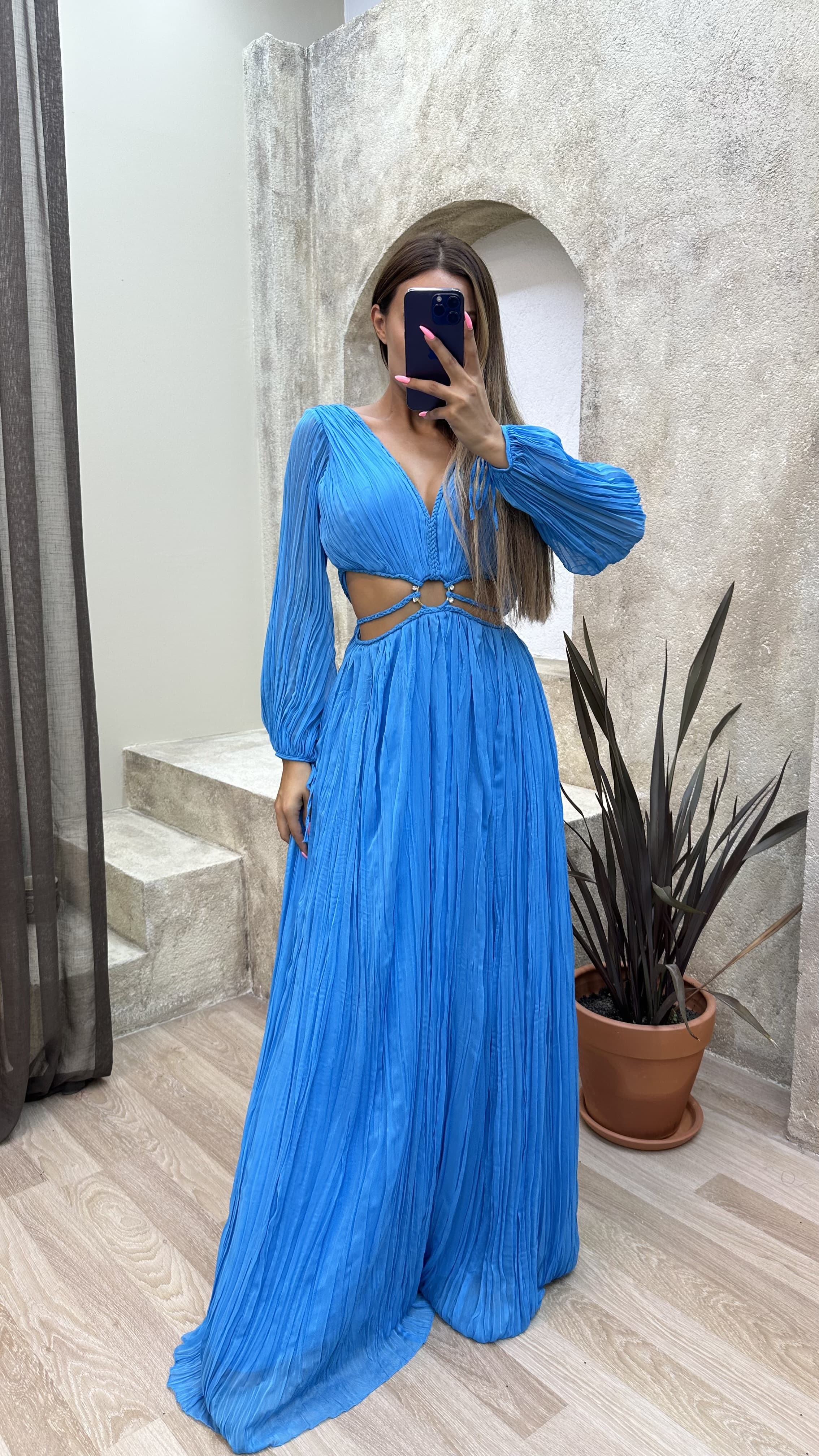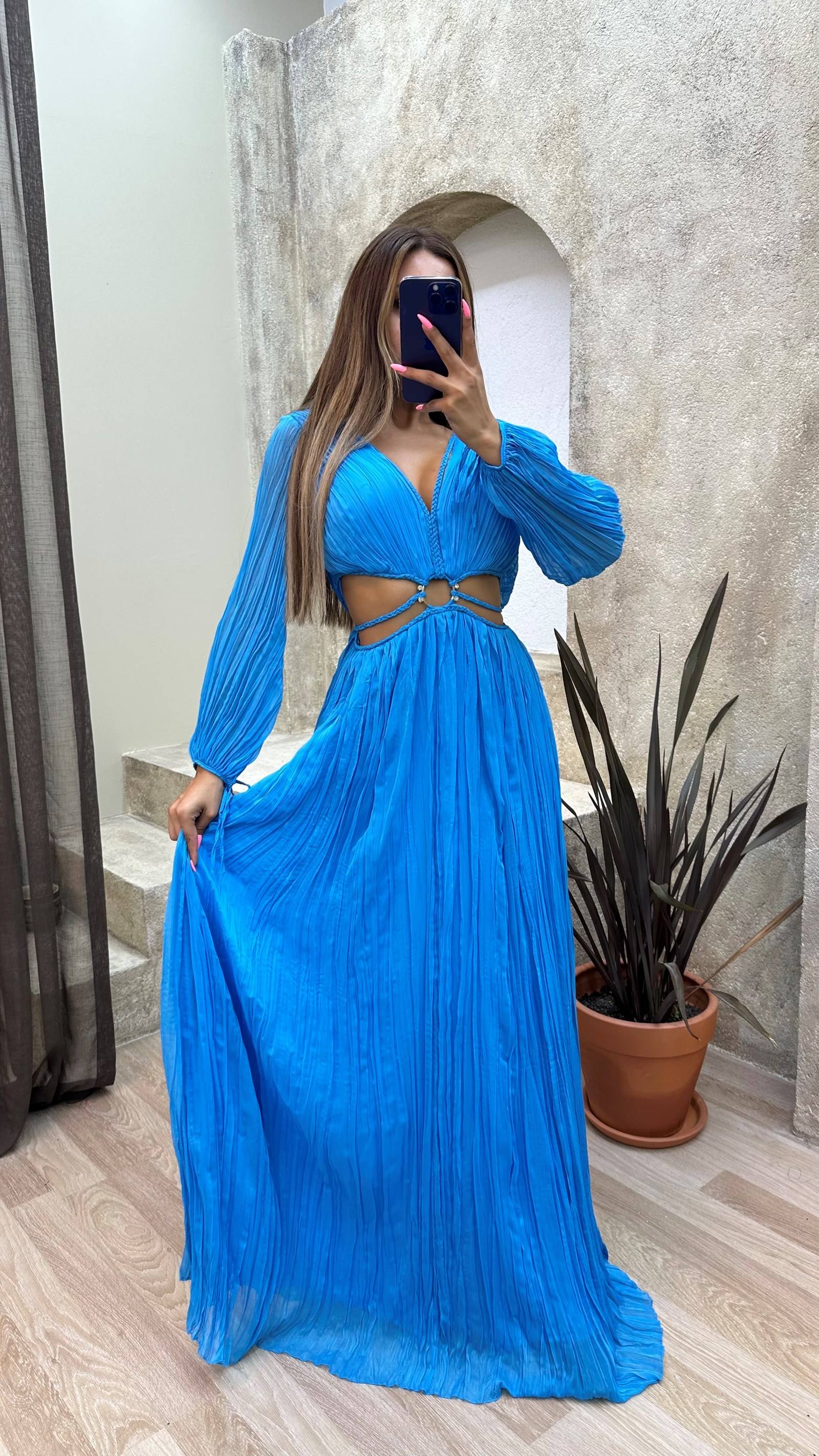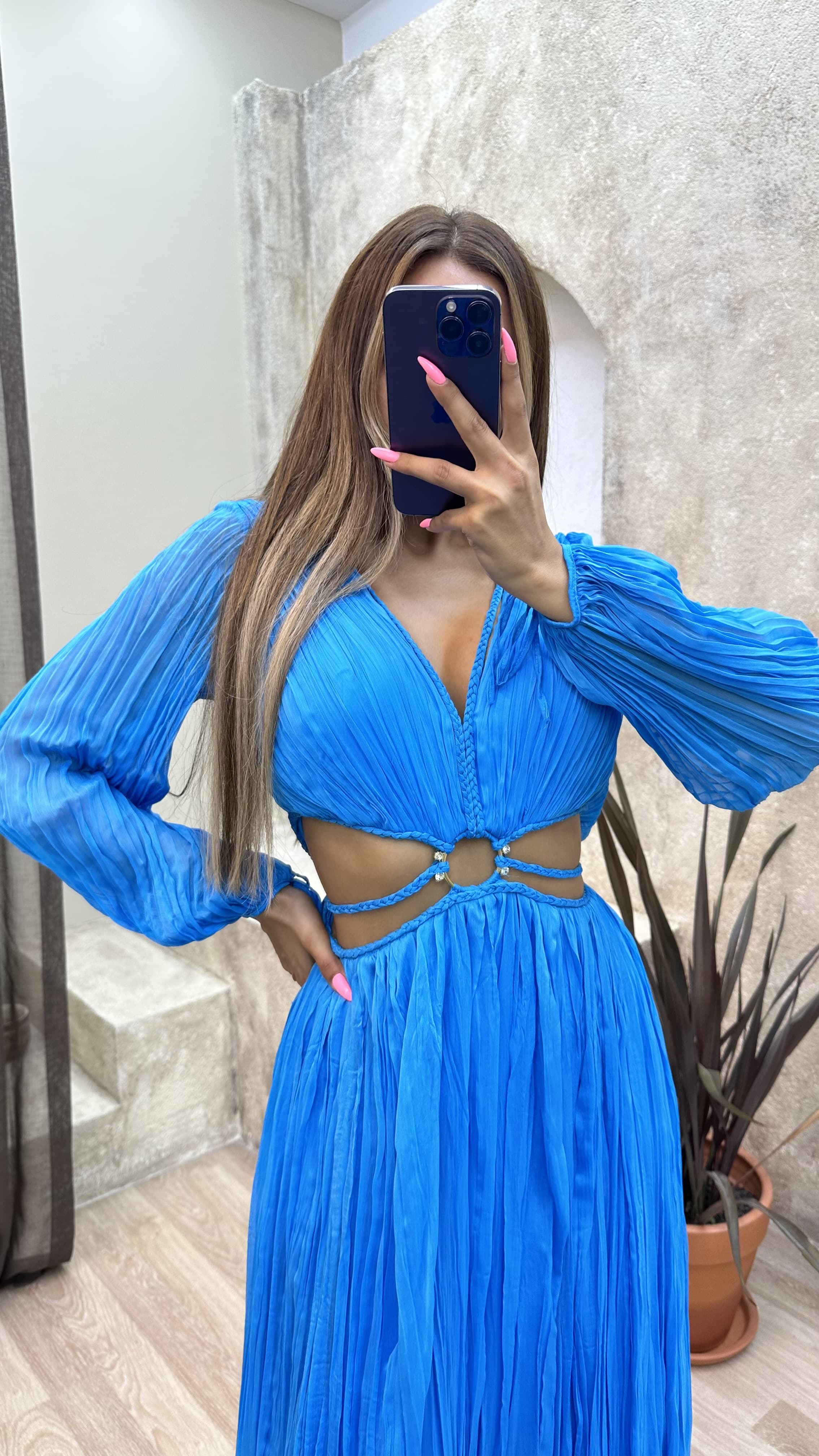 • Mavi Bel Detay Pliseli Abiye Elbise