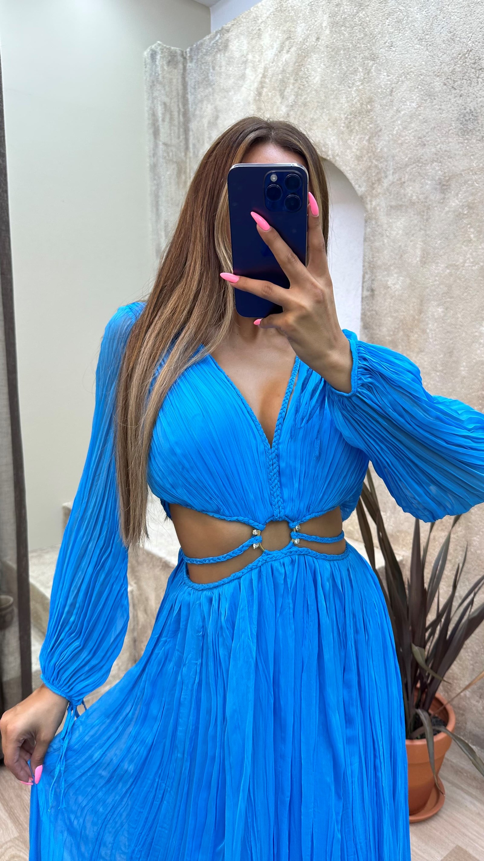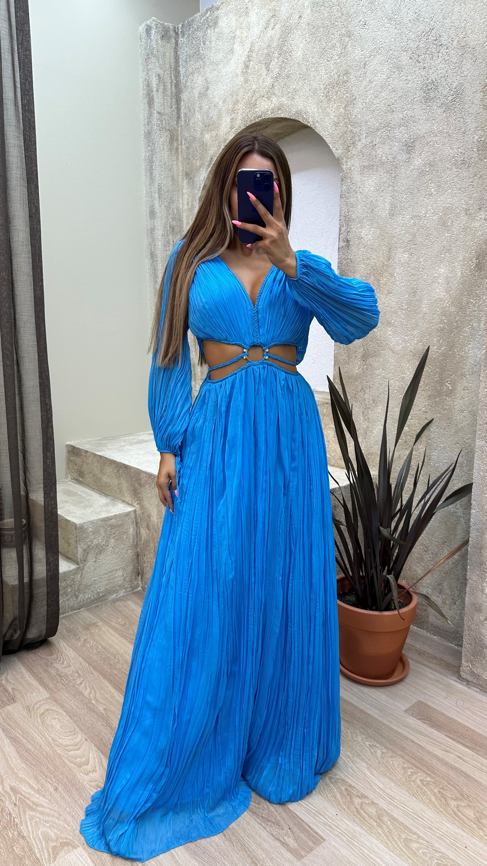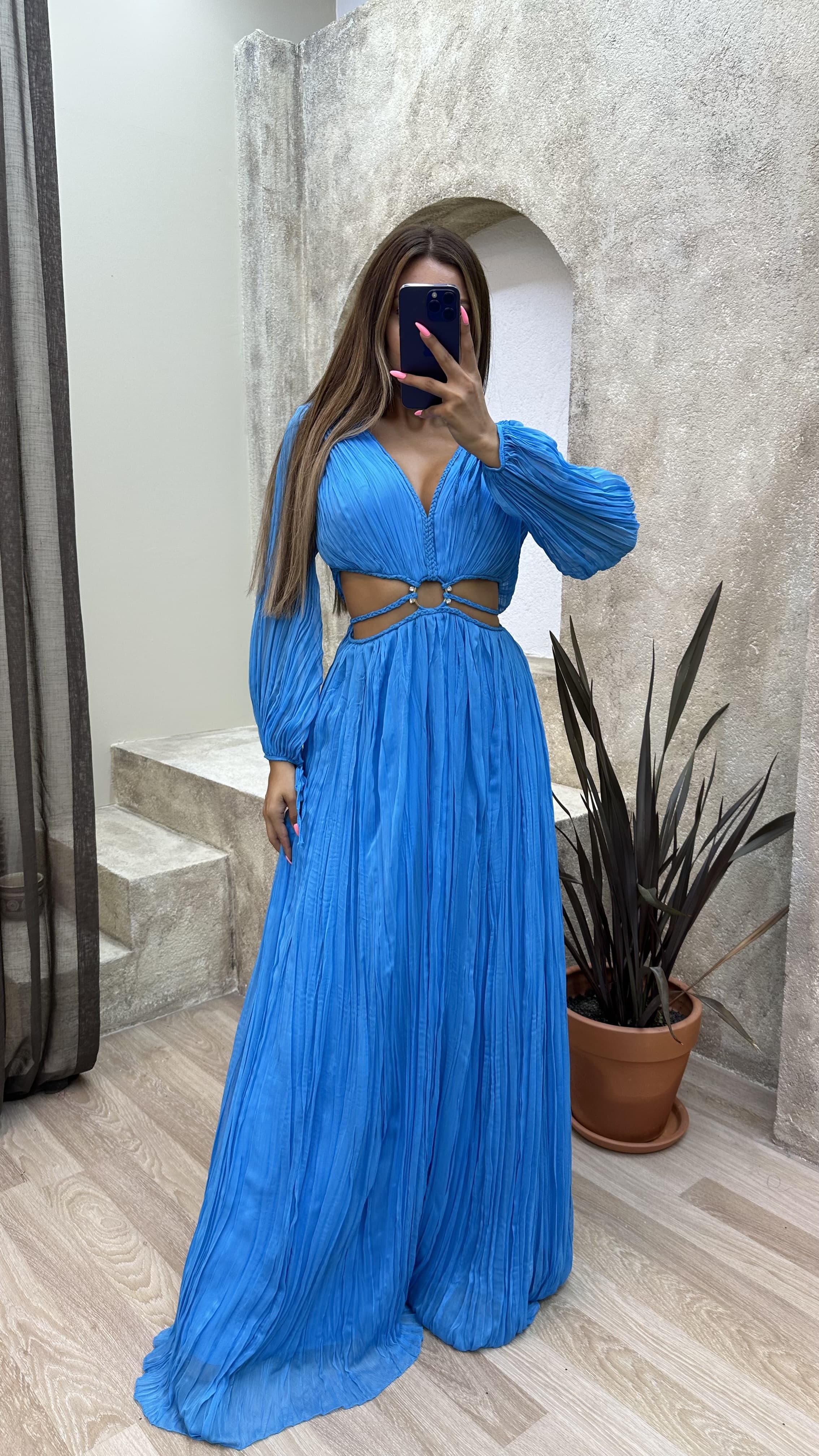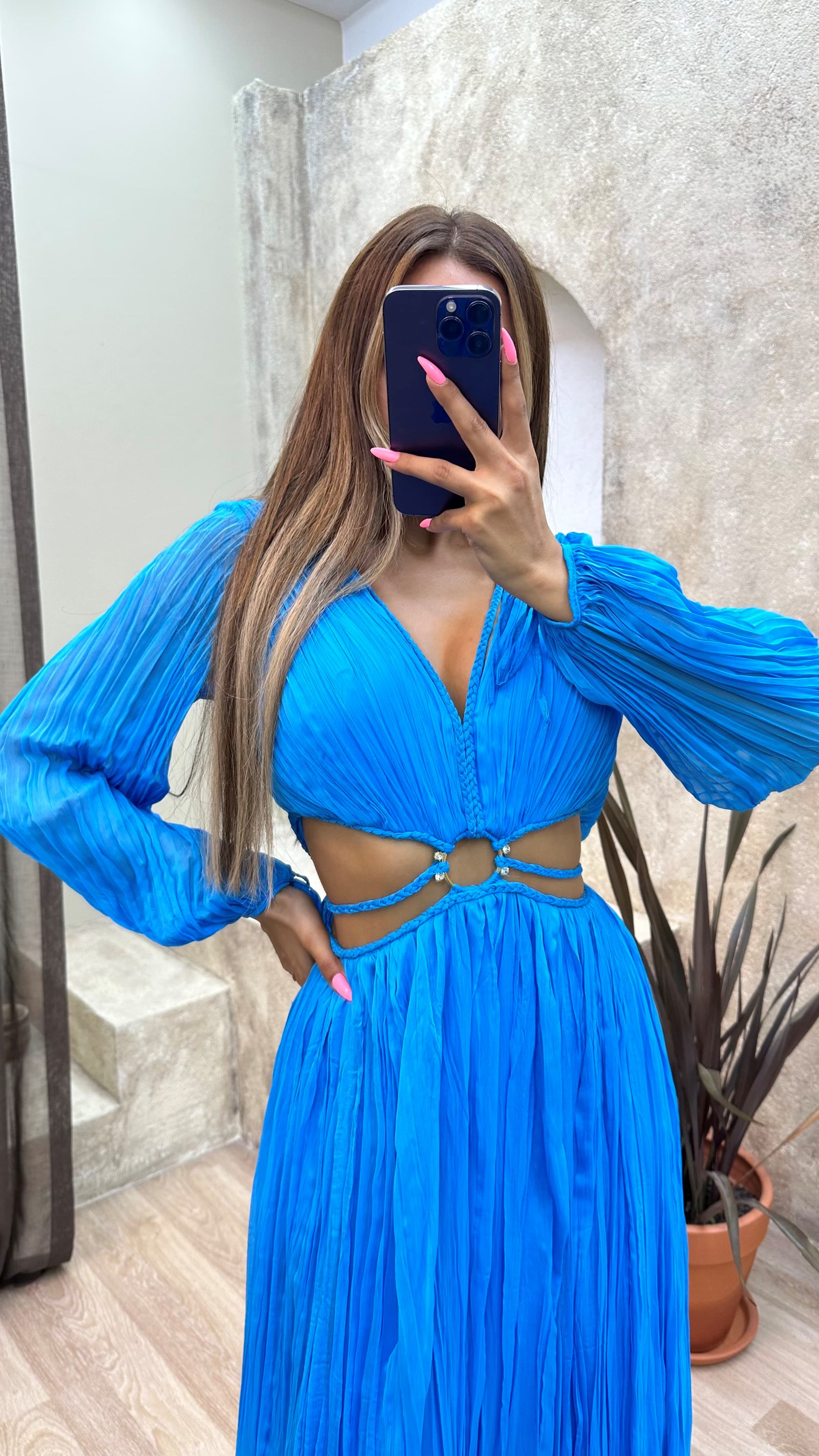 • Mavi Bel Detay Pliseli Abiye Elbise