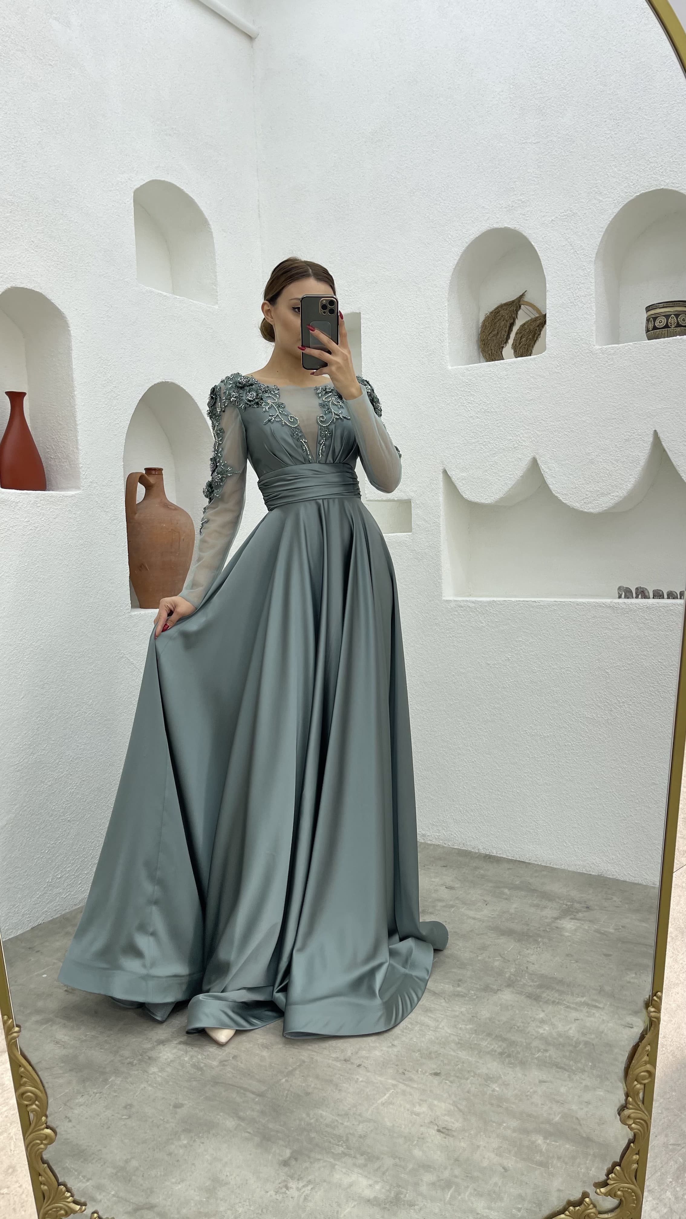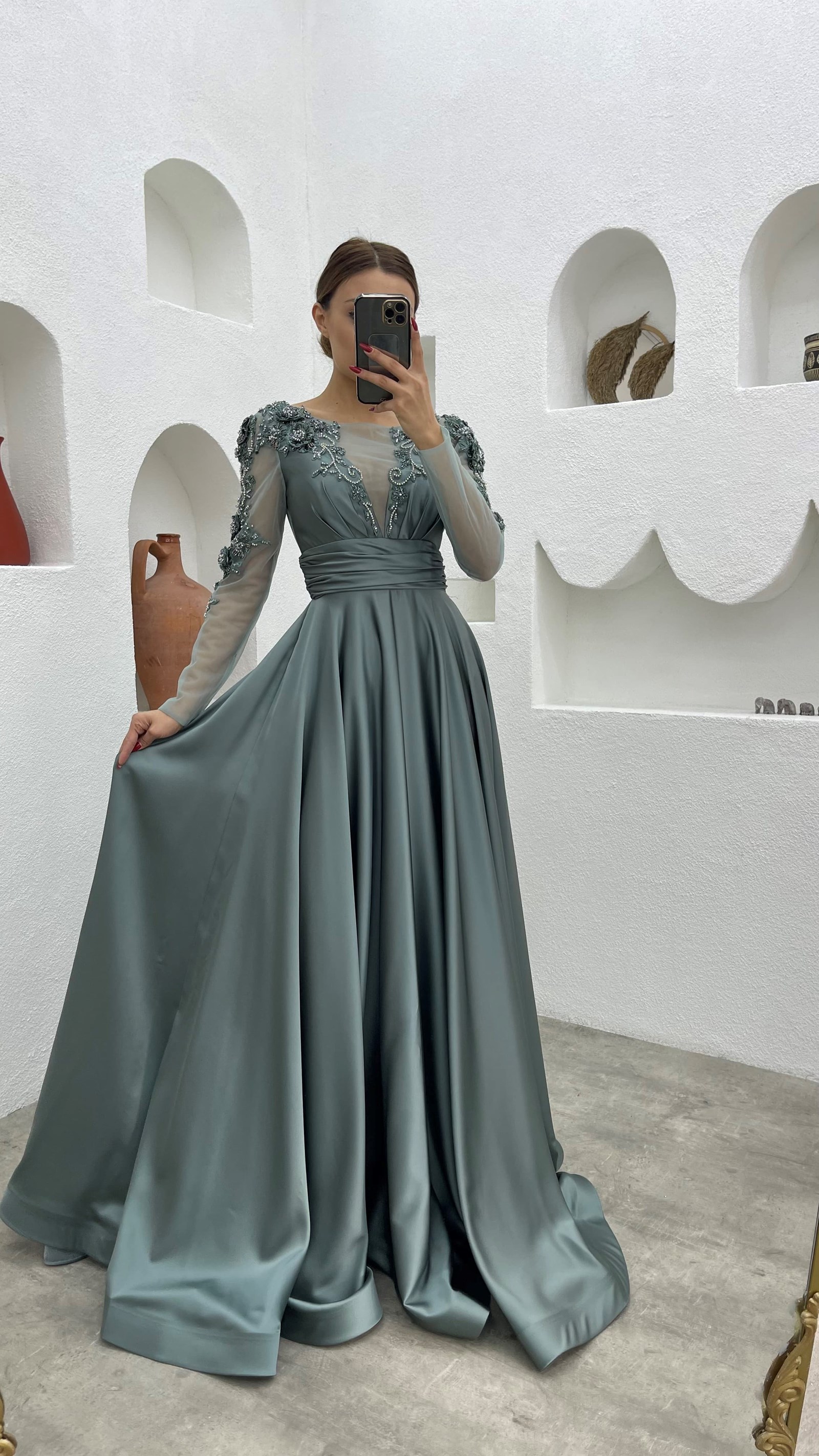 Abito da sera lungo in raso drappeggiato ricamato verde menta
