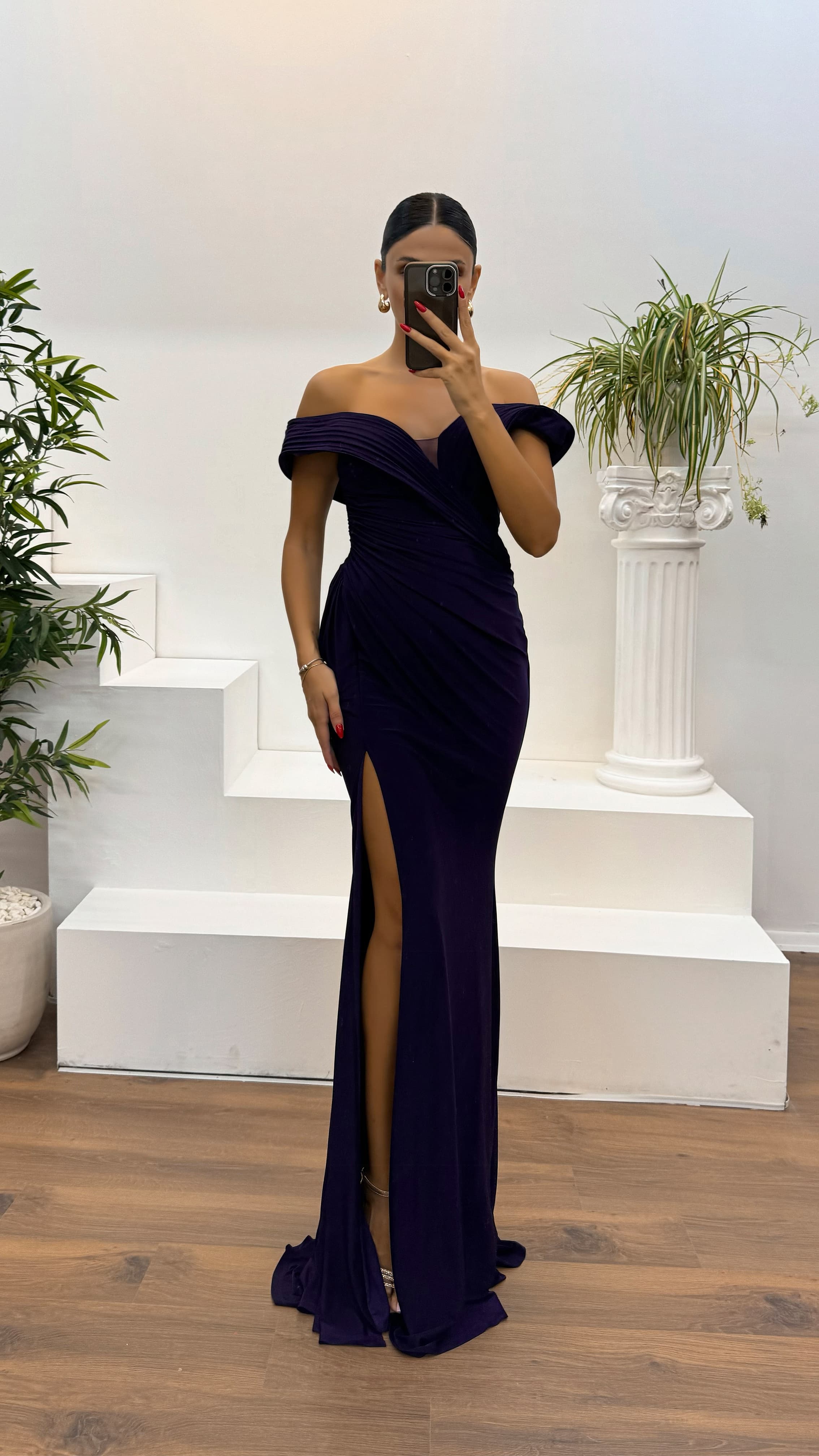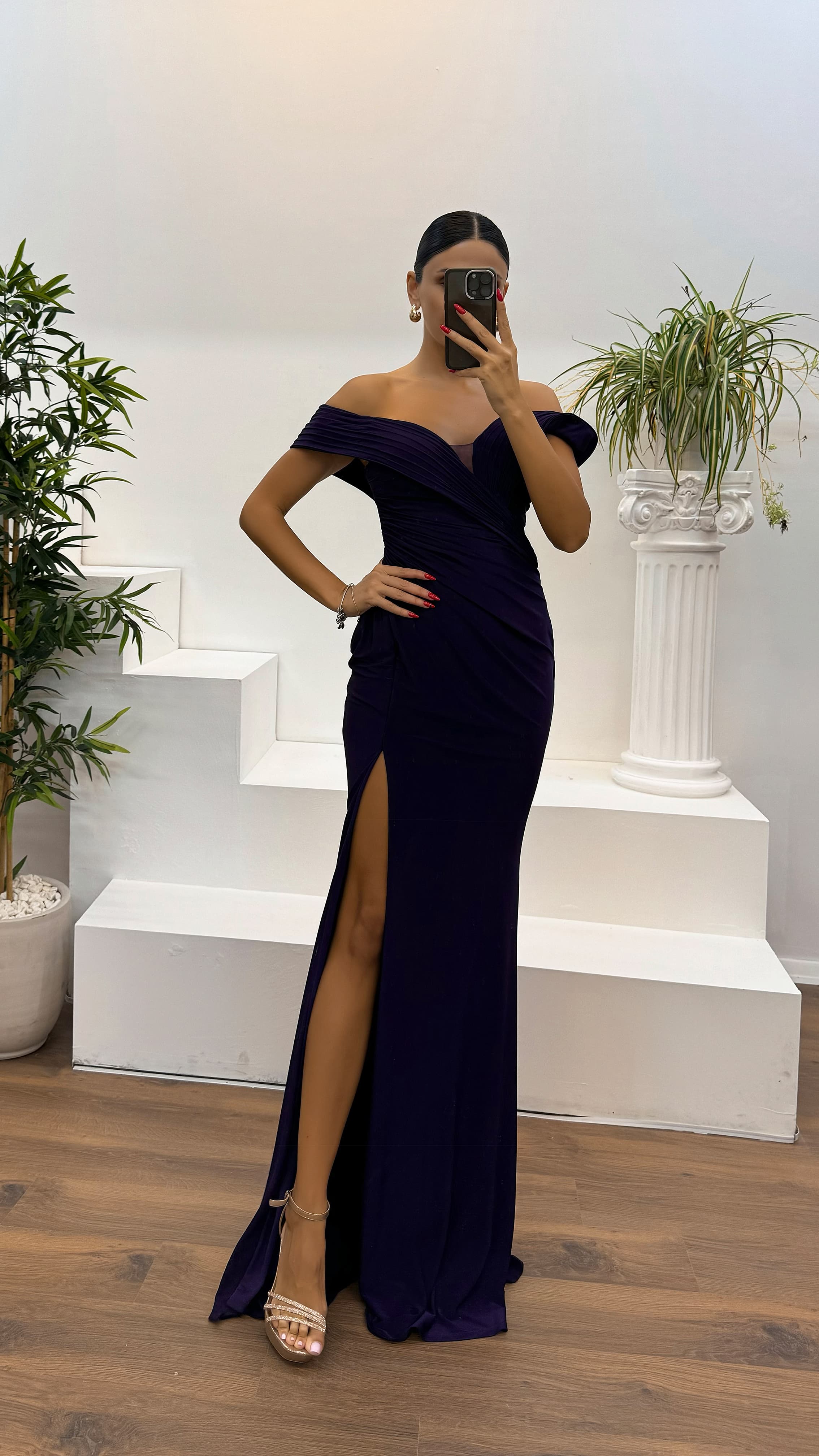 • Mor Kayık Yaka Drapeli Abiye Elbise