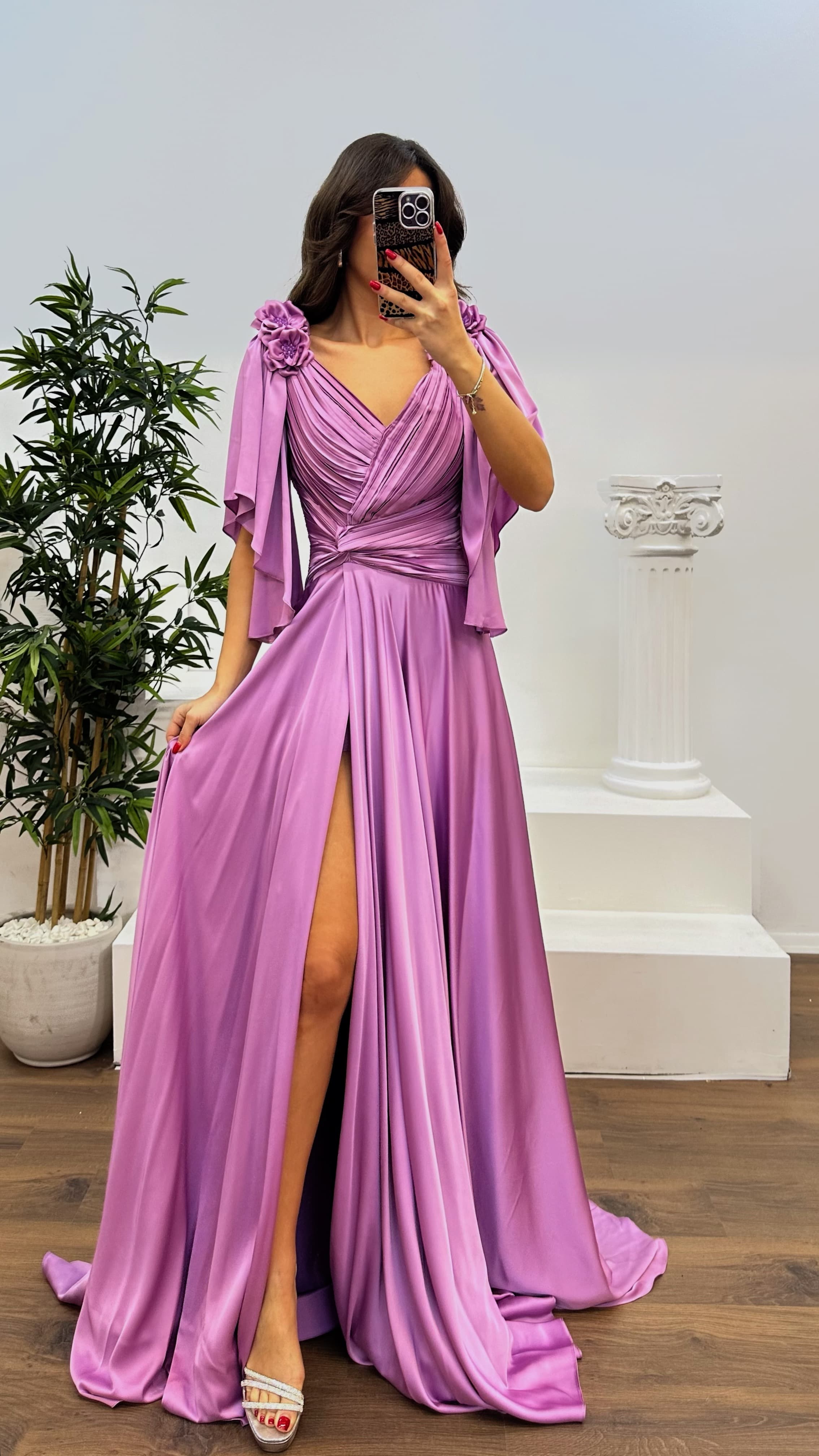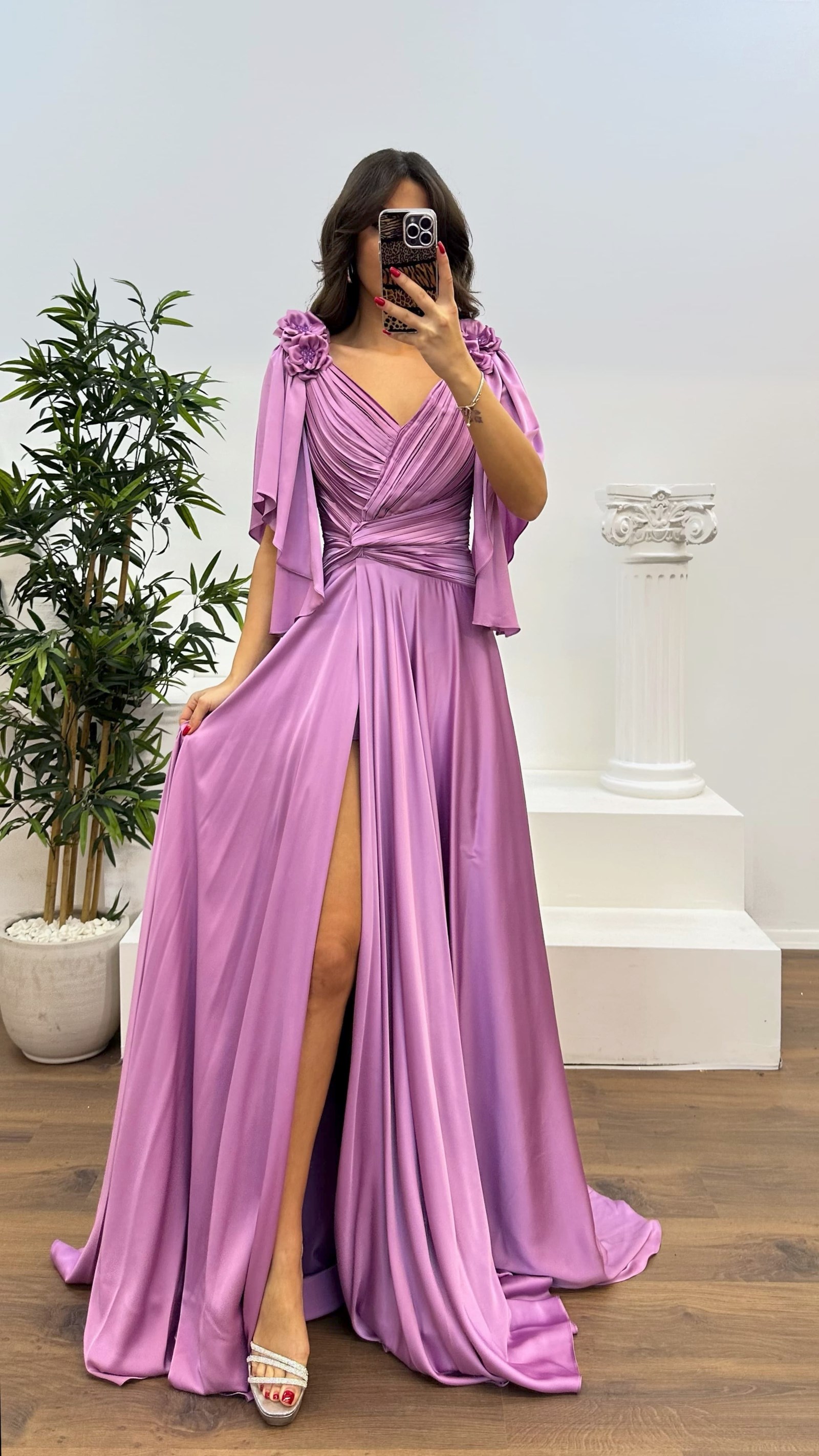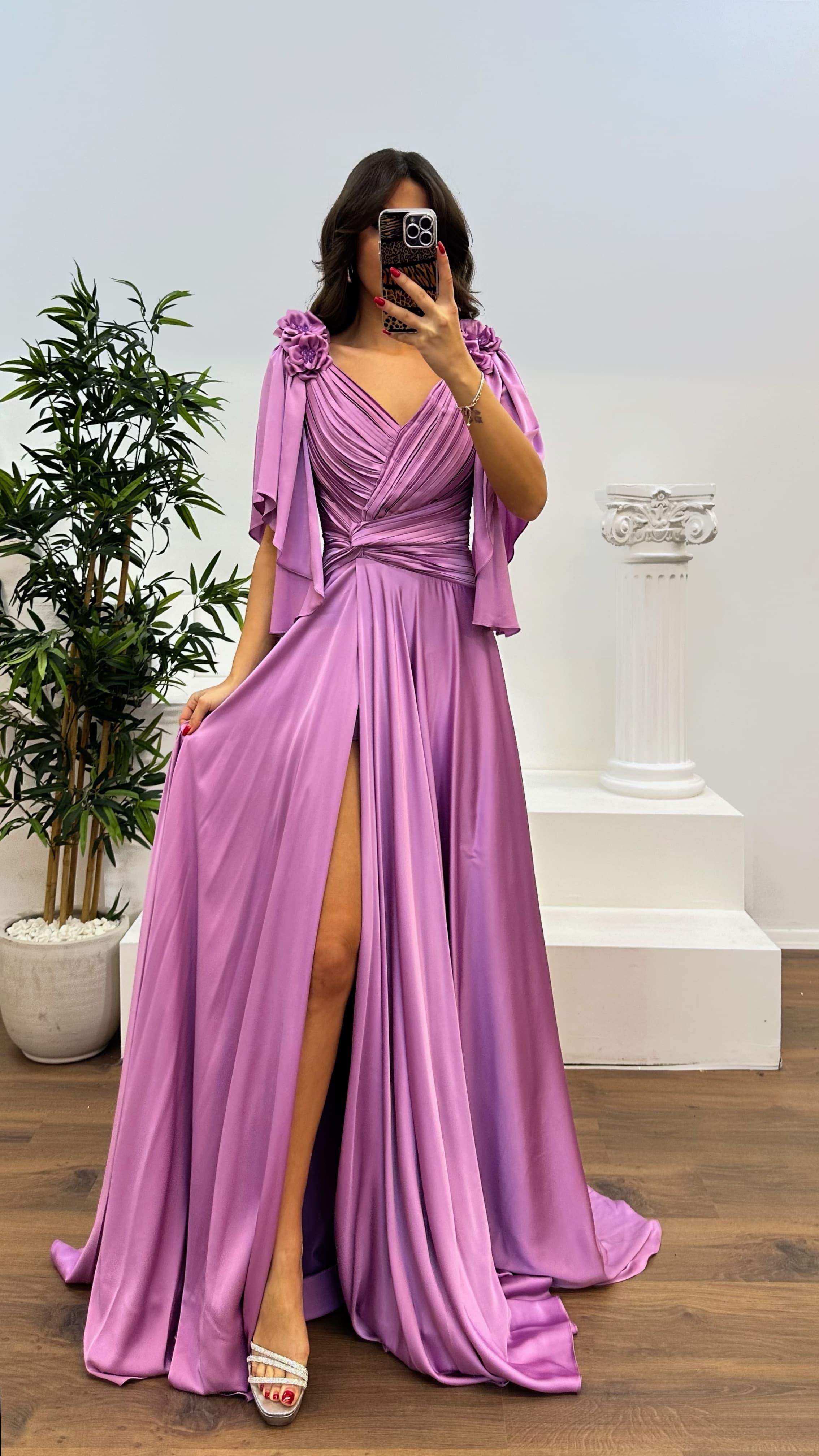 Abito da sera satinato con dettagli floreali Il prodotto è compatibile con le taglie 36-42, con imbottitura sul seno, foderato, con spacco, chiusura con cerniera sul retro e accessorio removibile. La lunghezza del prodotto può variare tra i 165-170 cm. Tipo di tessuto: satin di poliestere, viscosa.