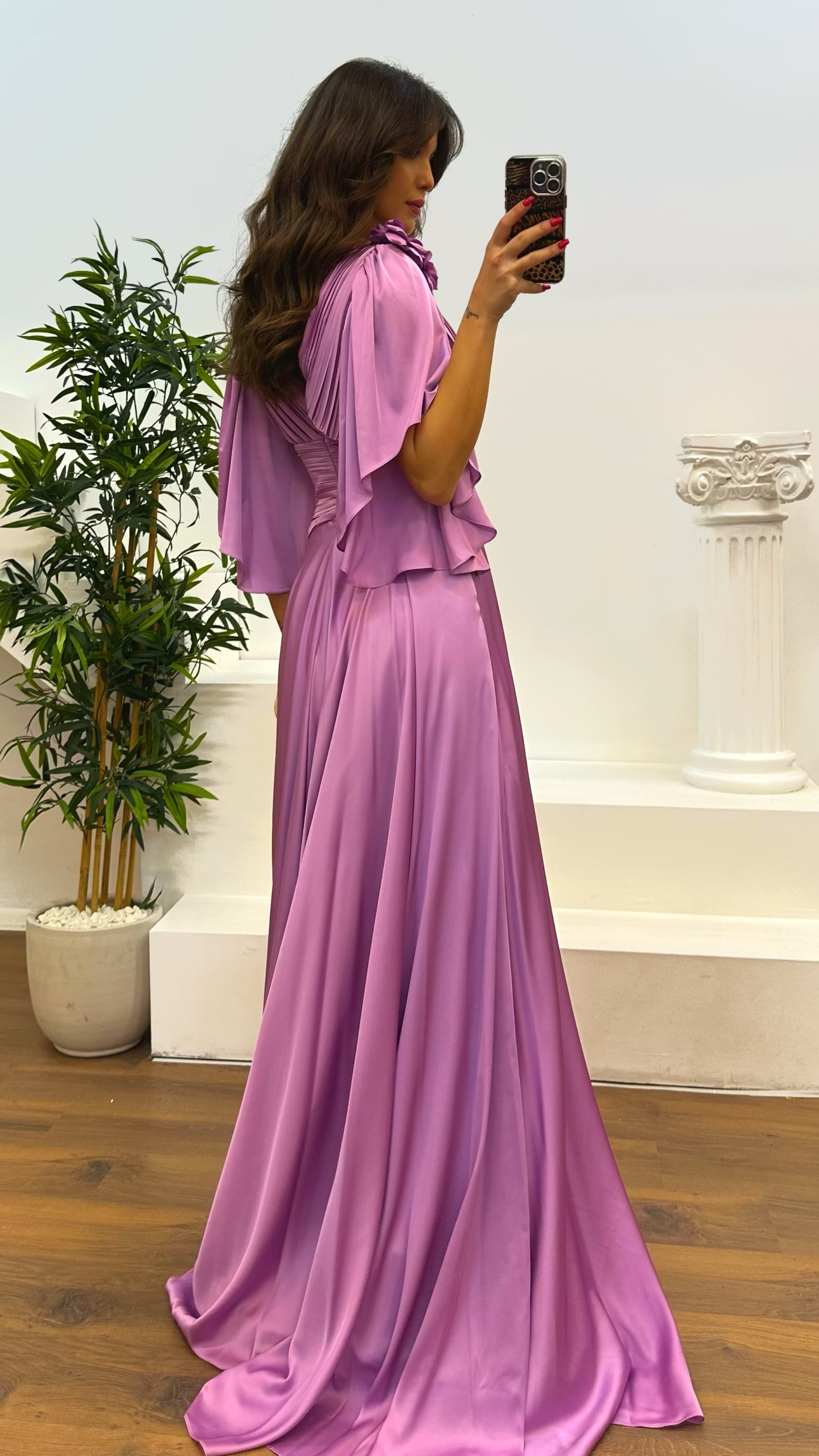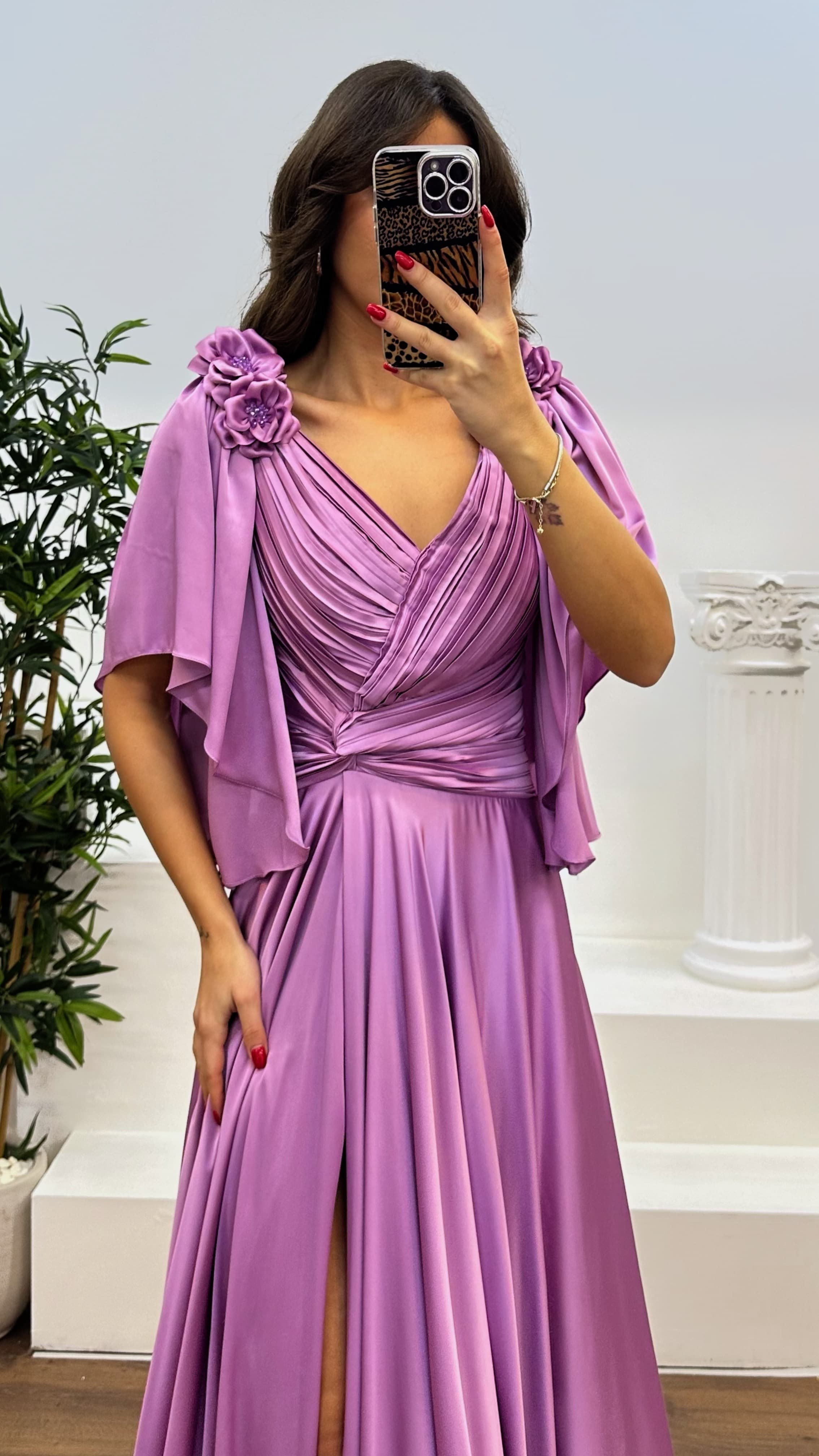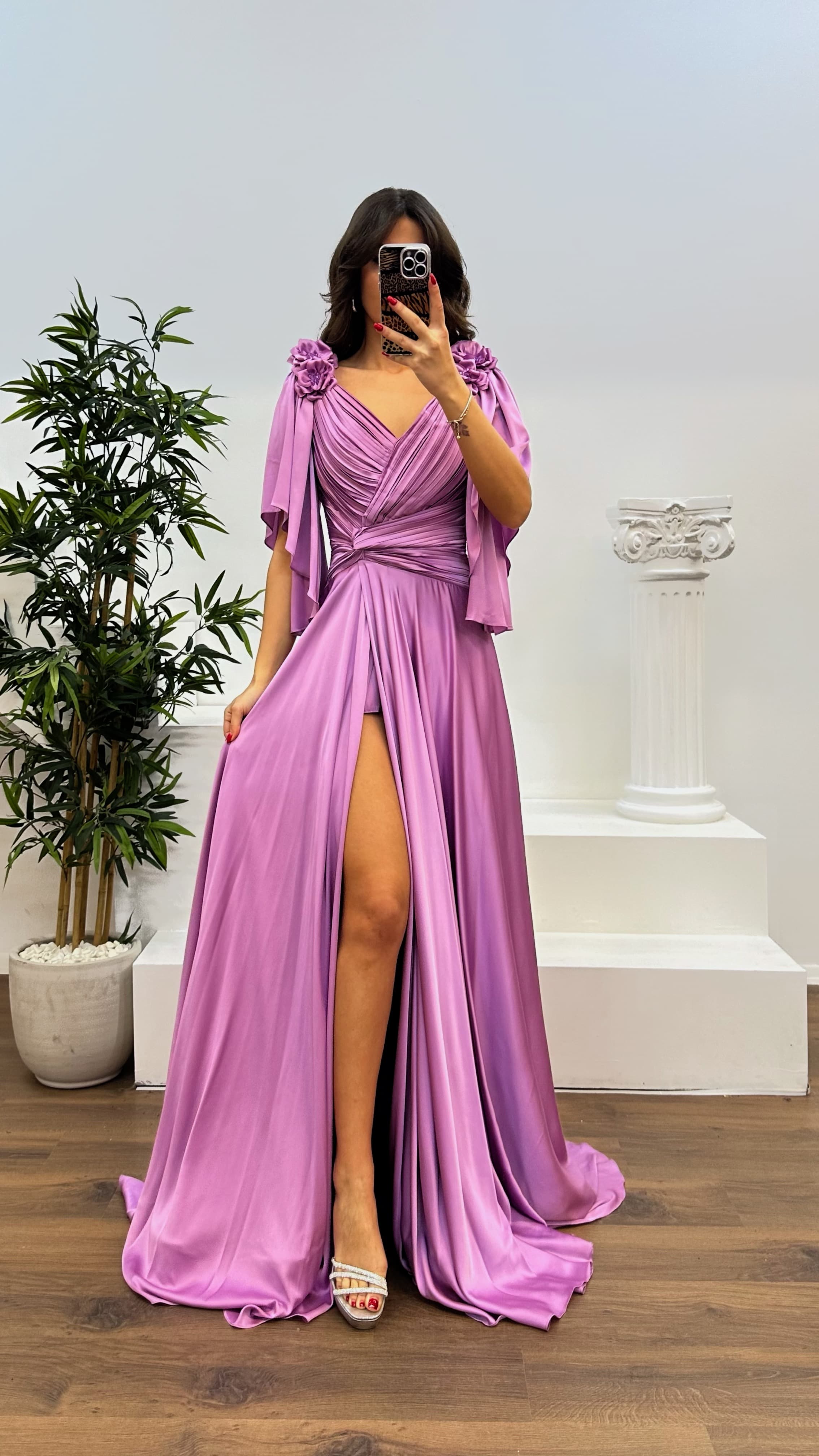 Abito da sera satinato con dettagli floreali Il prodotto è compatibile con le taglie 36-42, con imbottitura sul seno, foderato, con spacco, chiusura con cerniera sul retro e accessorio removibile. La lunghezza del prodotto può variare tra i 165-170 cm. Tipo di tessuto: satin di poliestere, viscosa.