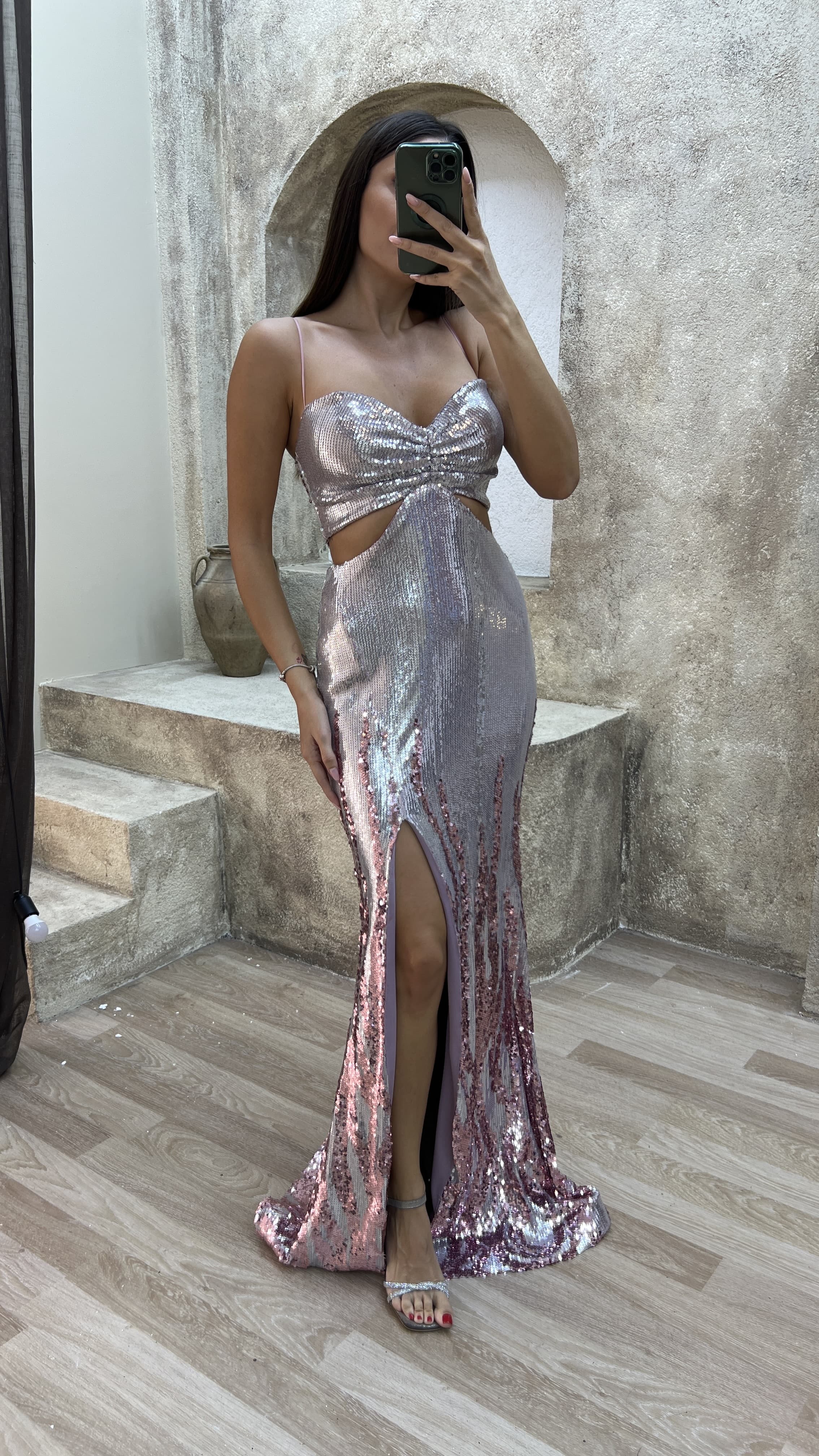 • İndigo İp Askılı Bel Detay Payet Abiye Elbise