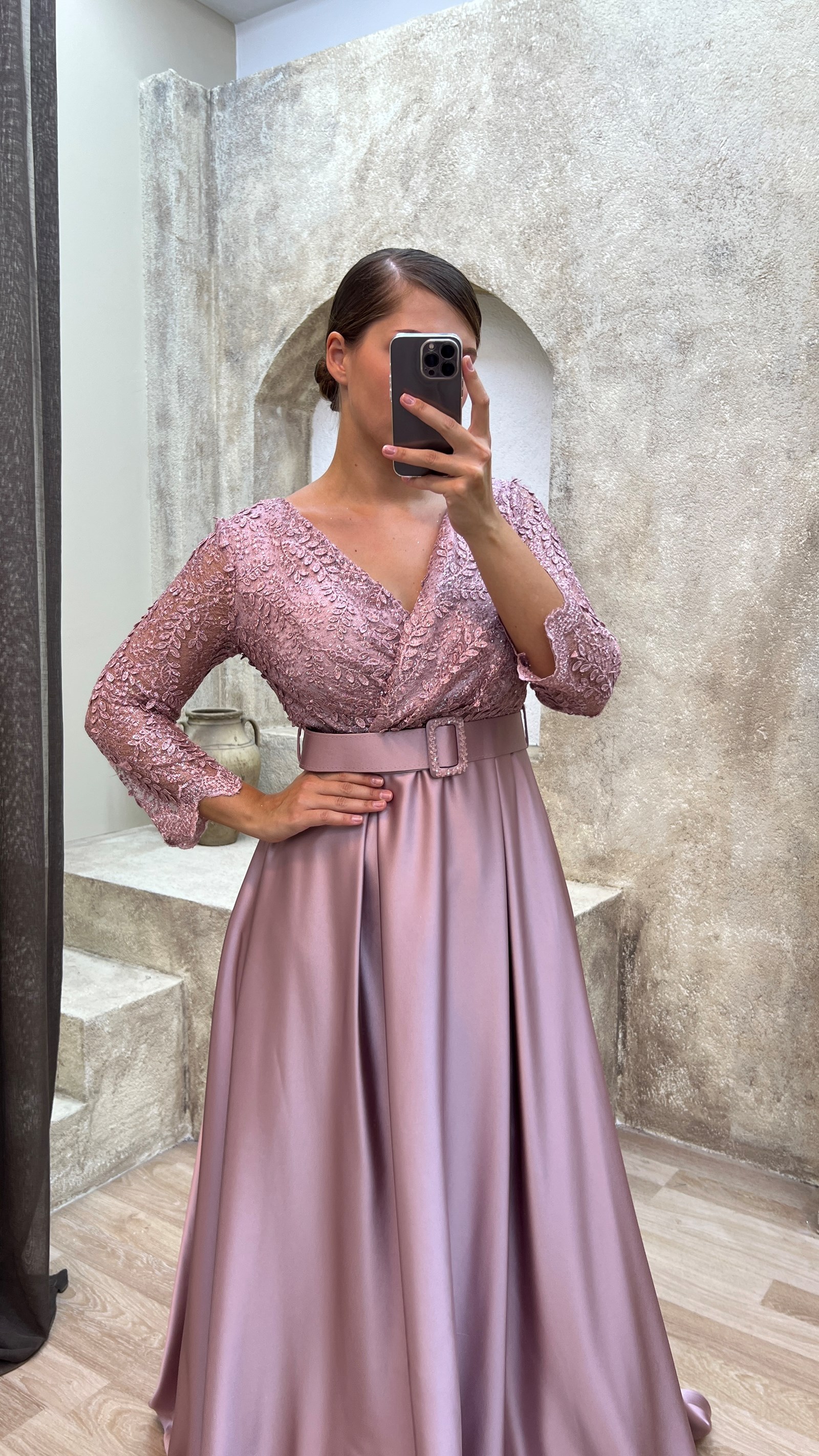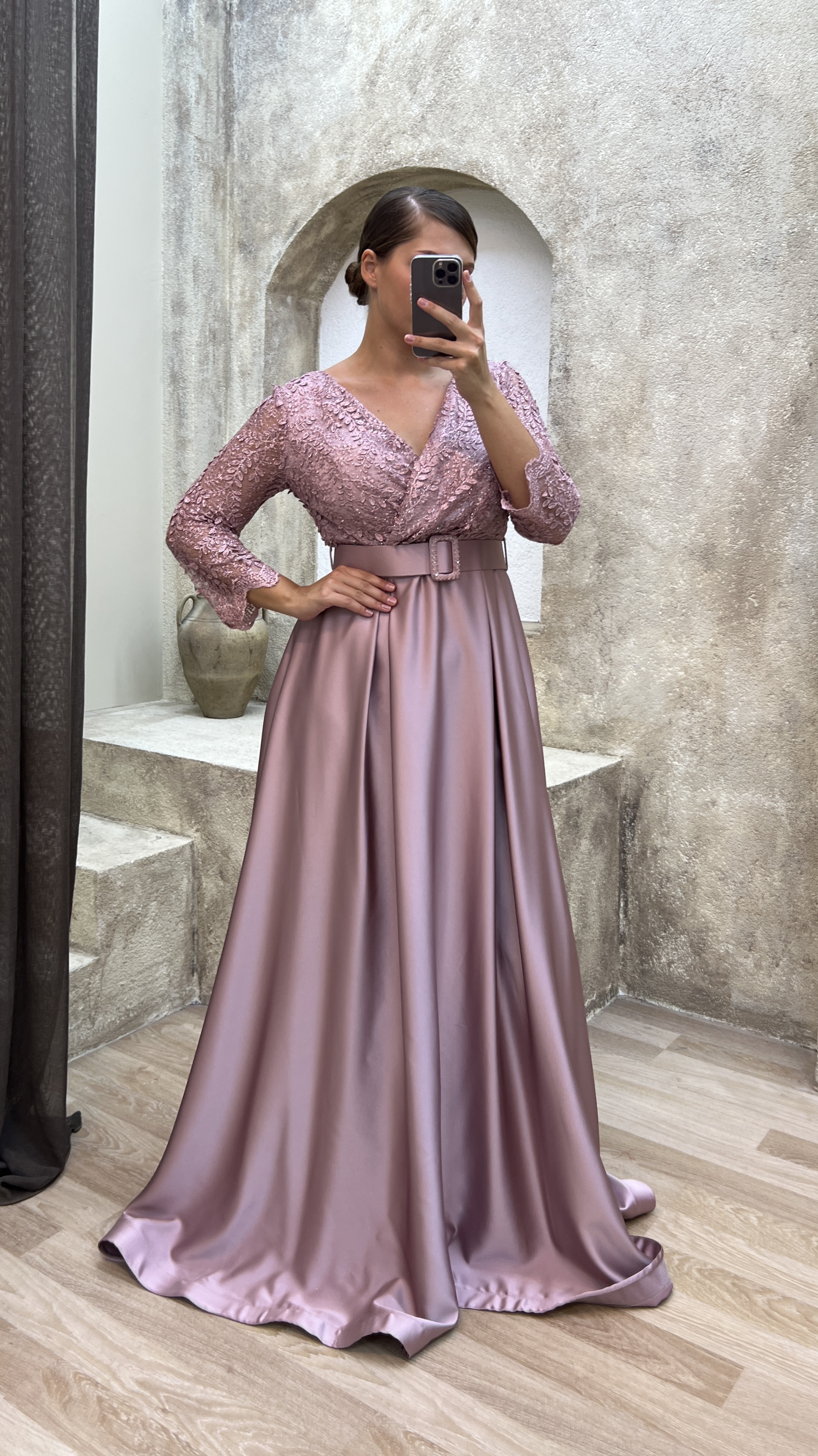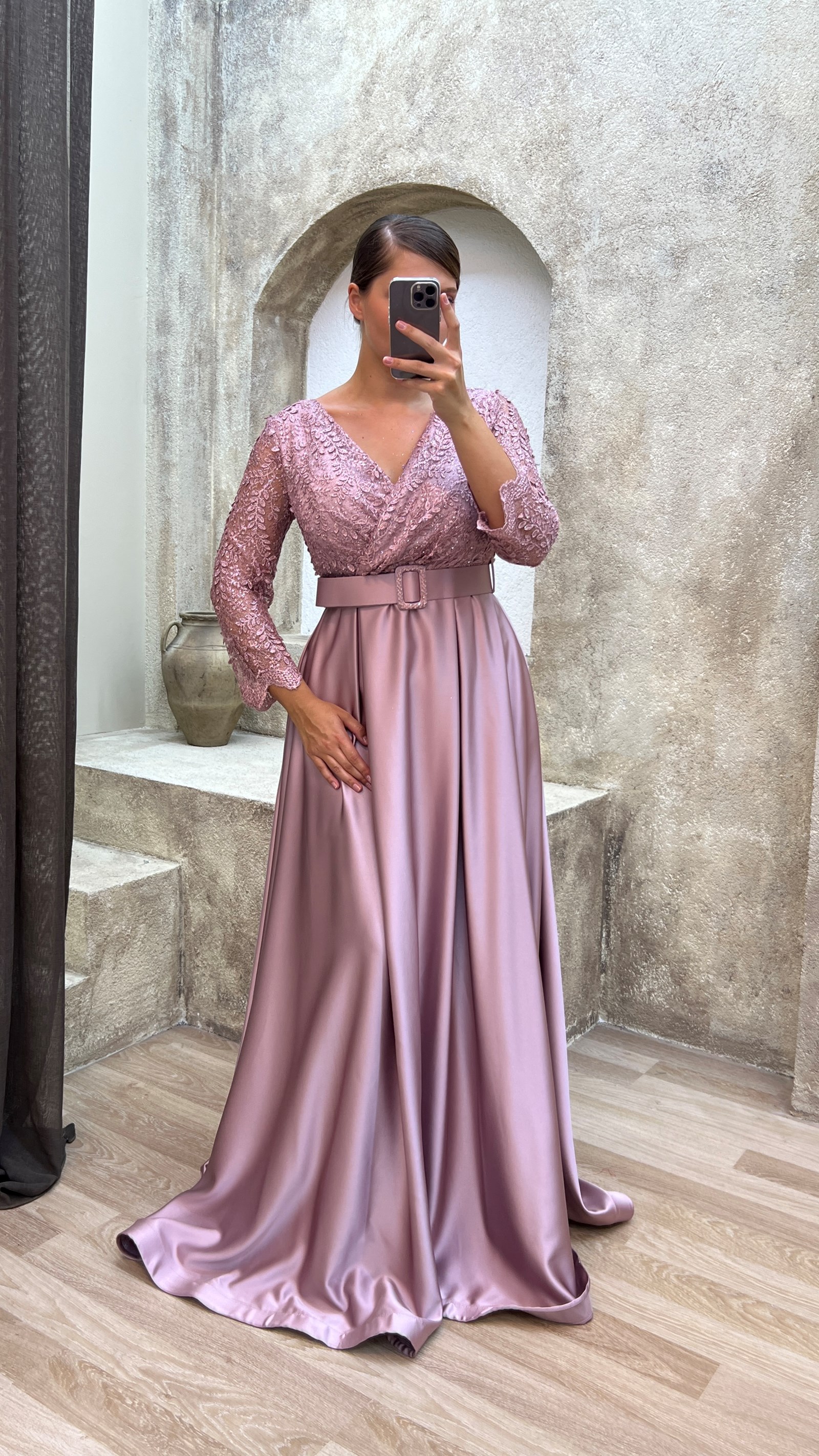 • Pudra Göğsü İşlemeli Kemerli Saten Abiye Elbise
