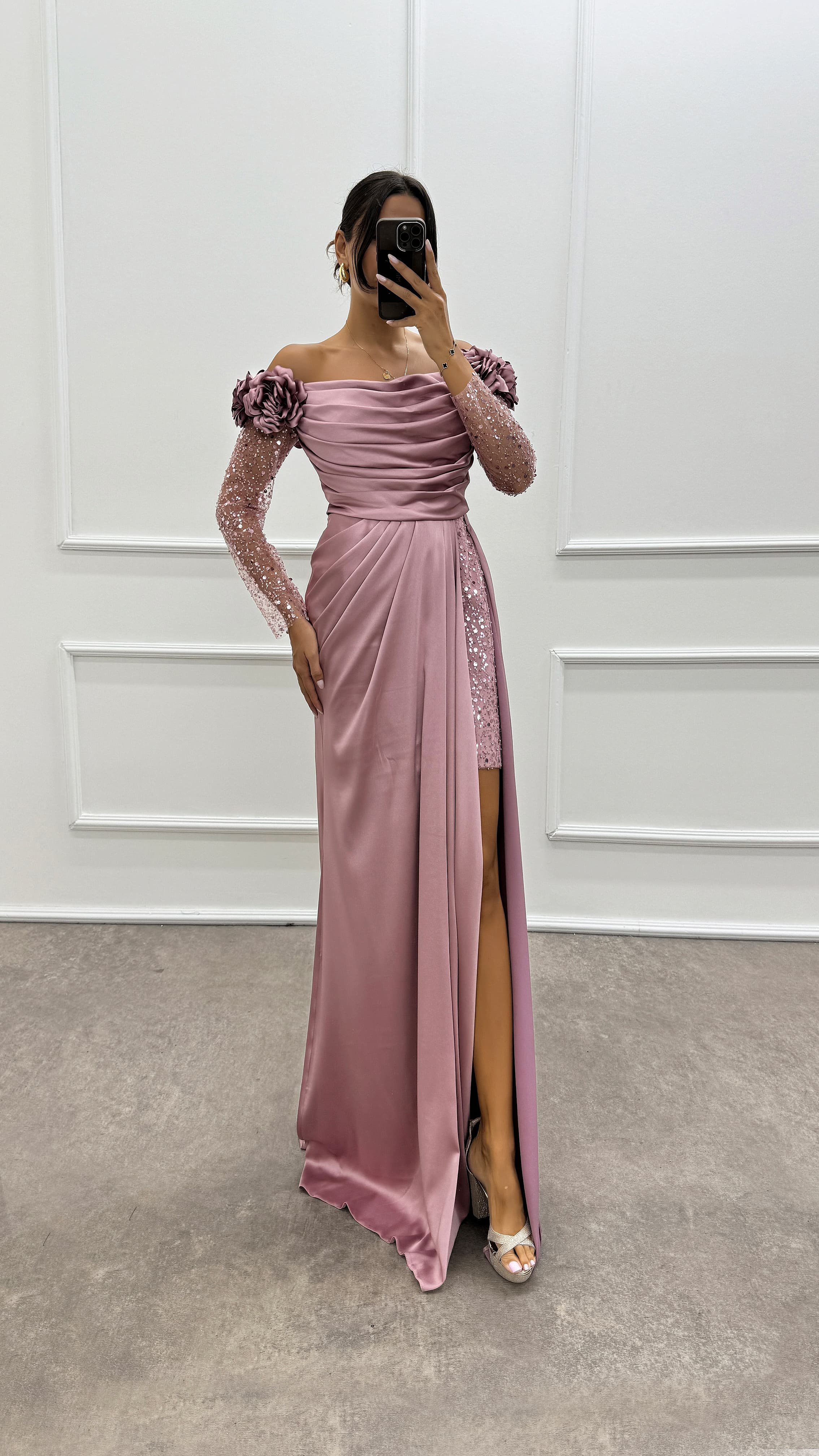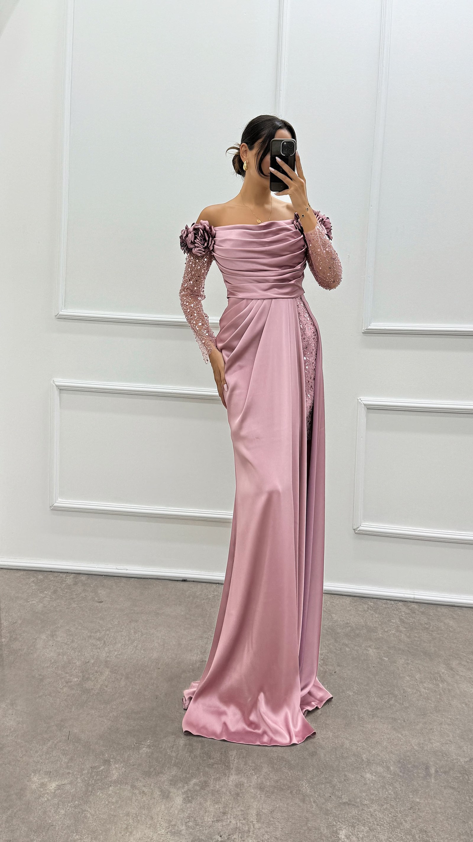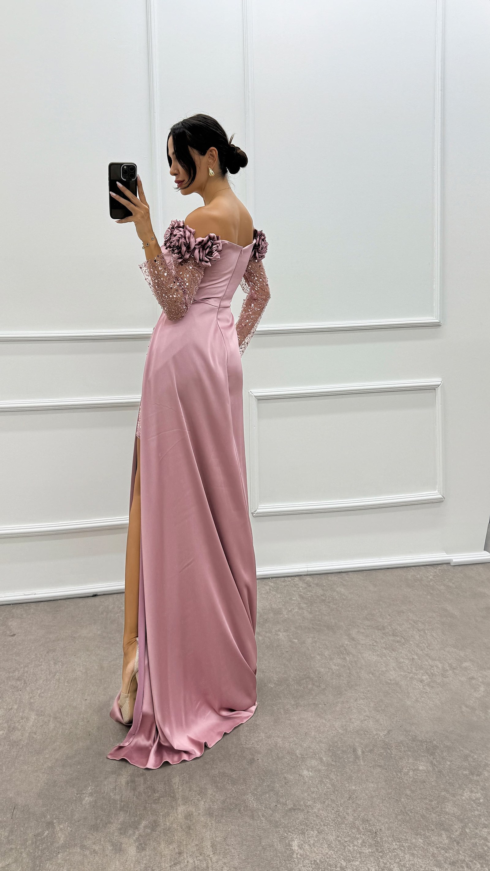 • Pudra Omuzları Çiçekli Kolları Tül Tasarım Saten Abiye Elbise