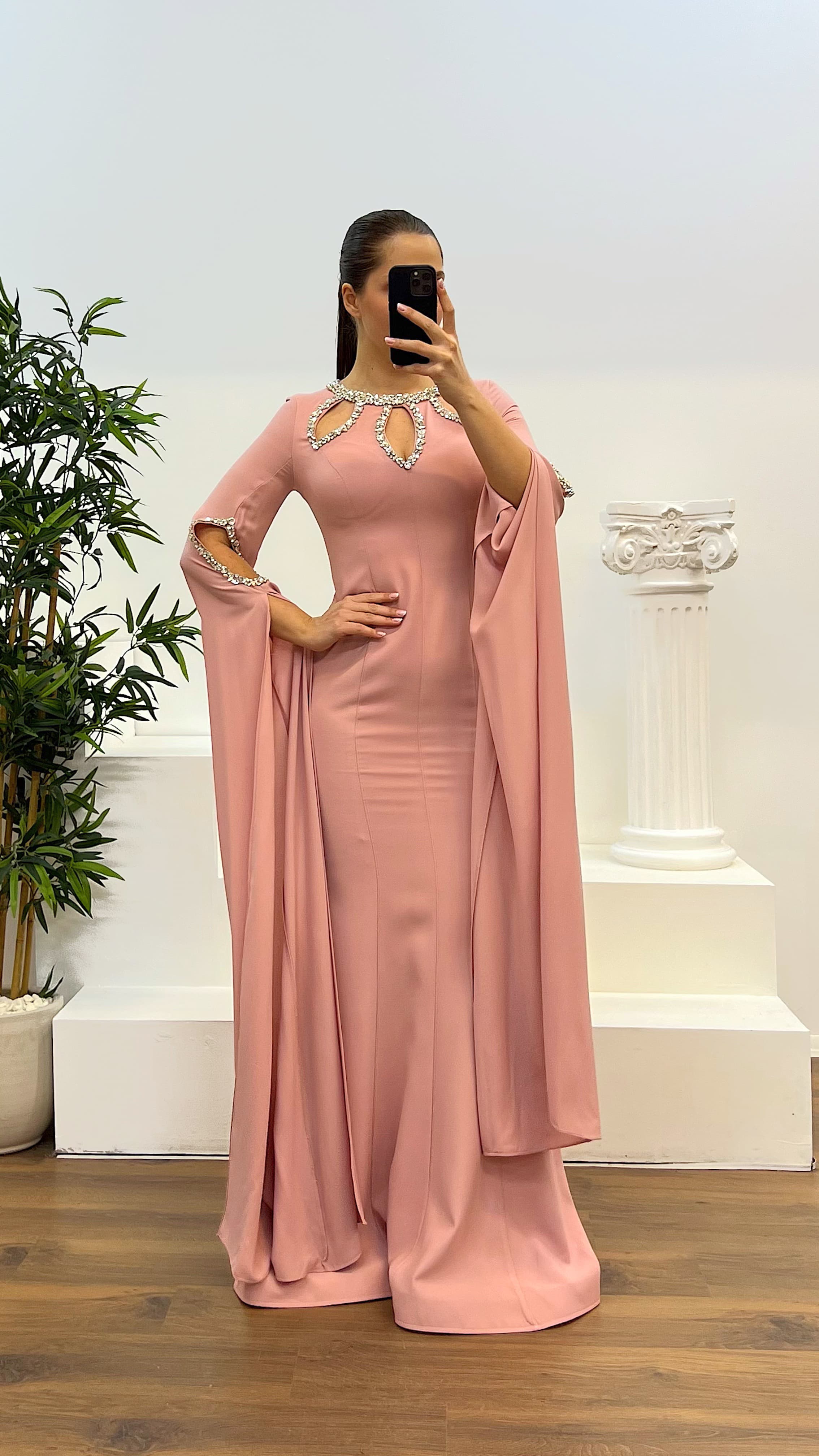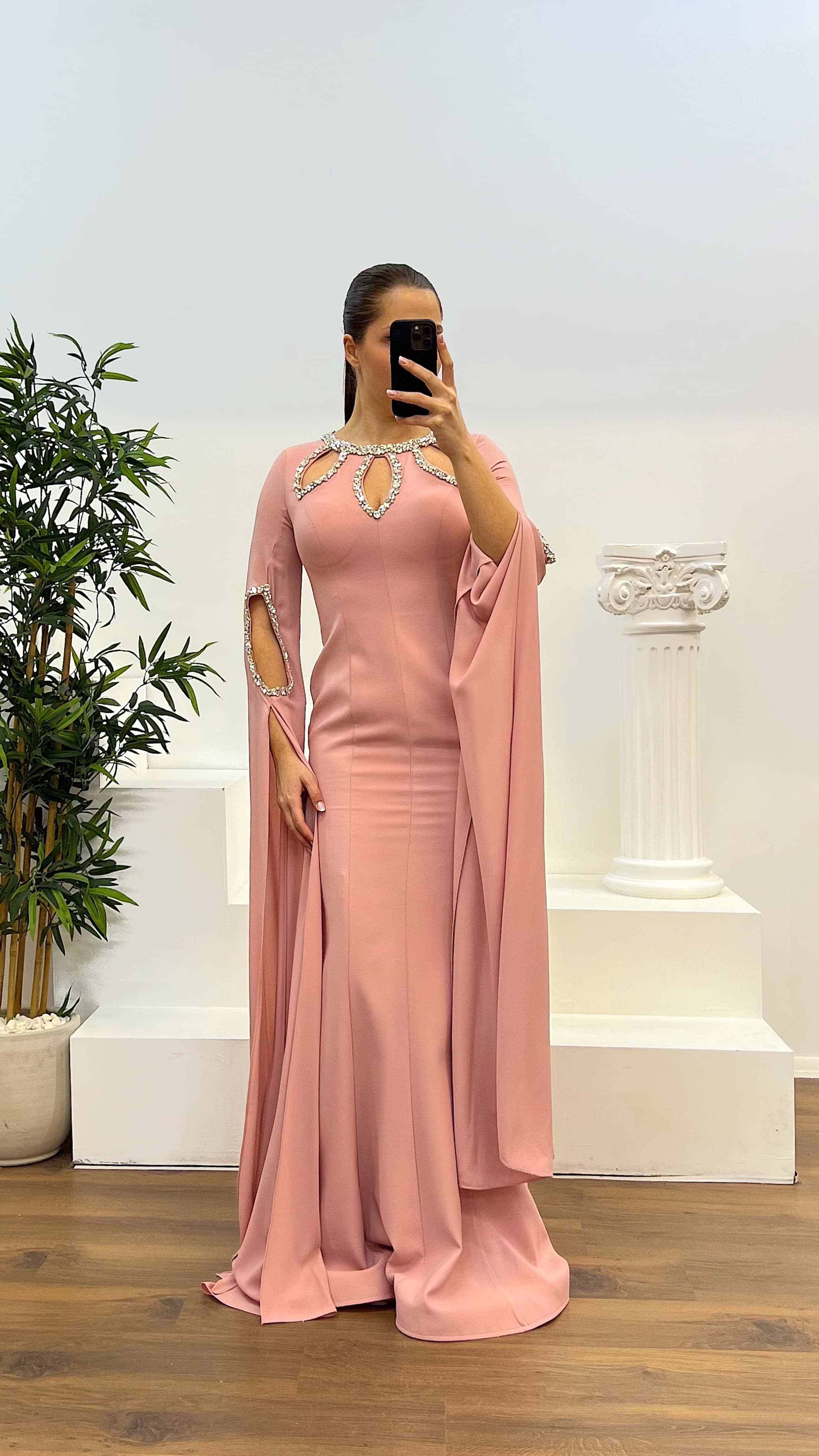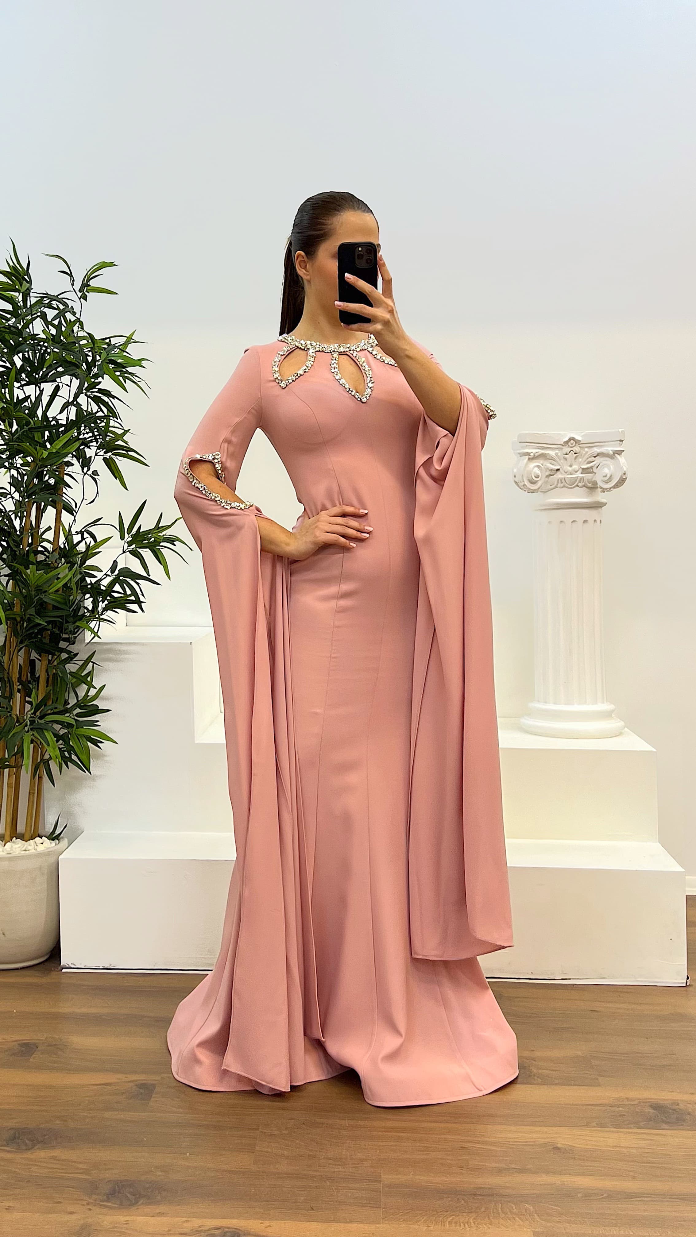 • Pudra Taş Detay Büyük Beden Abiye Elbise