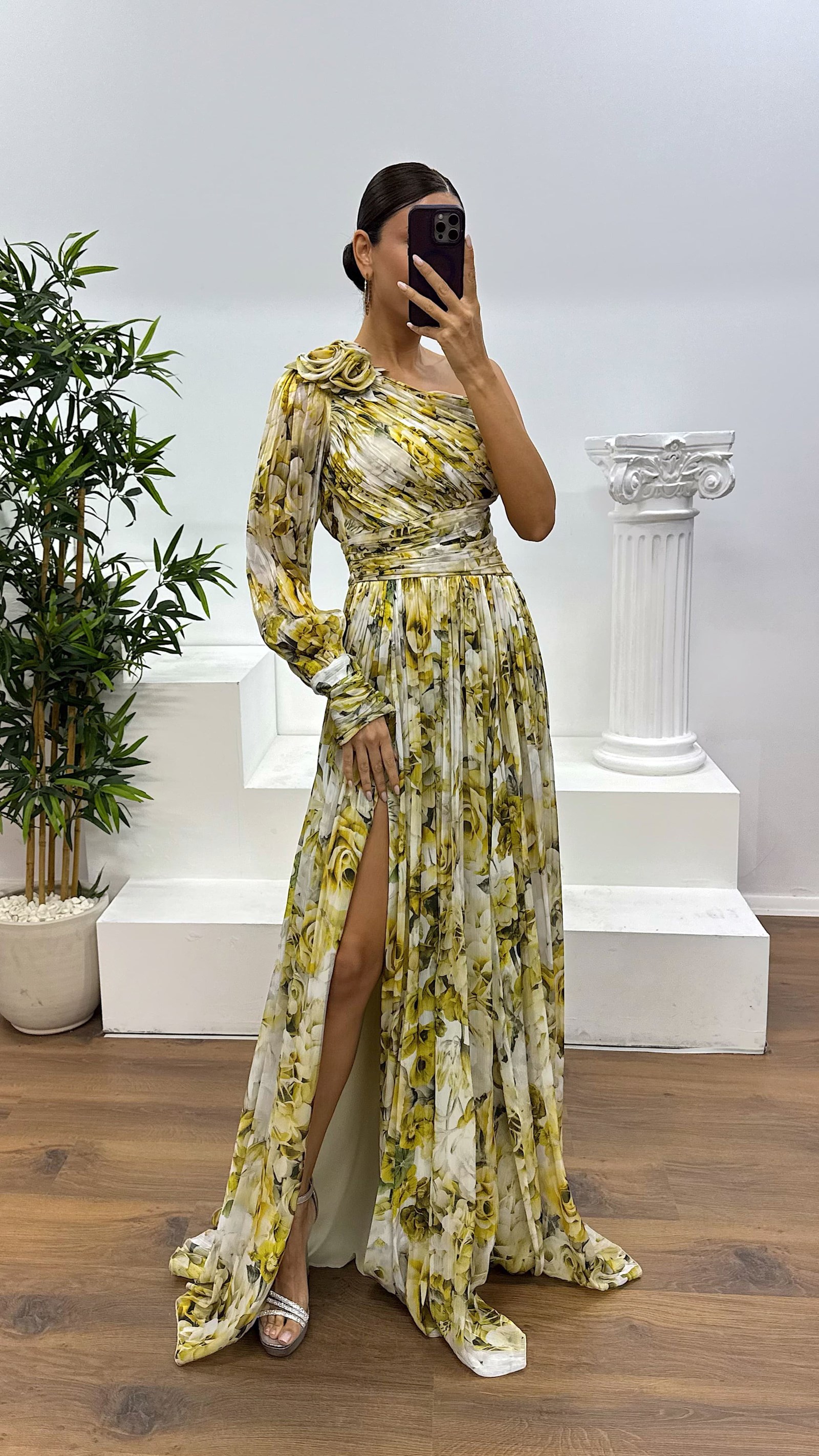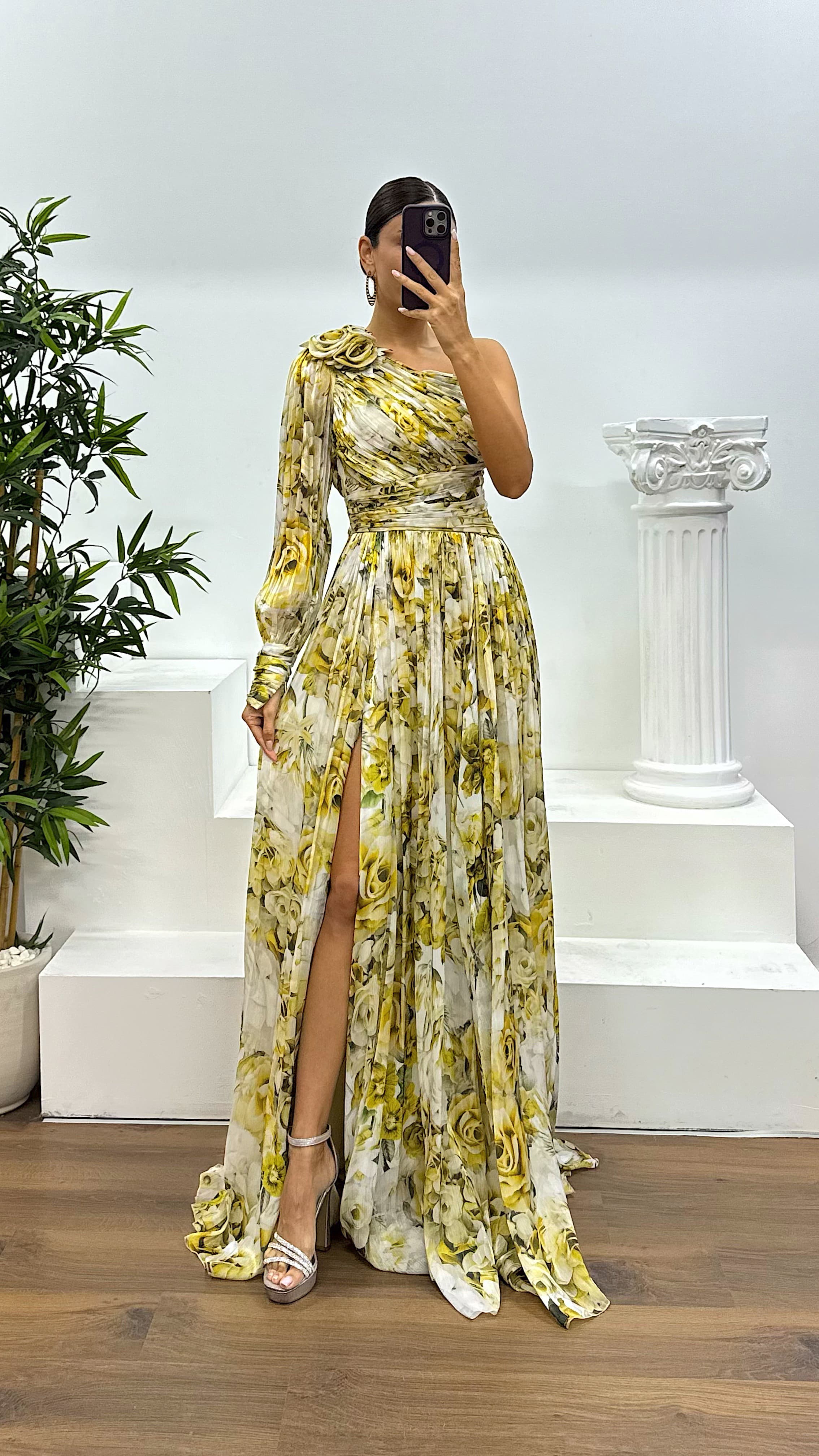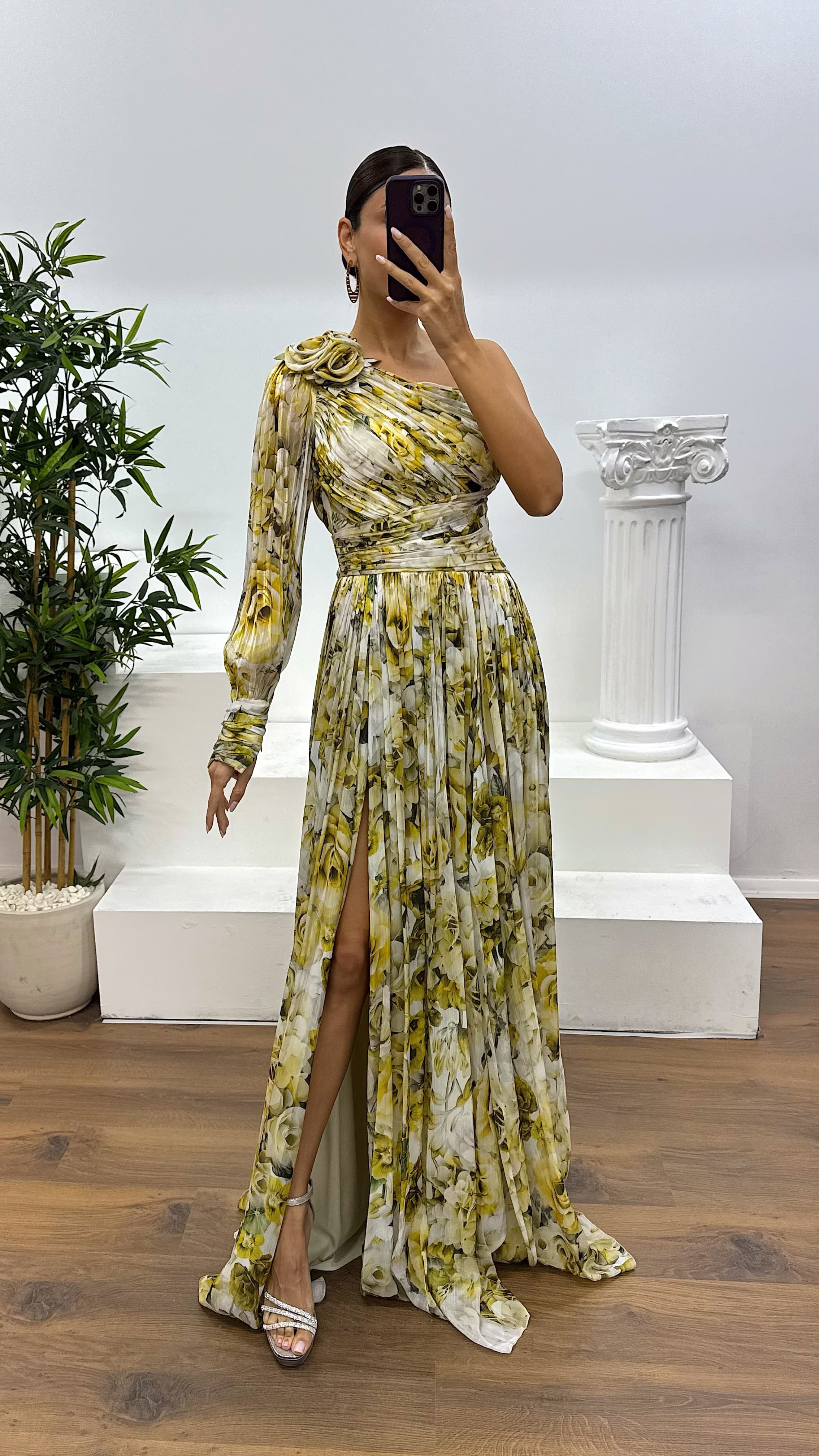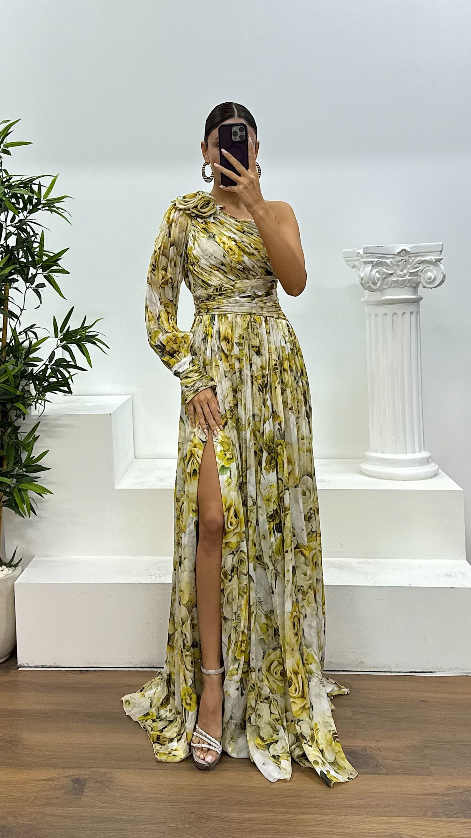 • Kemik Yeşil Tek Kol Desenli Abiye Elbise