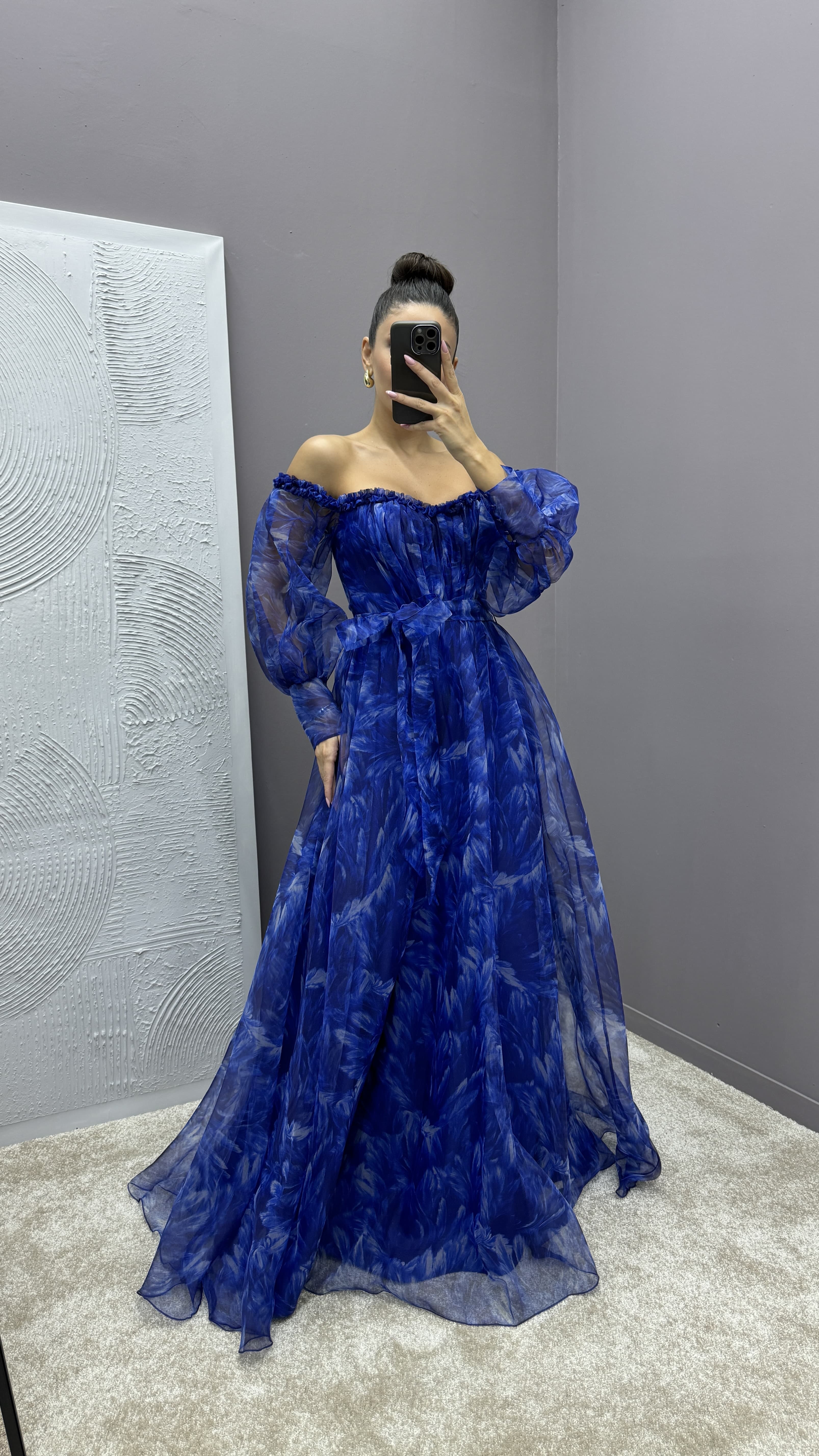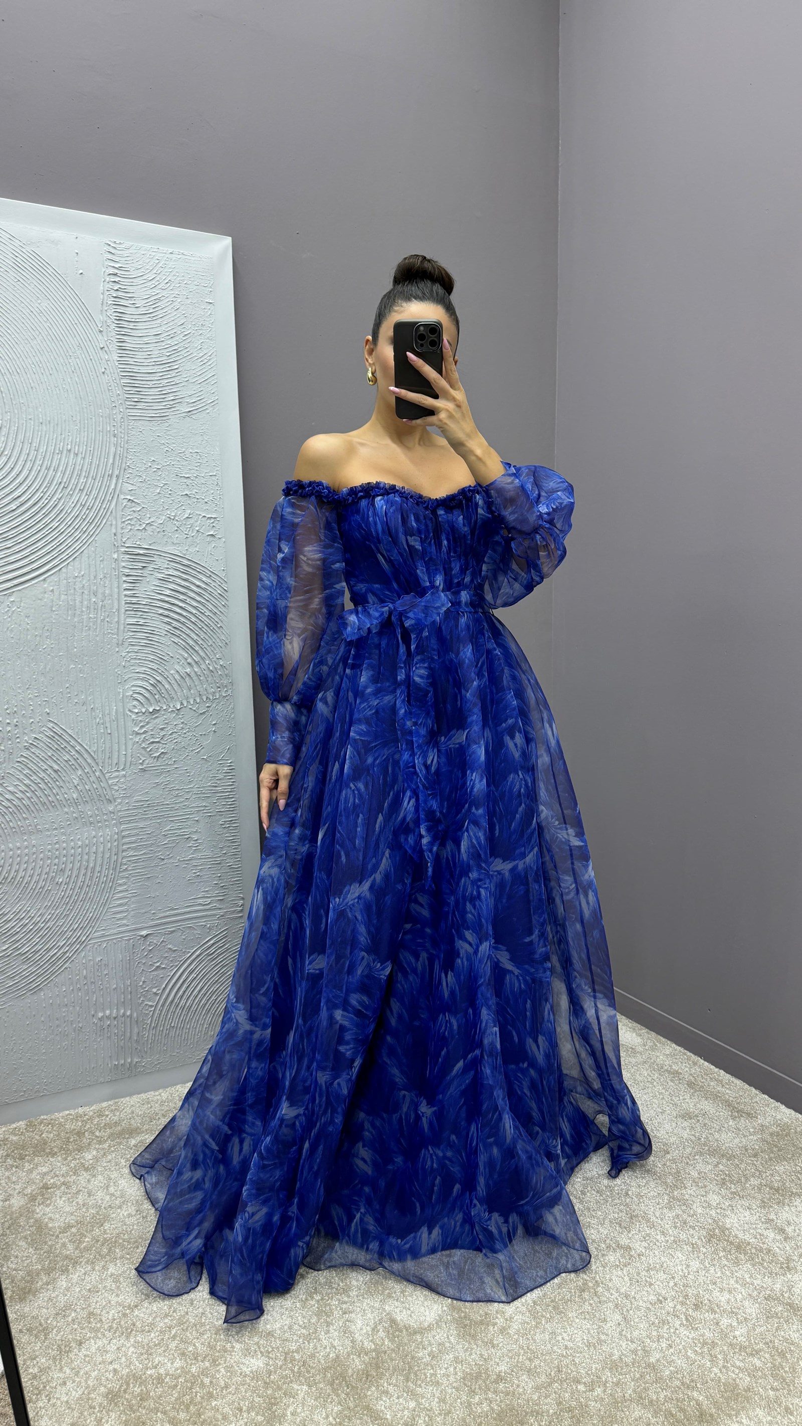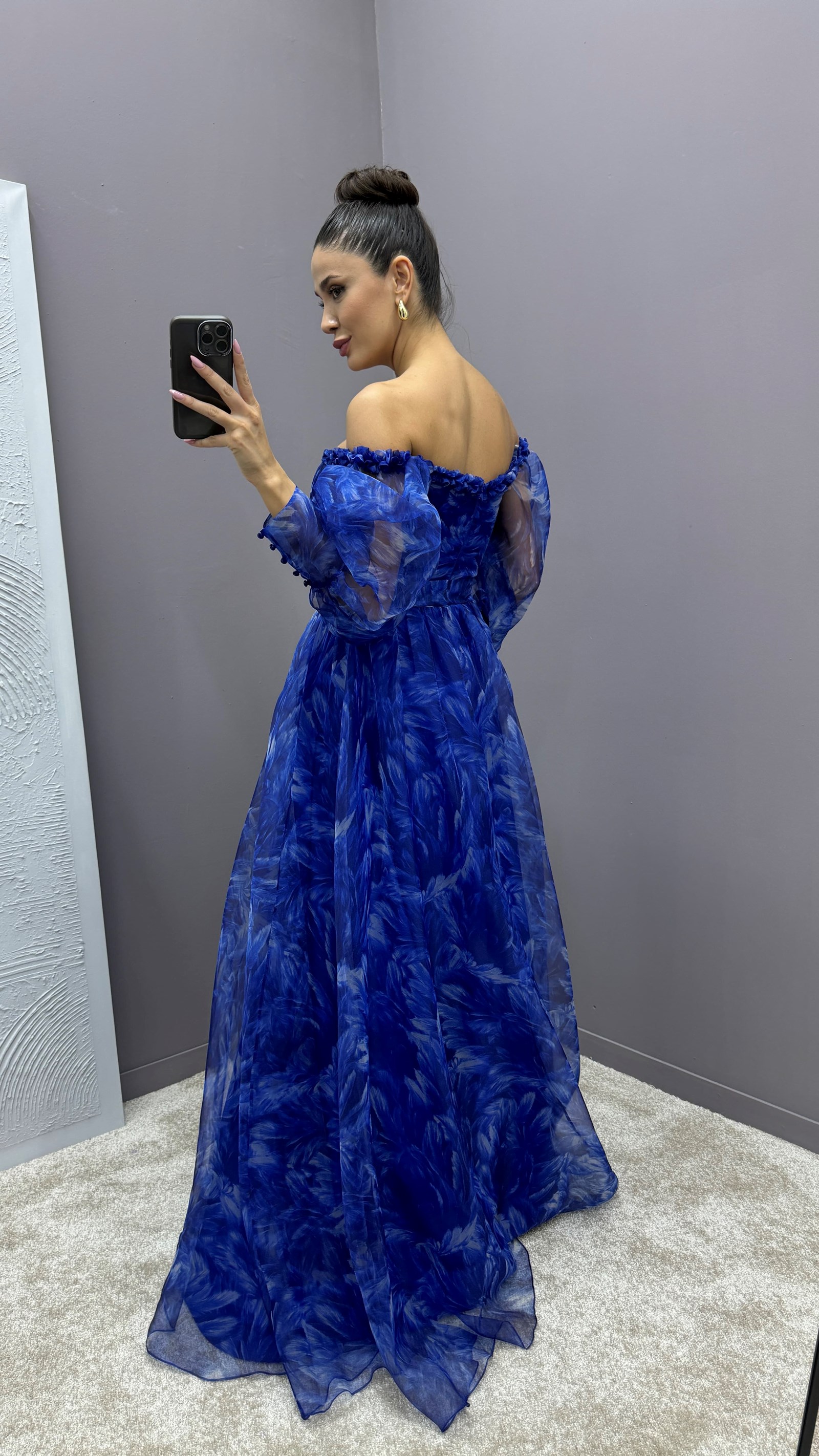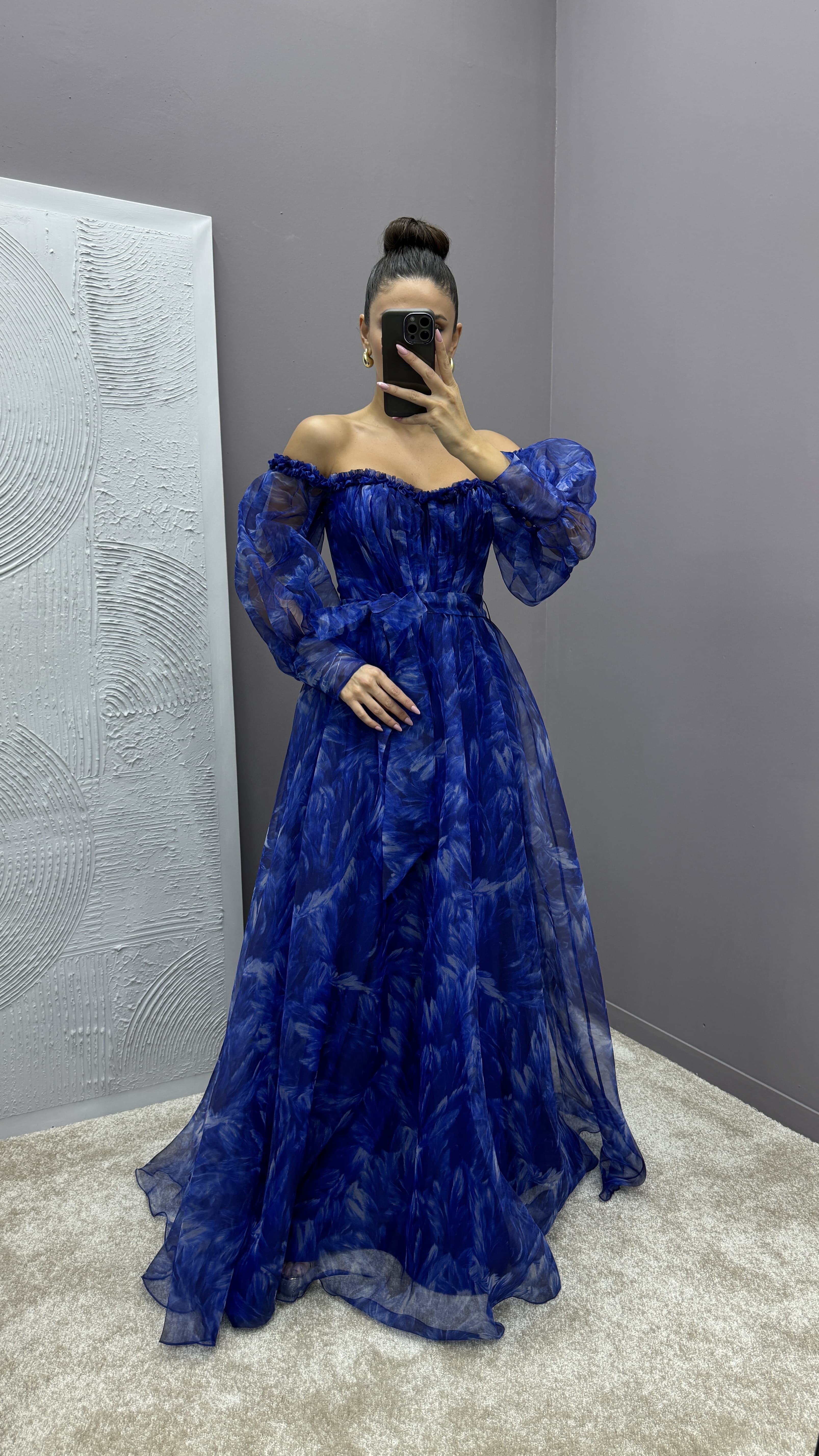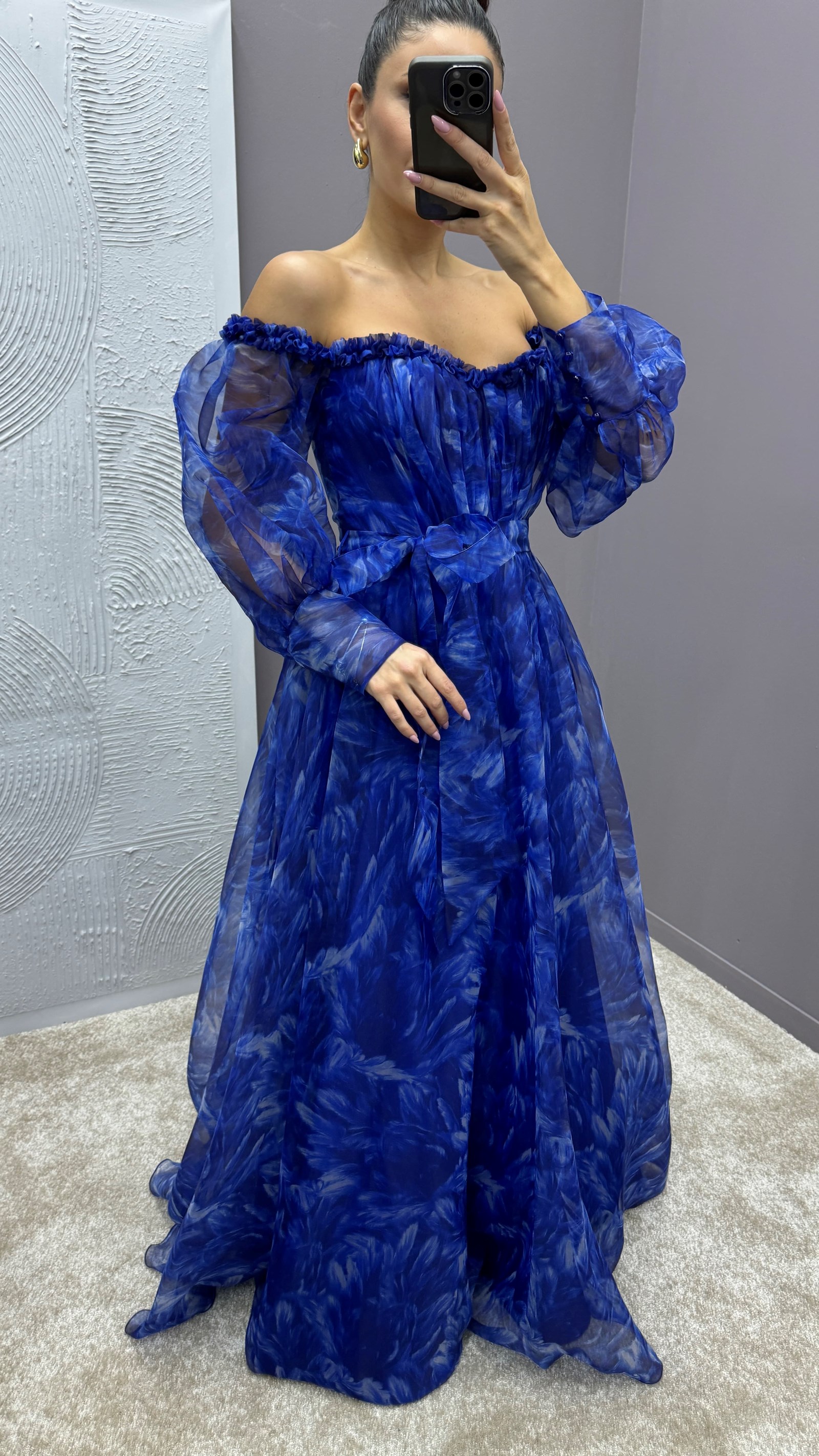 • Saks Balon Kol Göğsü Fırfırlı Desenli Tasarım Elbise