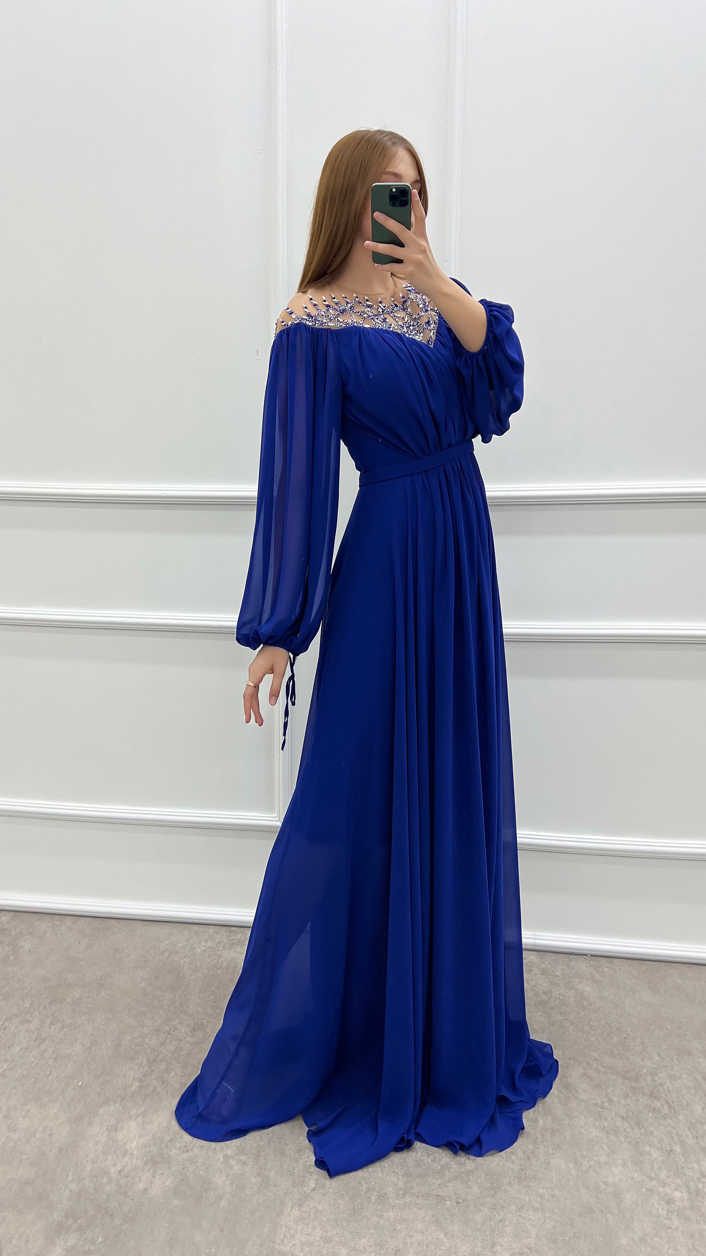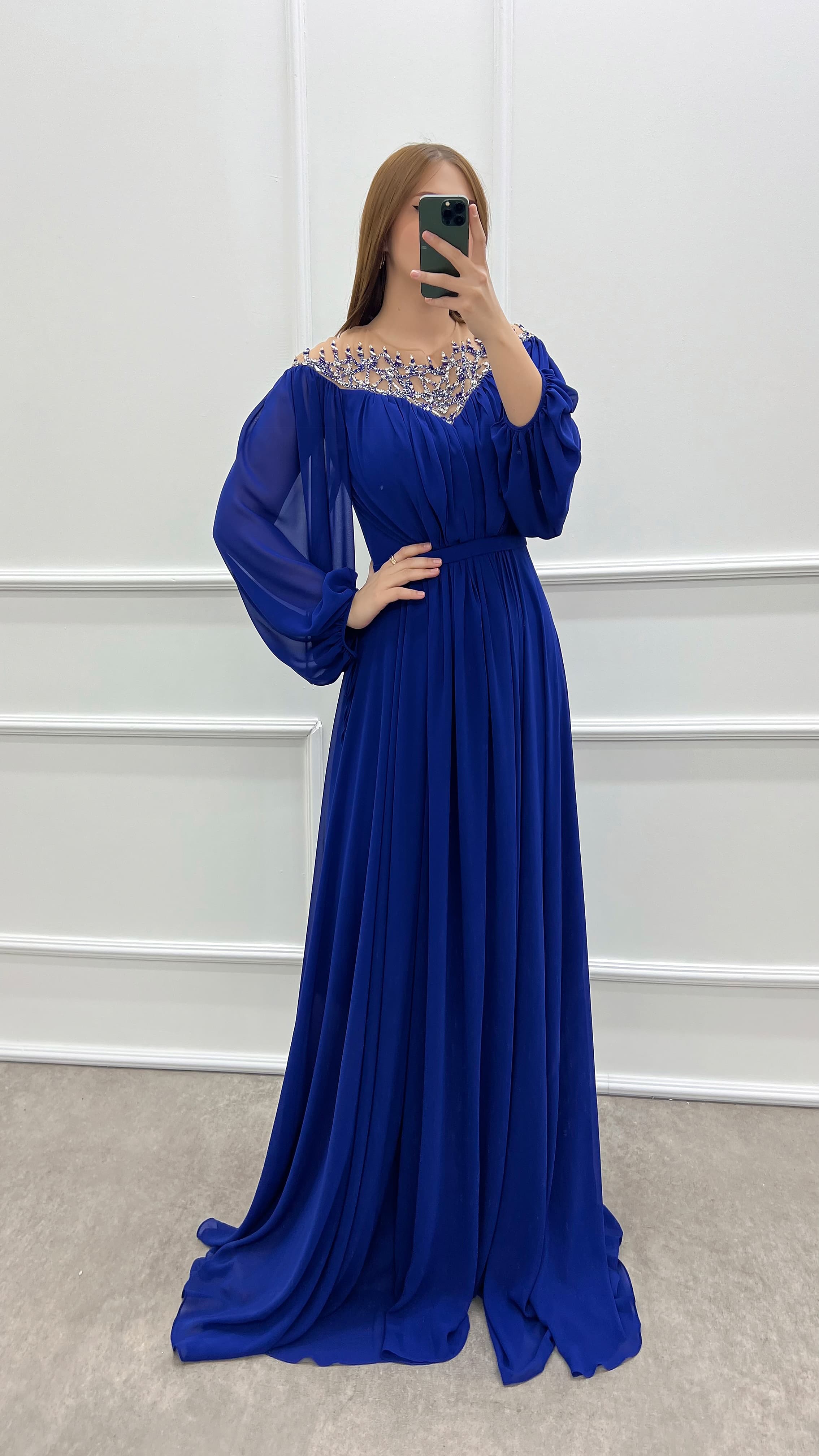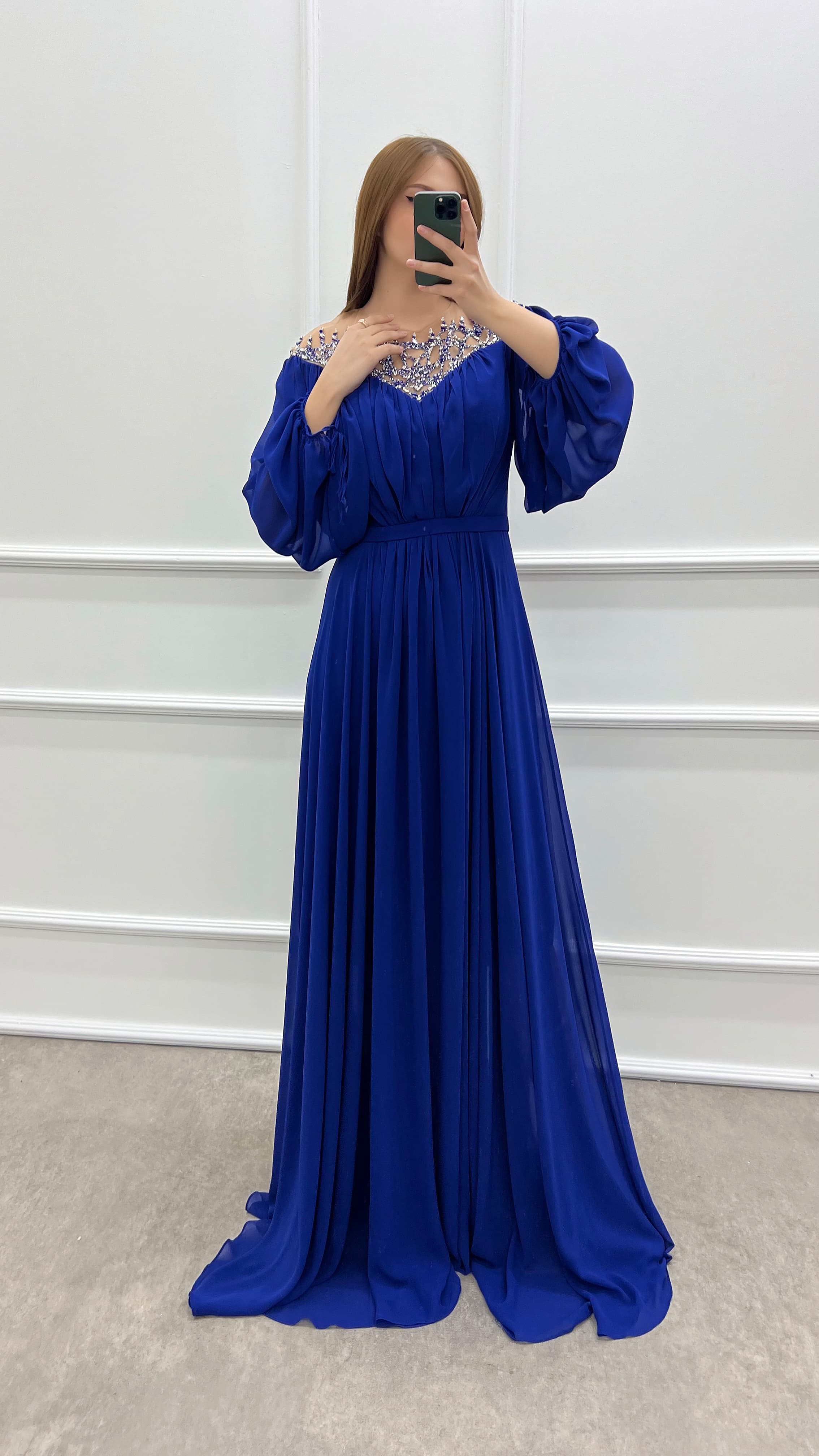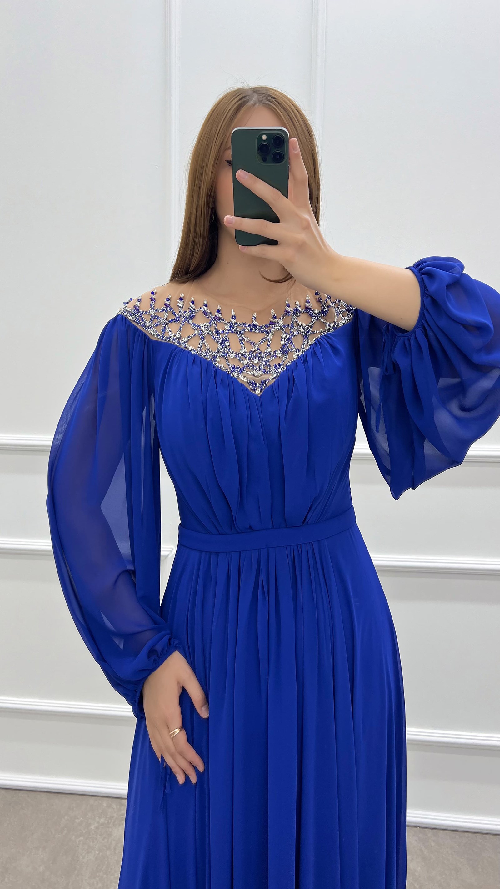 • Saks Göğsü Taşlı Balon Kol Şifon Büyük Beden Elbise