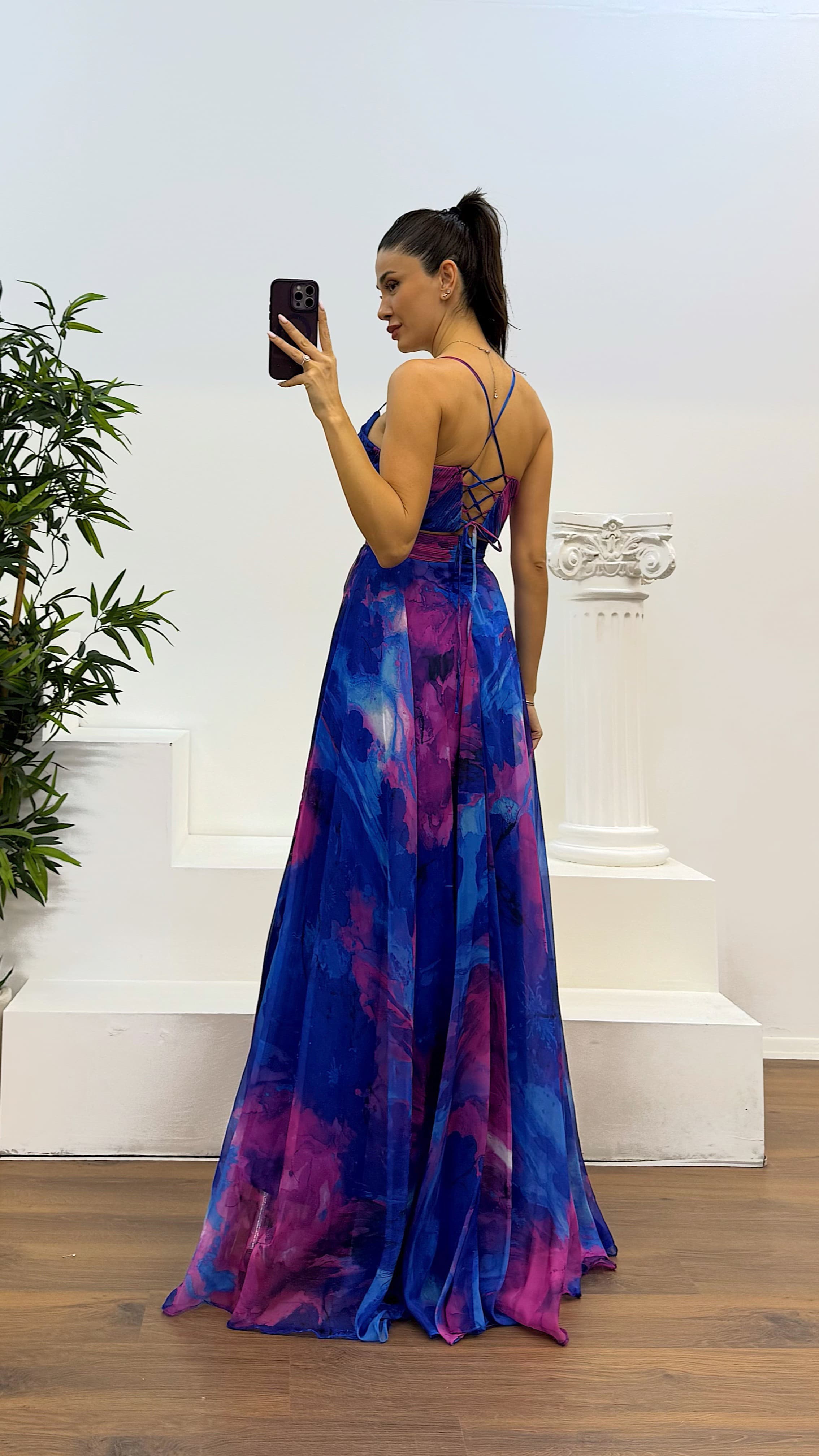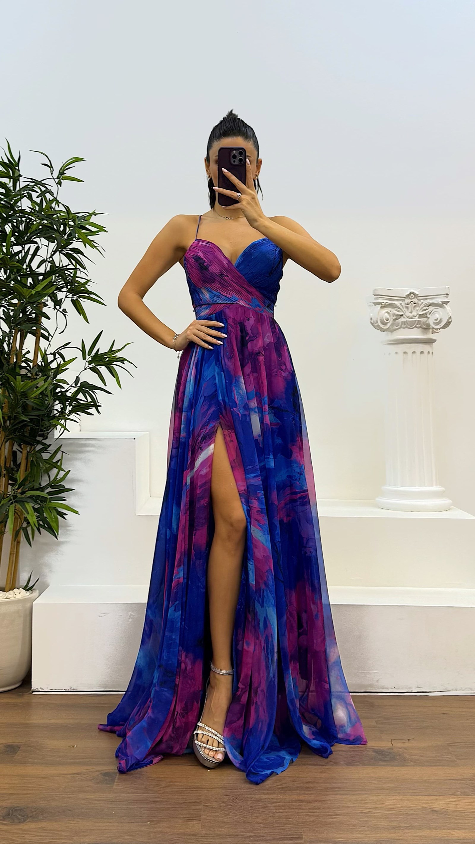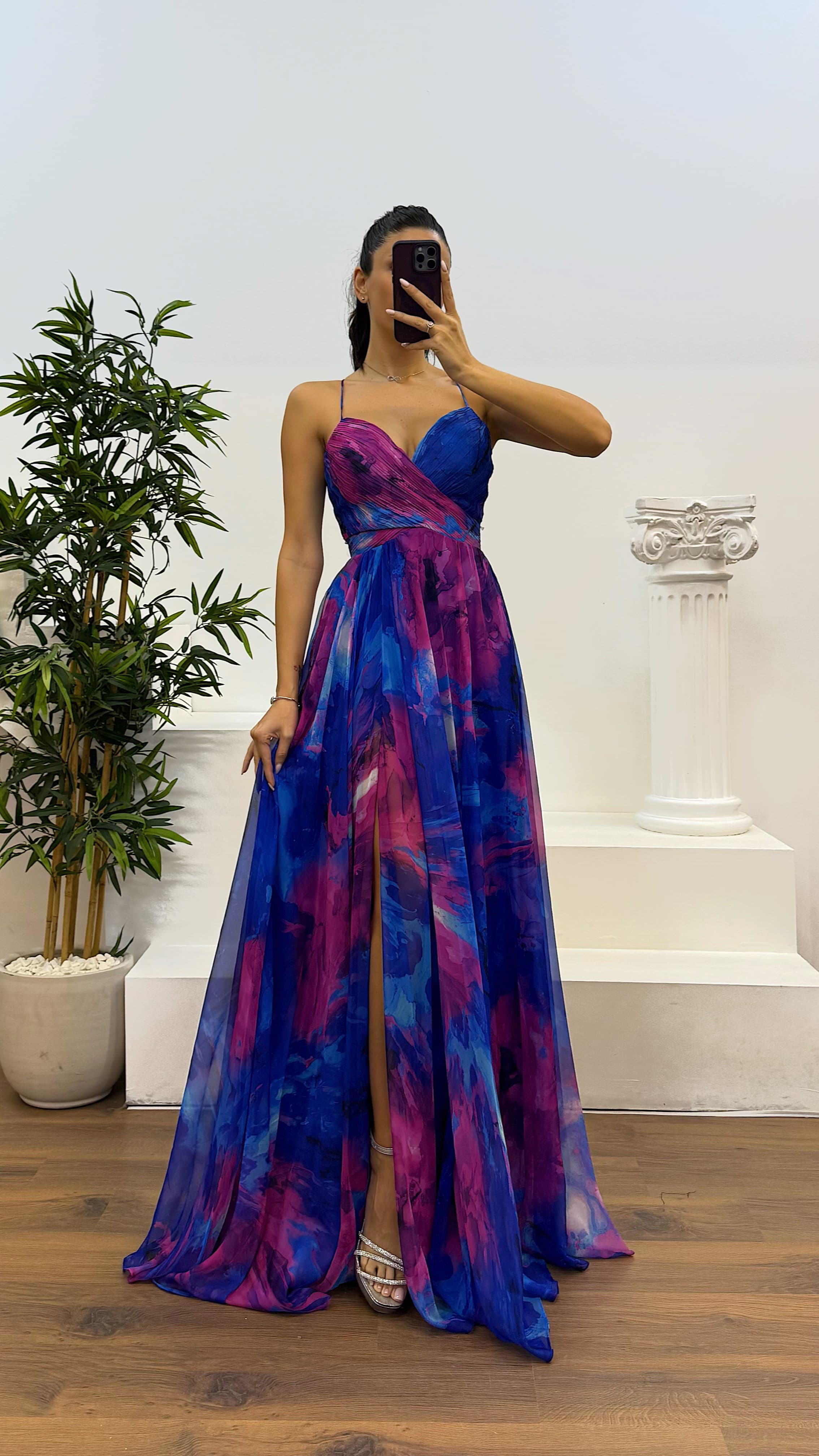 Abito da sera con dettaglio sulla schiena e spalline in corda Il prodotto è concepito come un abito da sera con imbottiture sul petto, fodera, incrocio posteriore in corda e chiusura a zip, spacco, adatto alle taglie 36-42. Lunghezza del prodotto: Può variare tra 175-170 cm. Tipo di tessuto: chiffon 66% viscosa 34% poliestere
