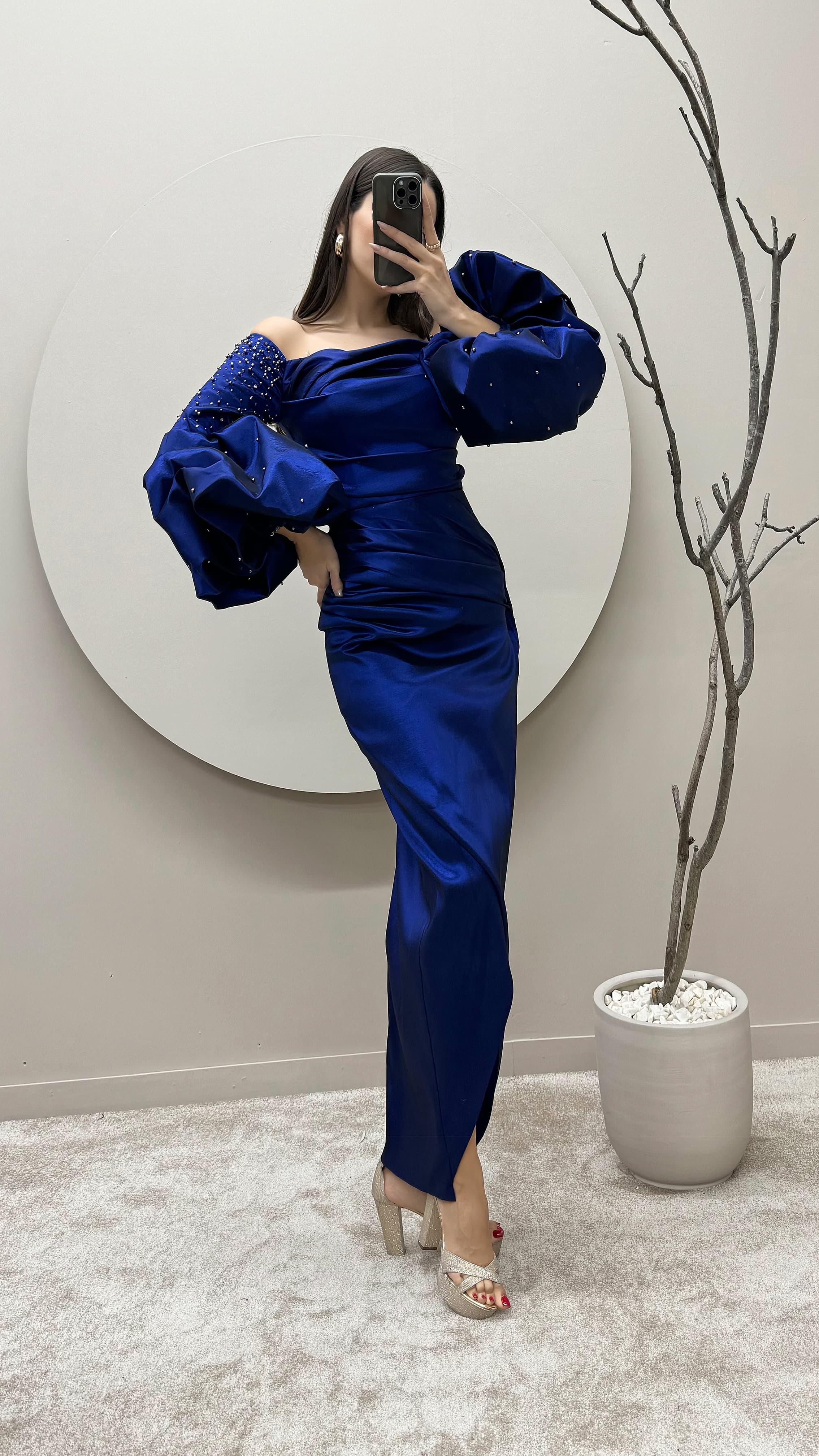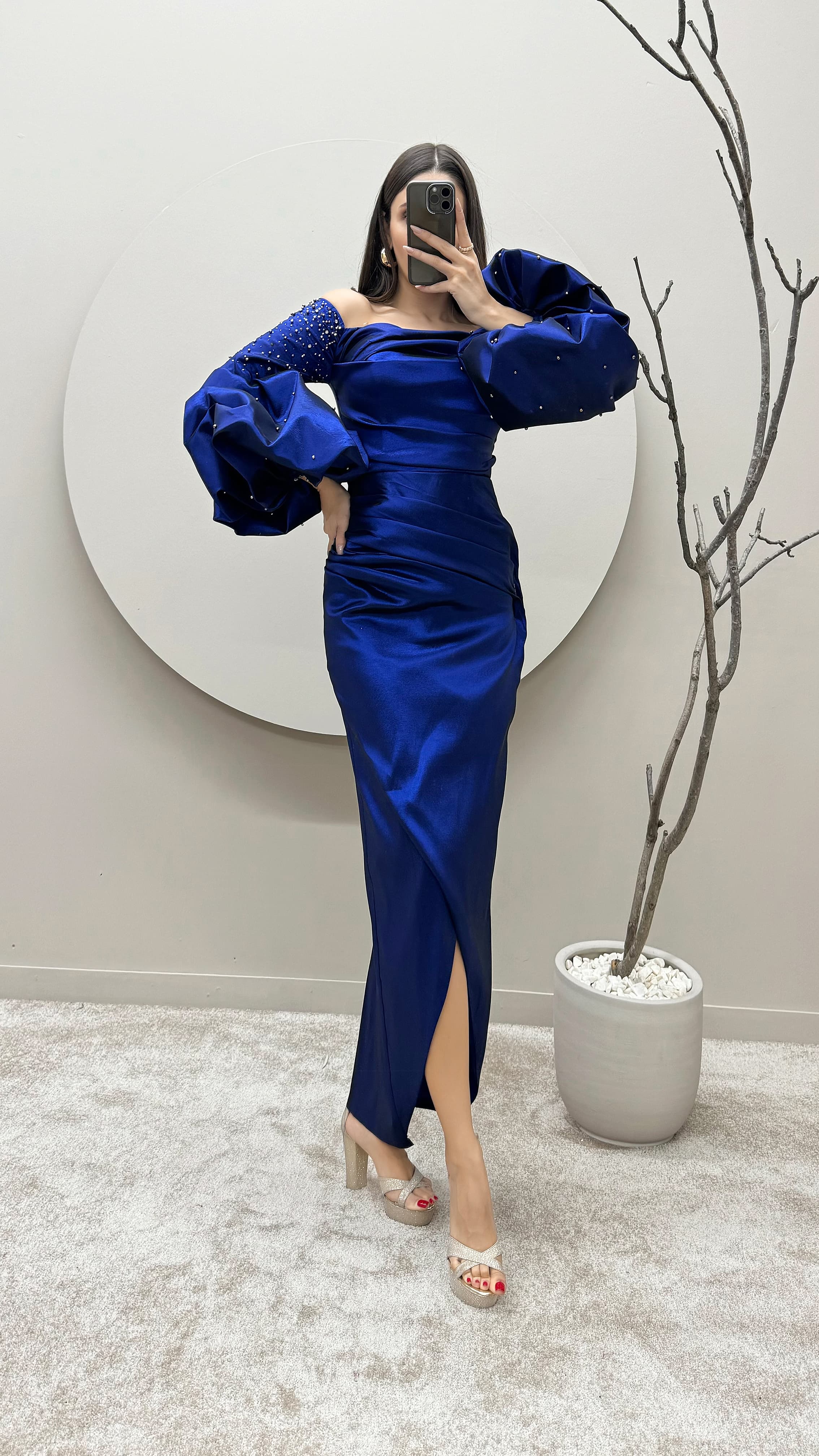 • Saks Straplez Balon Kol Taşlı Elbise