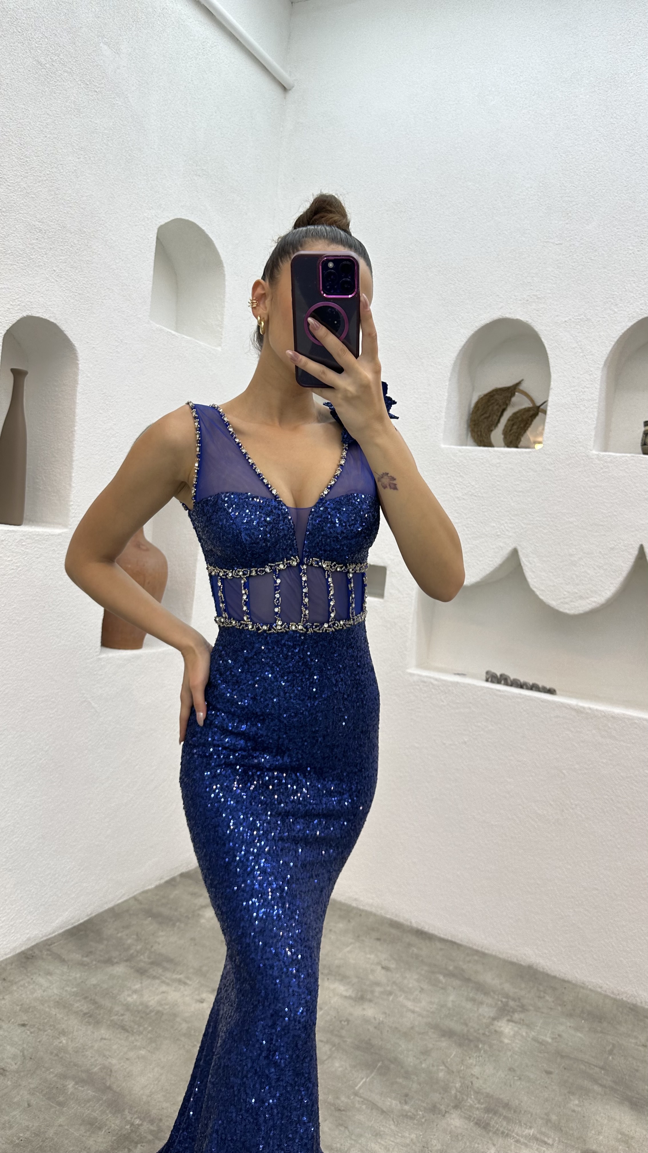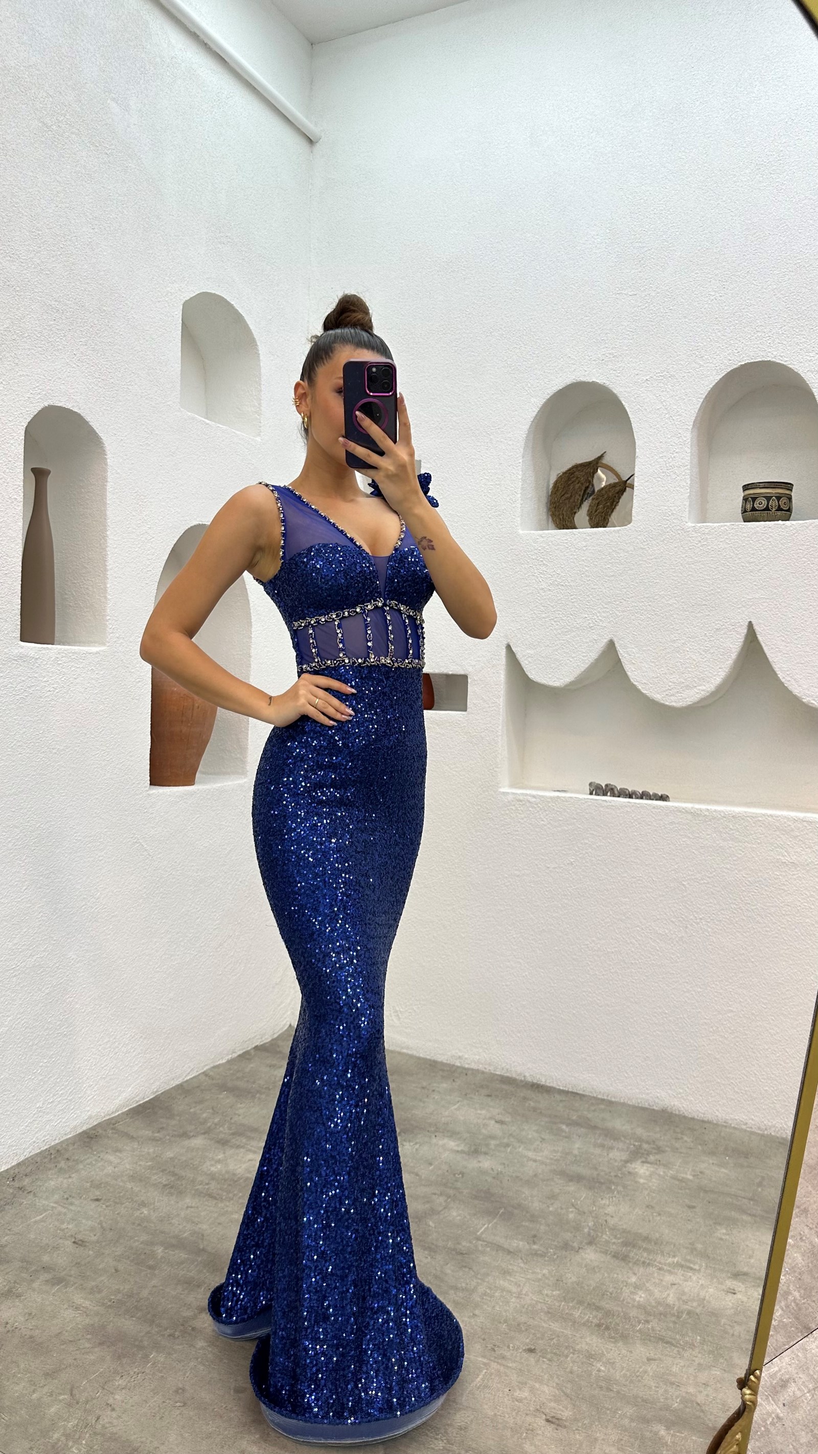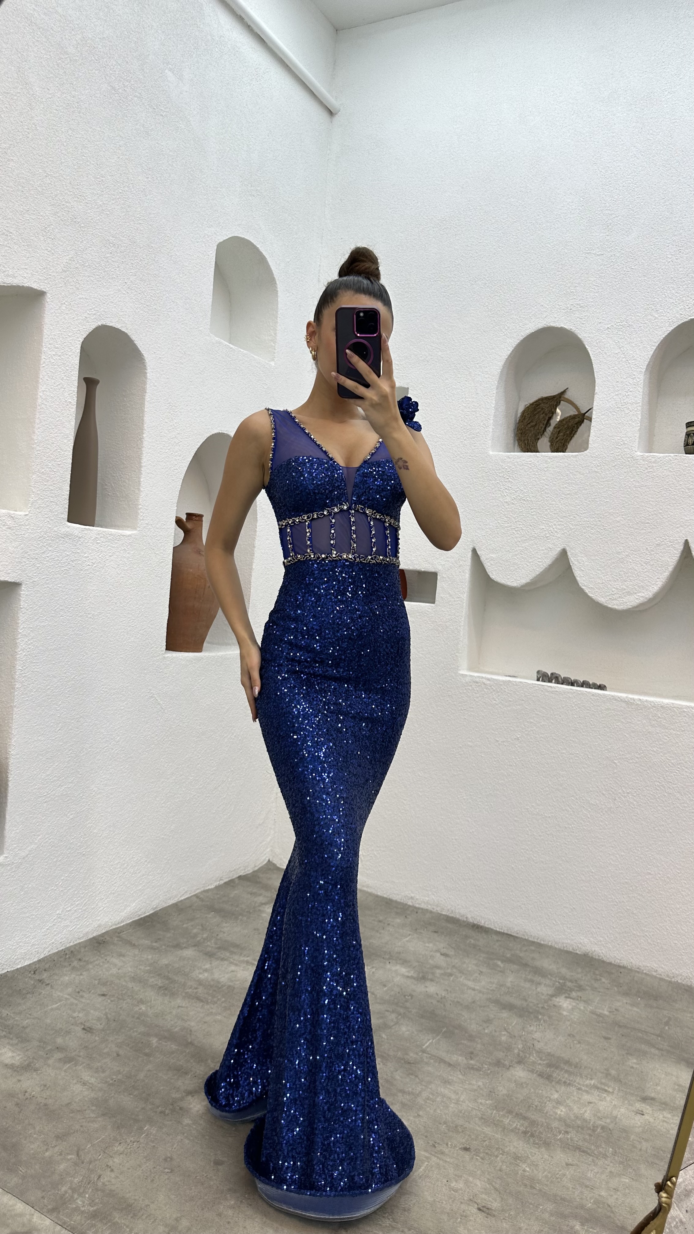 • Zümrüt Transparan Detay Pul Payet Abiye Elbise