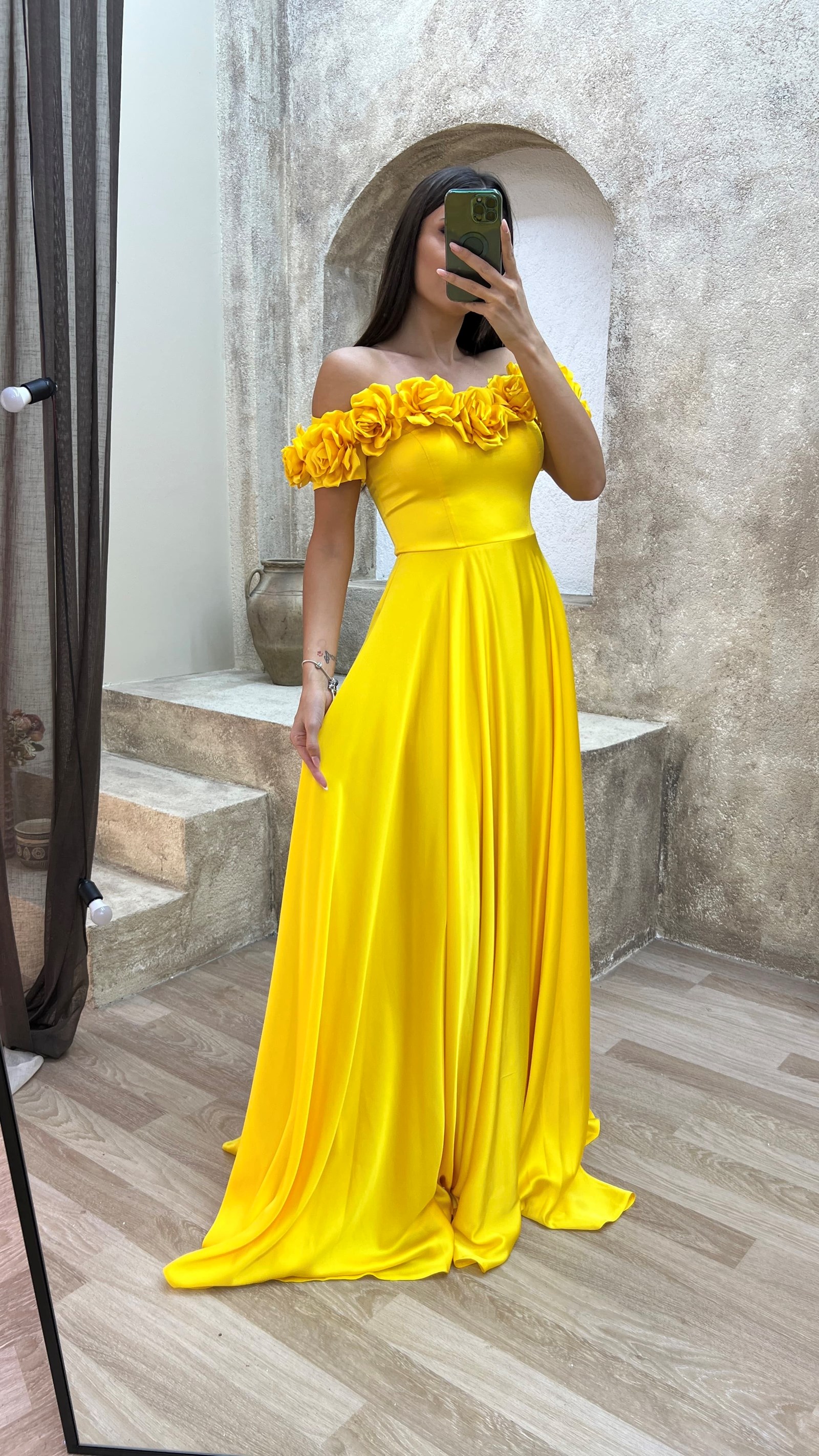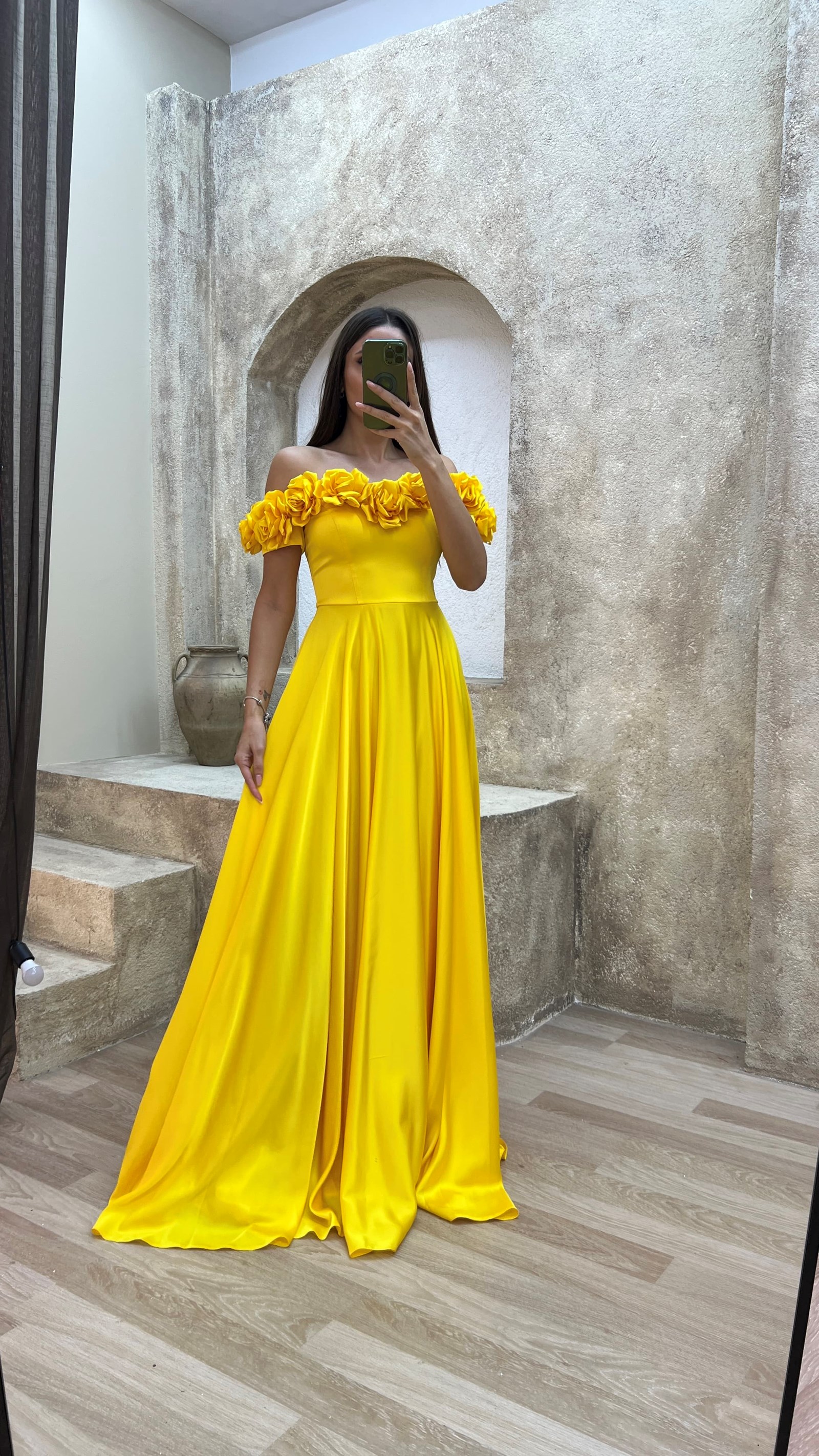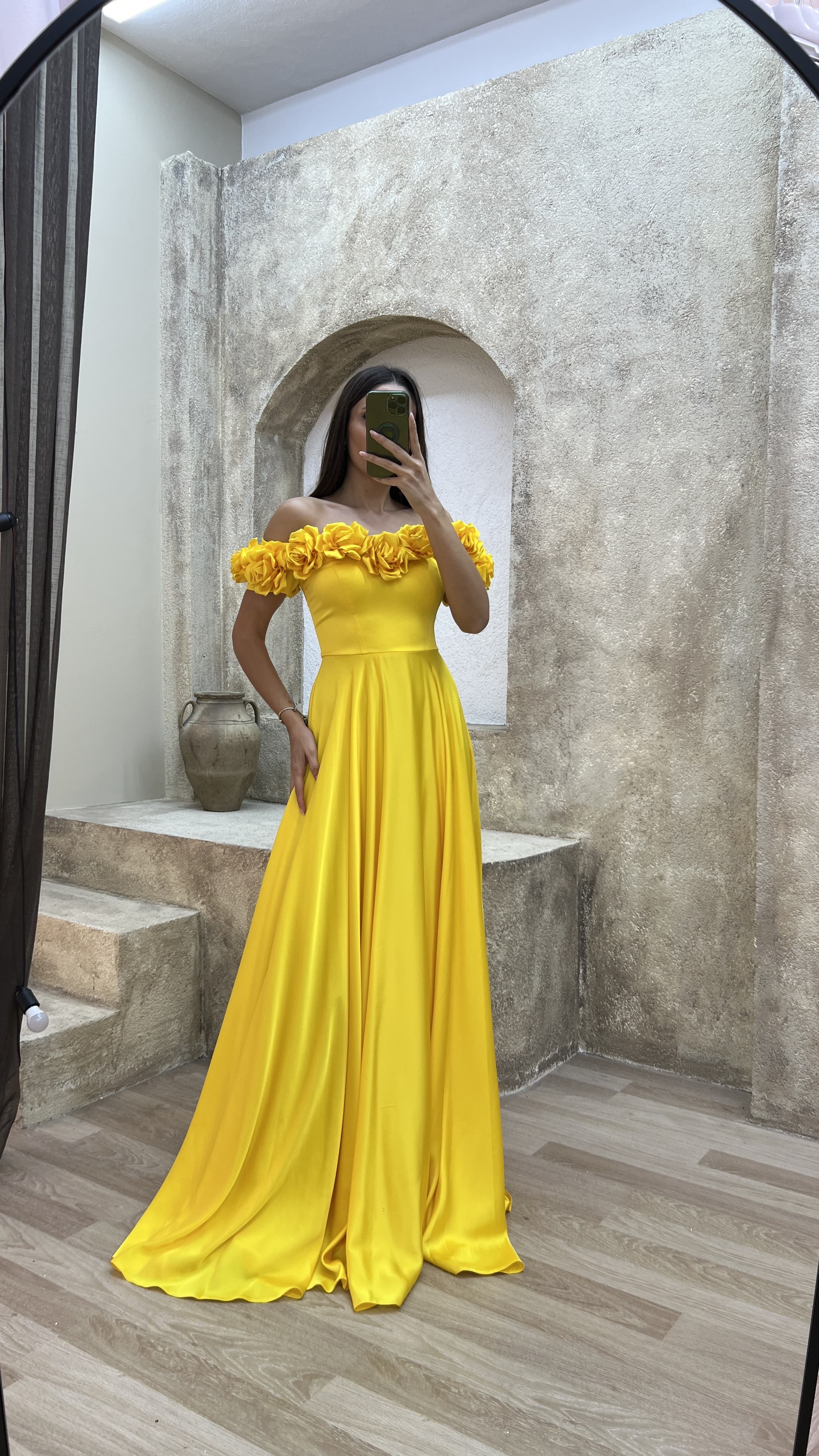 • Sarı Göğsü Gül Detay Tasarım Saten Abiye Elbise
