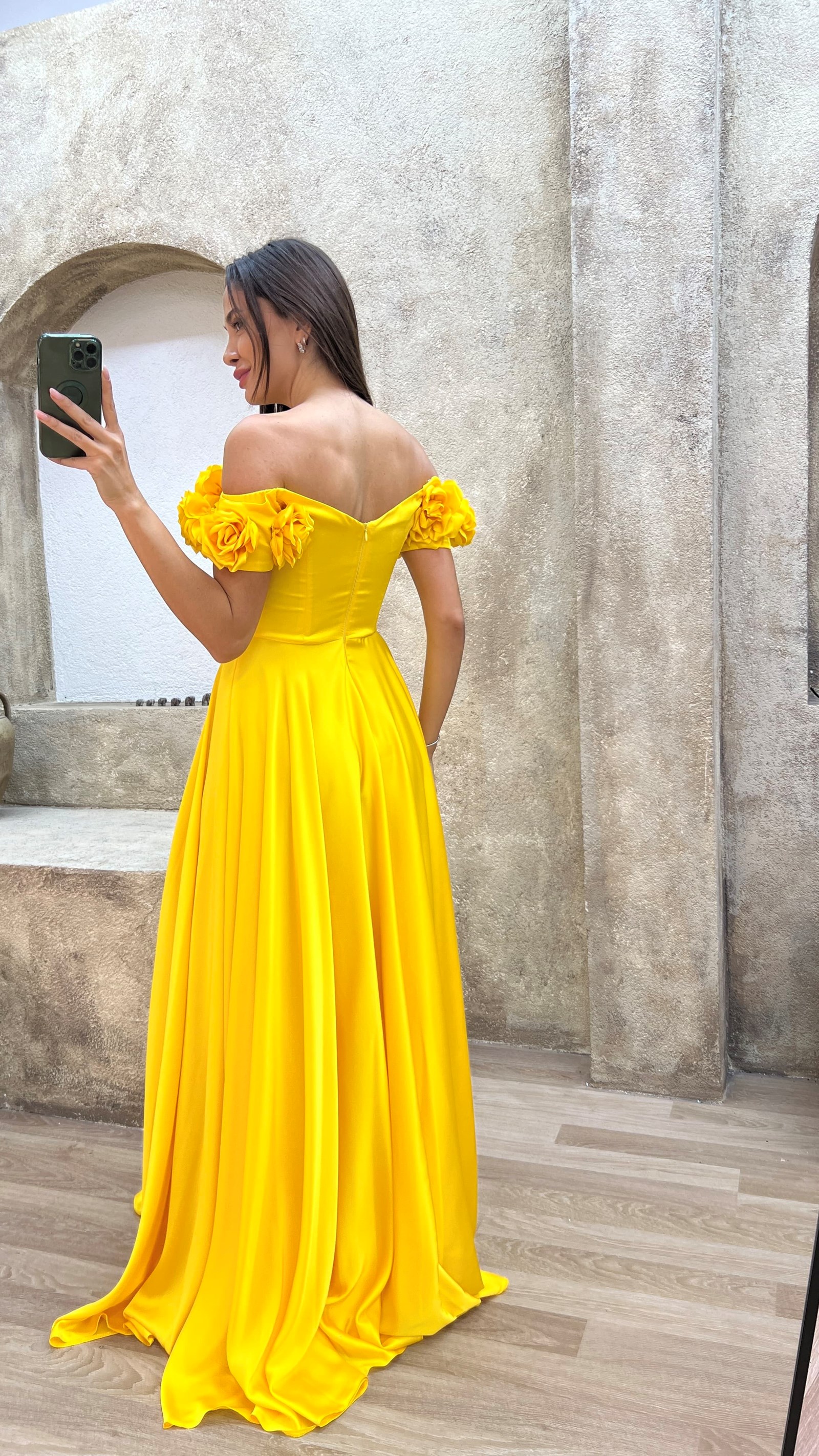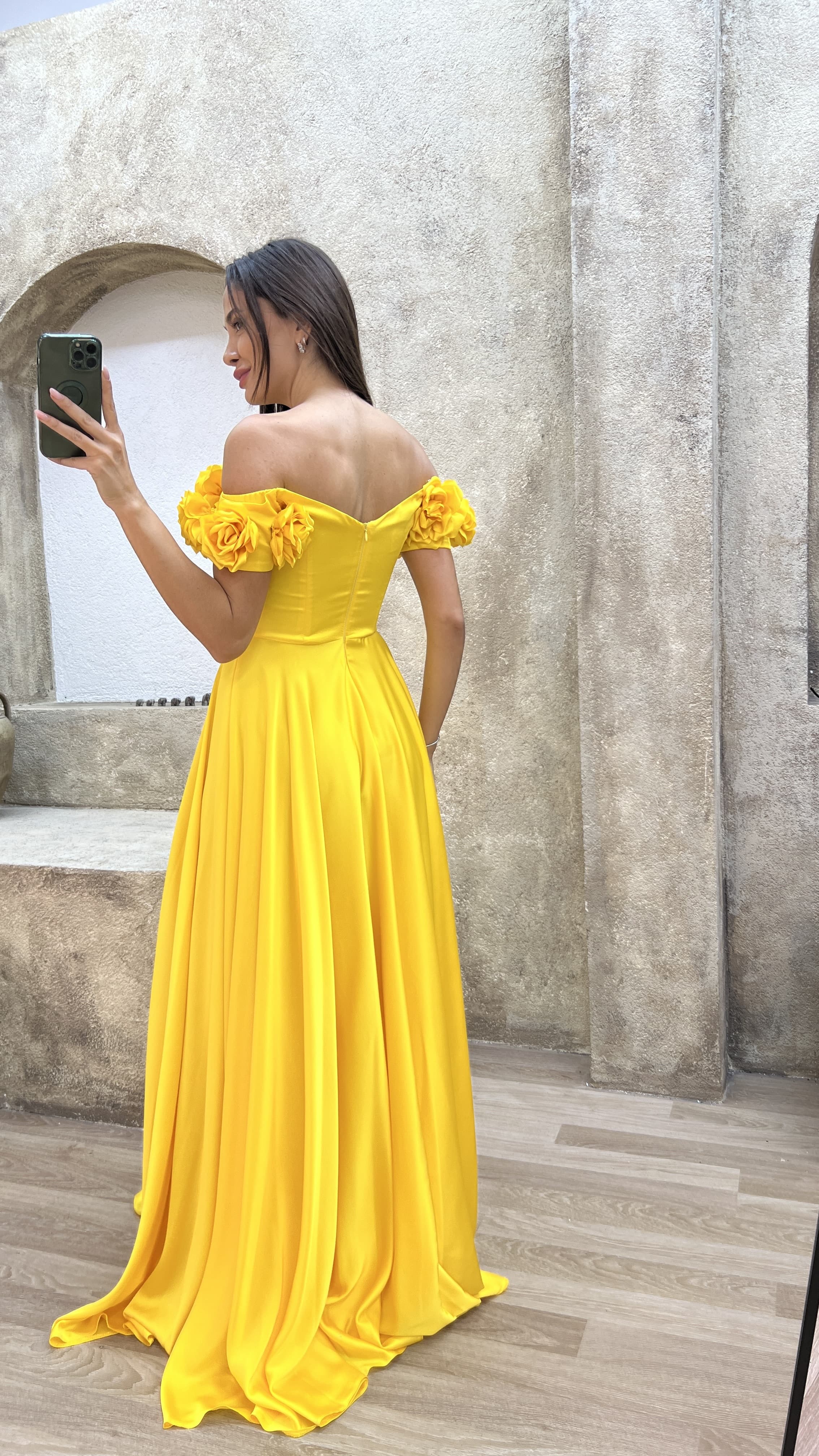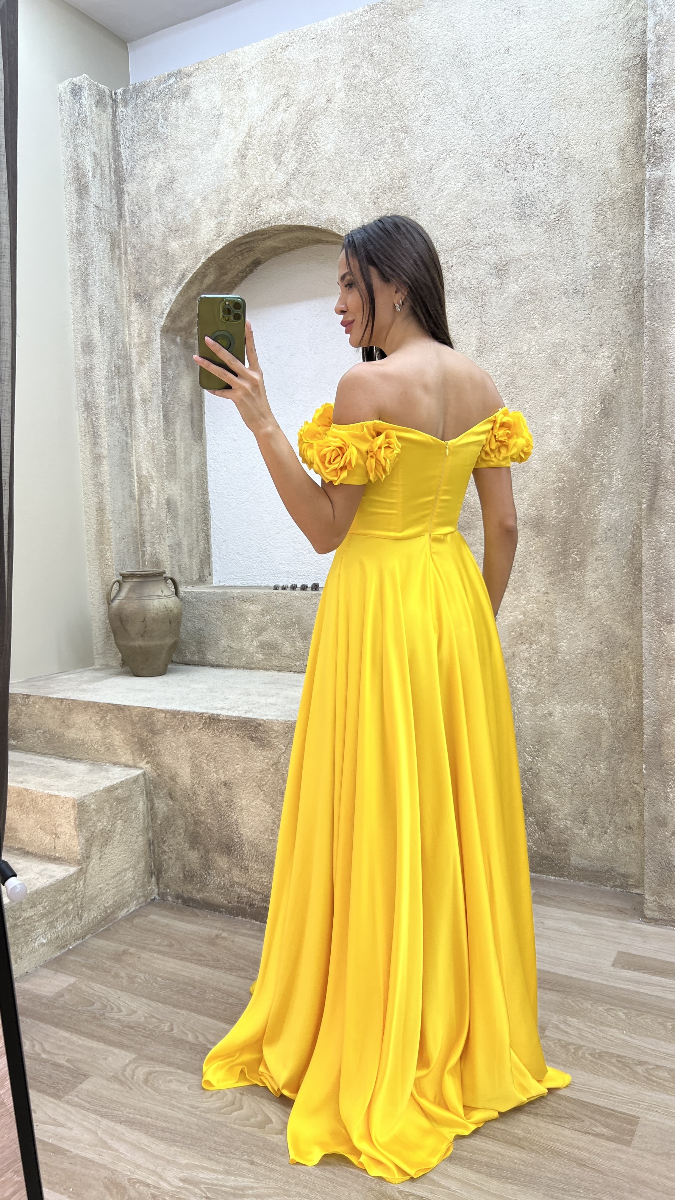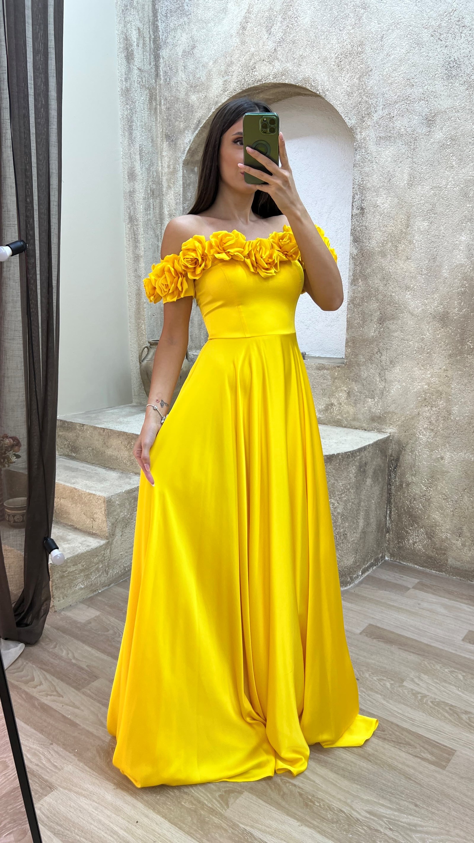 • Sarı Göğsü Gül Detay Tasarım Saten Abiye Elbise