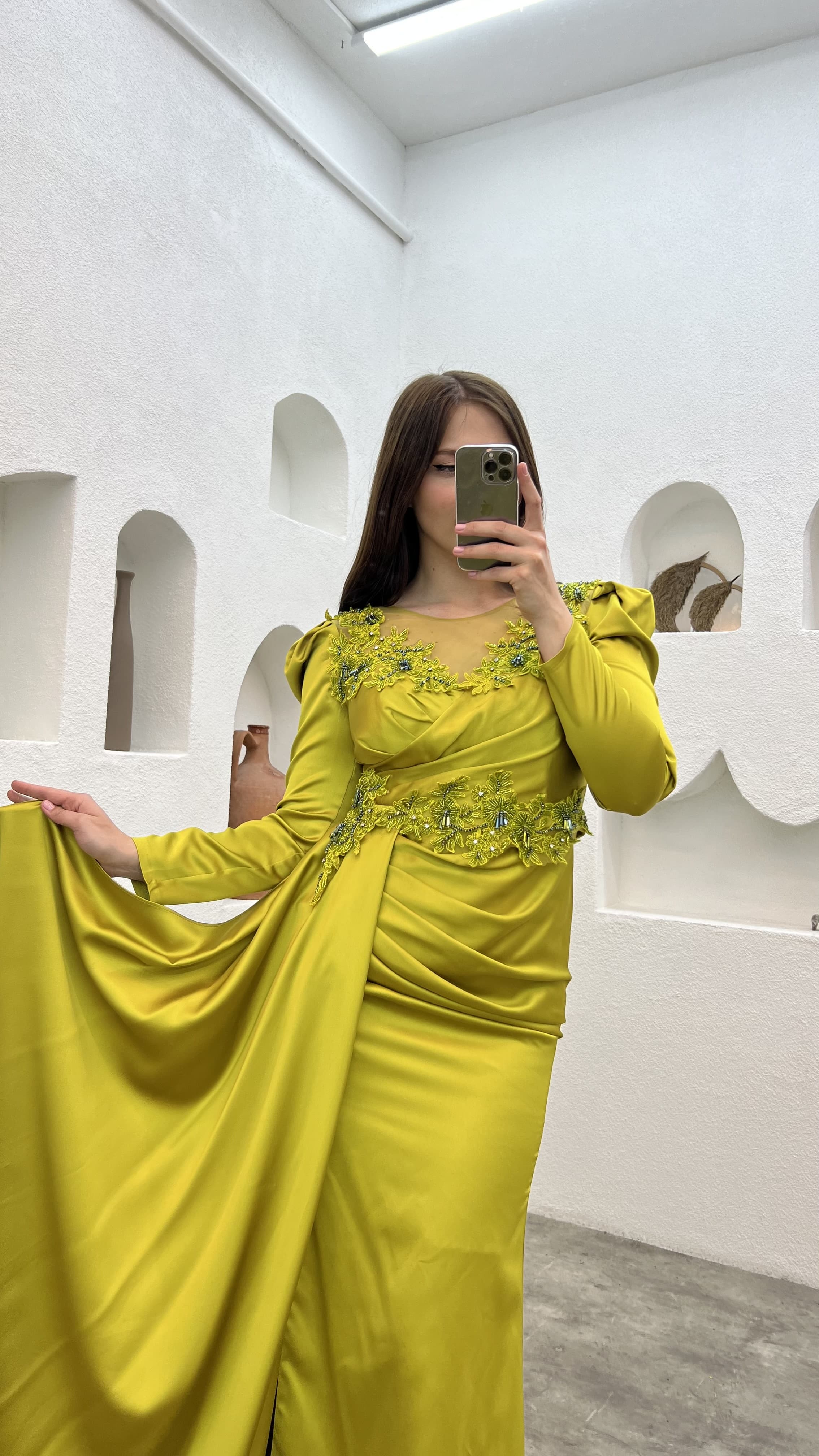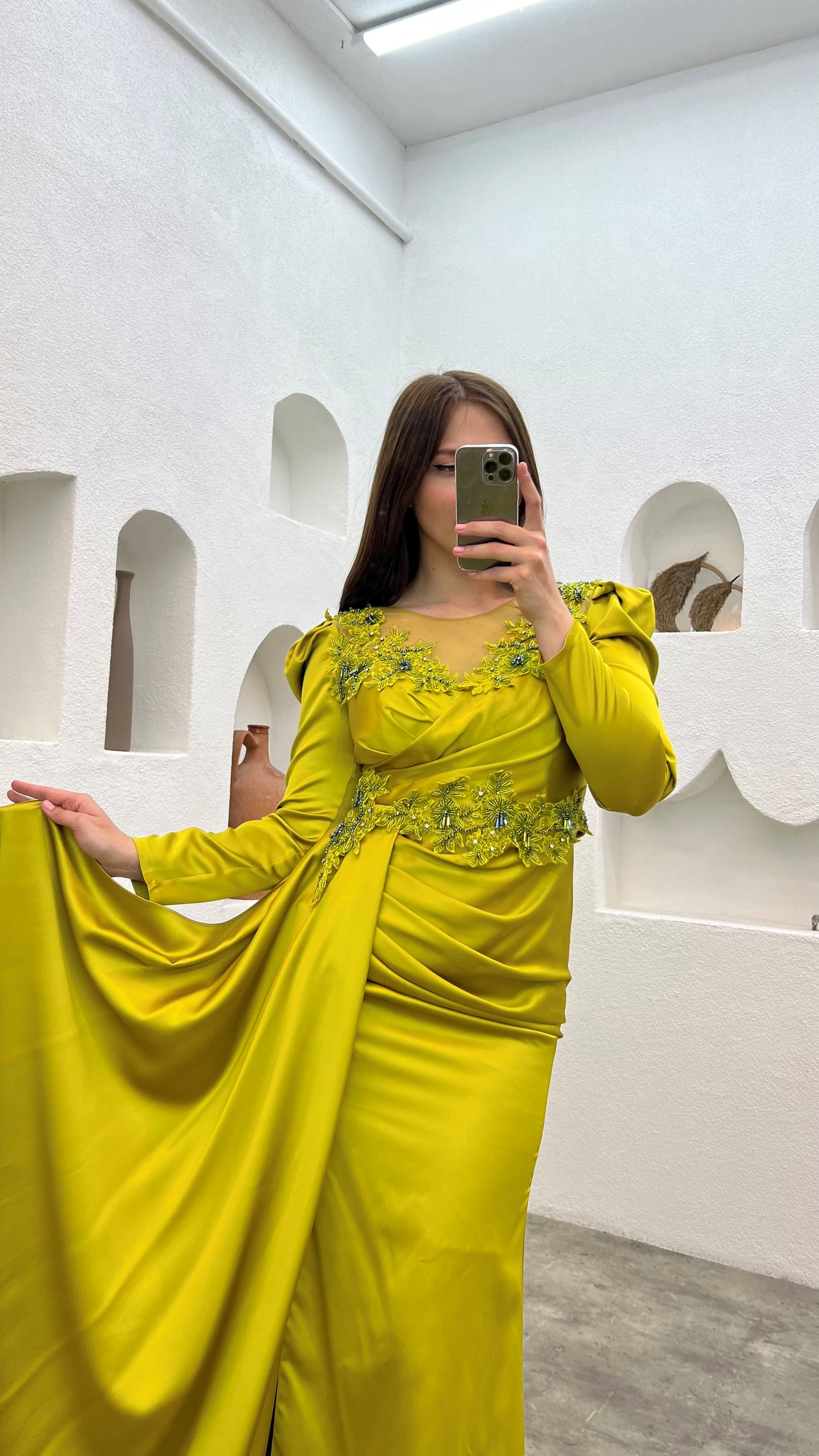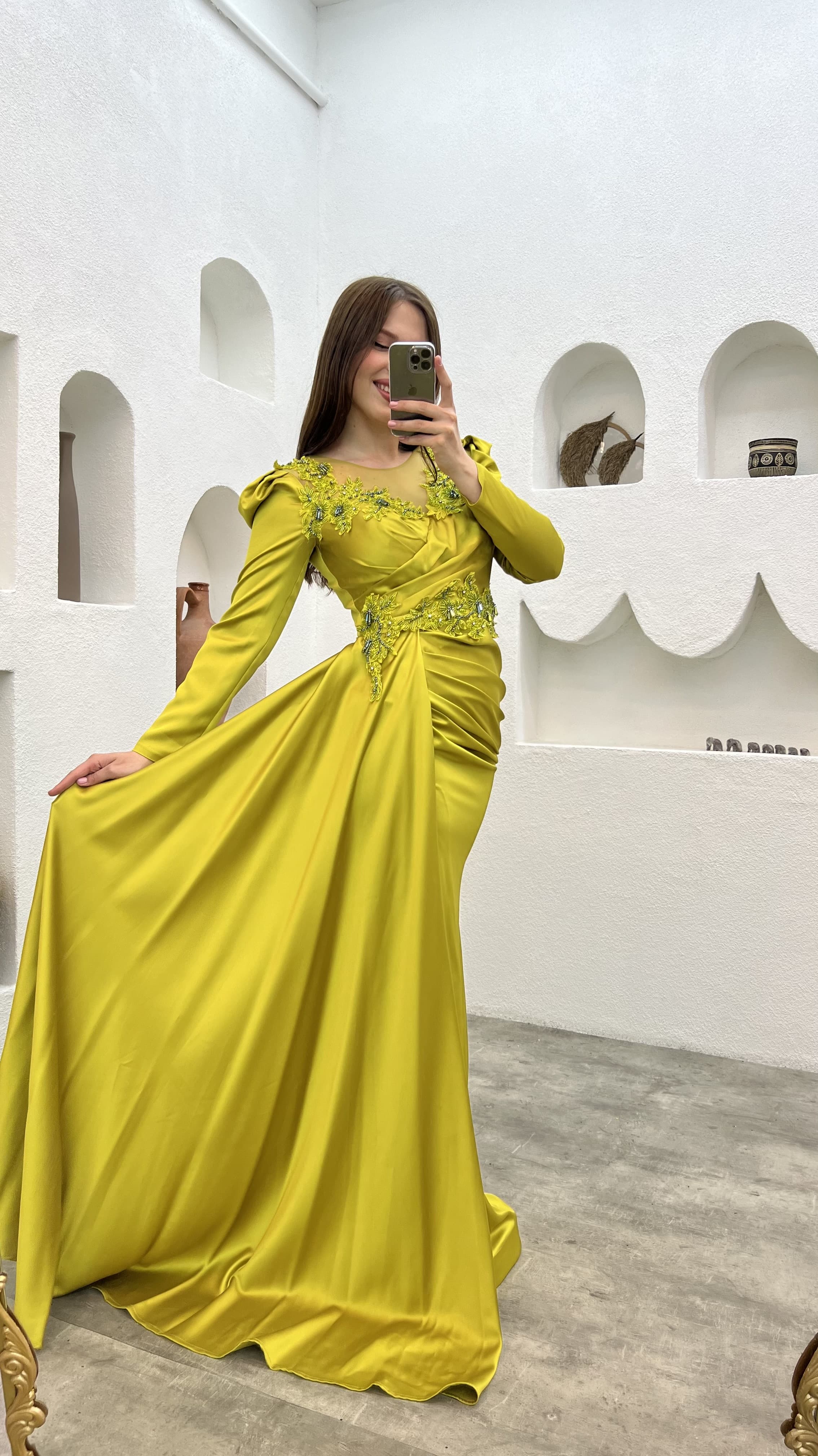• Sarı Göğsü İşlemeli Saten Büyük Beden Abiye Elbise