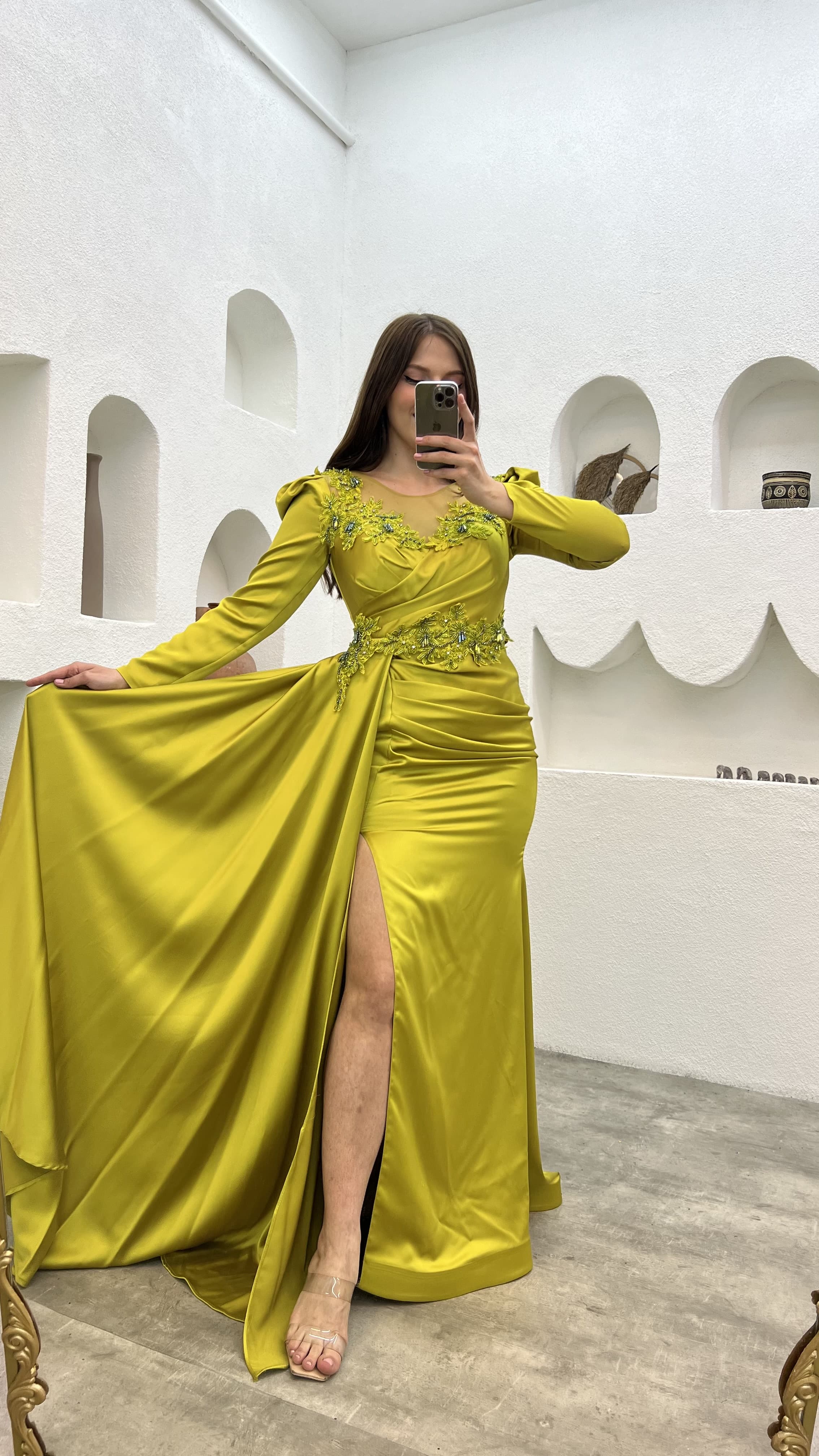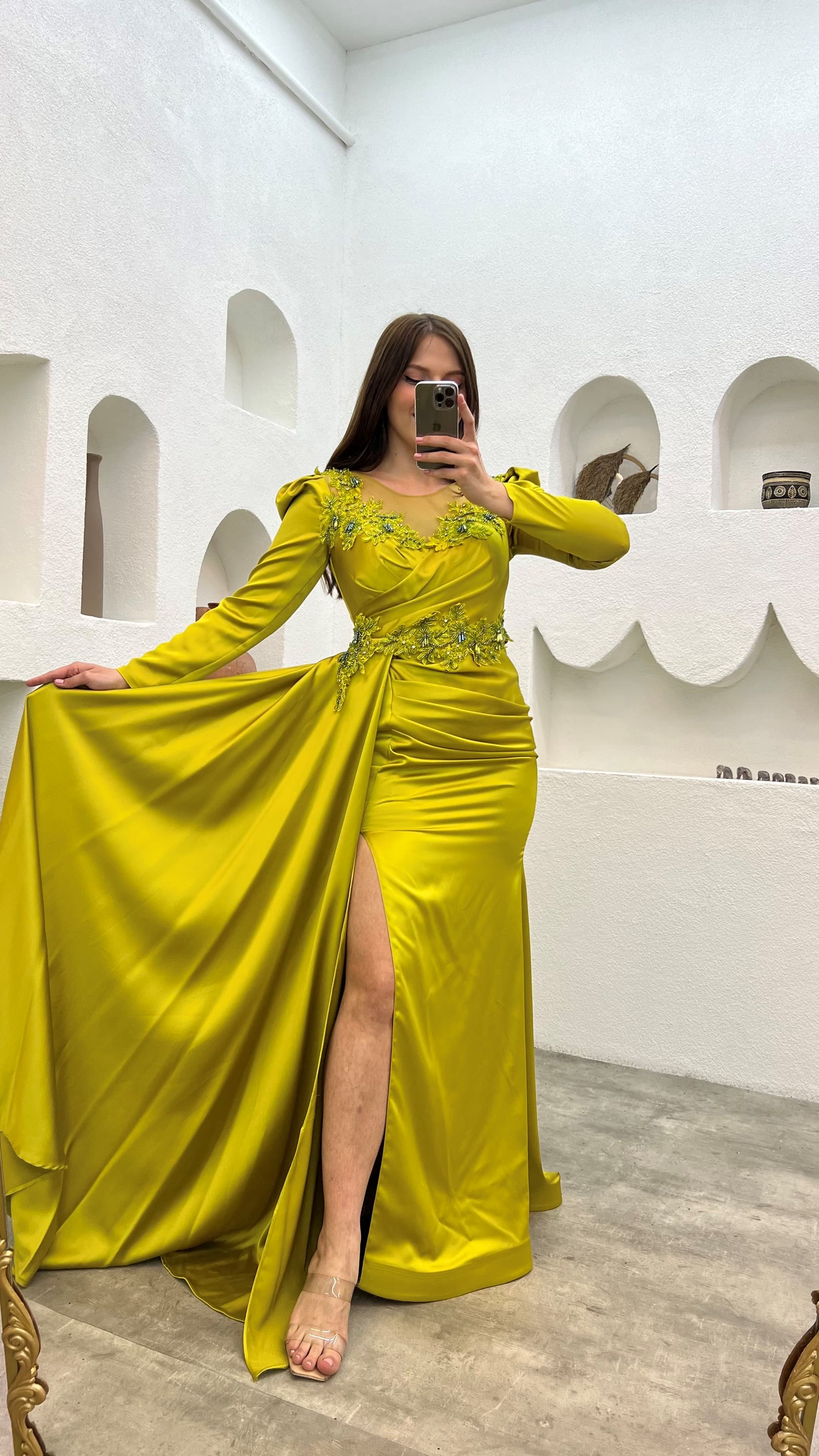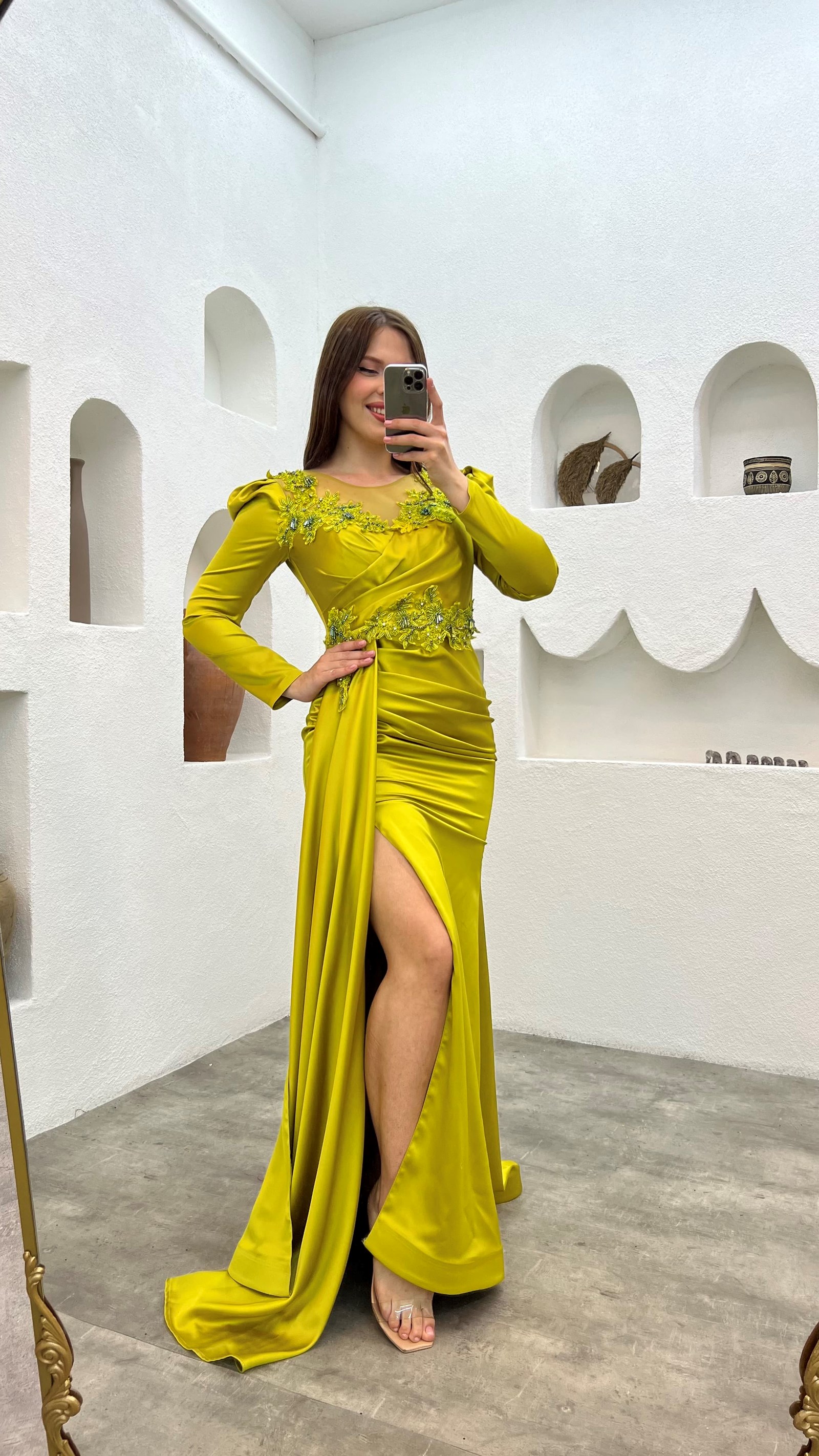 • Sarı Göğsü İşlemeli Saten Büyük Beden Abiye Elbise