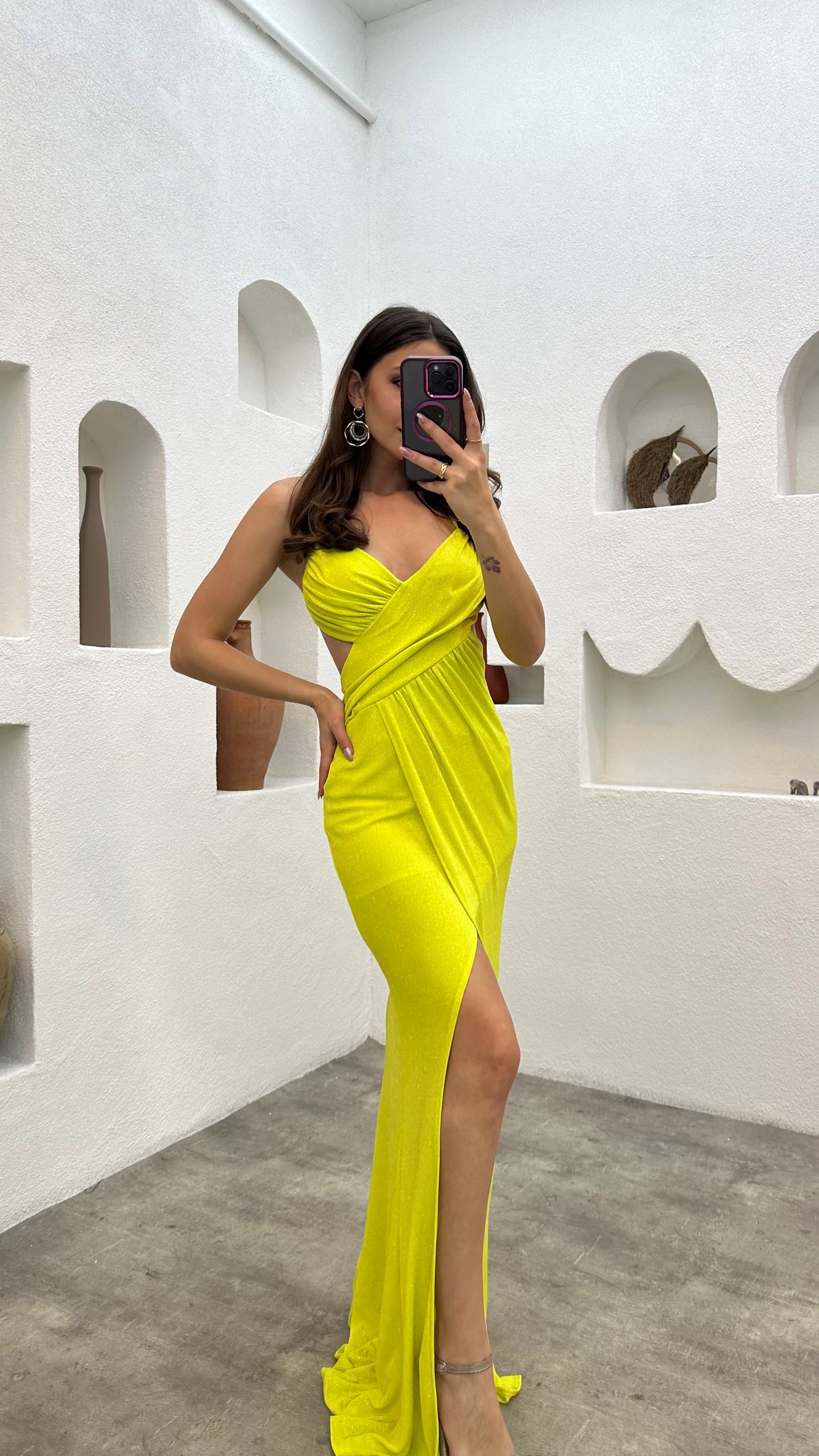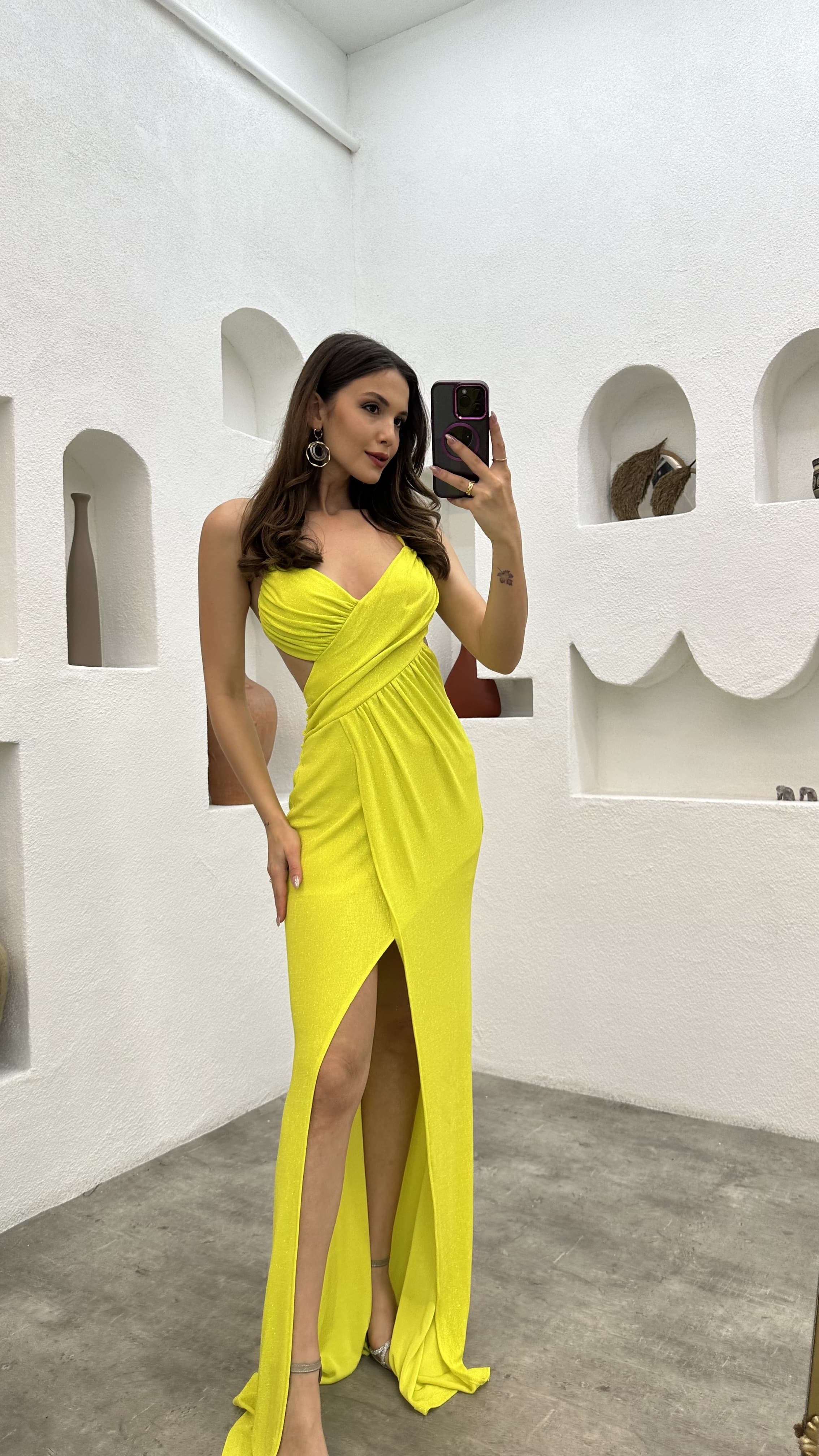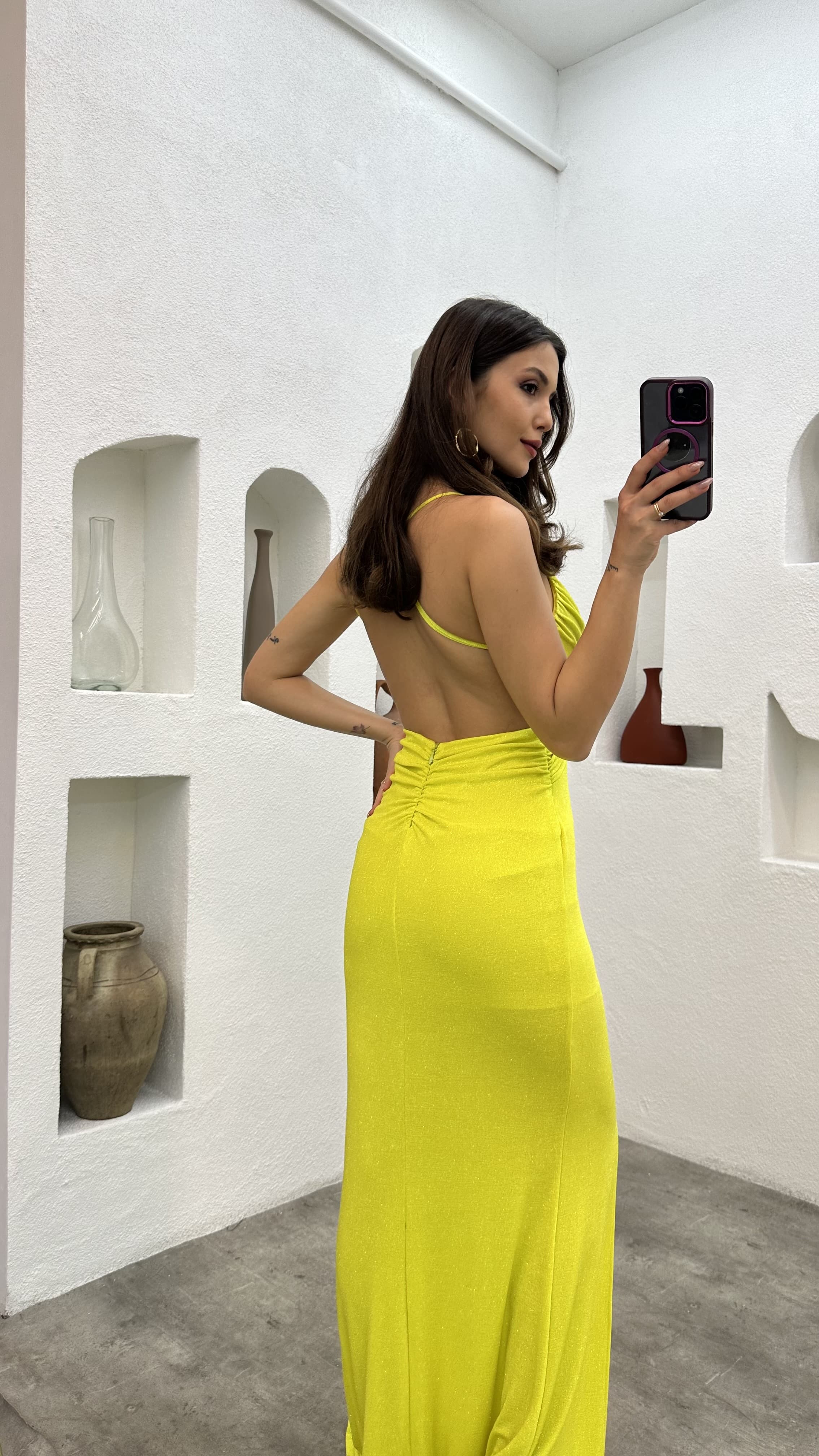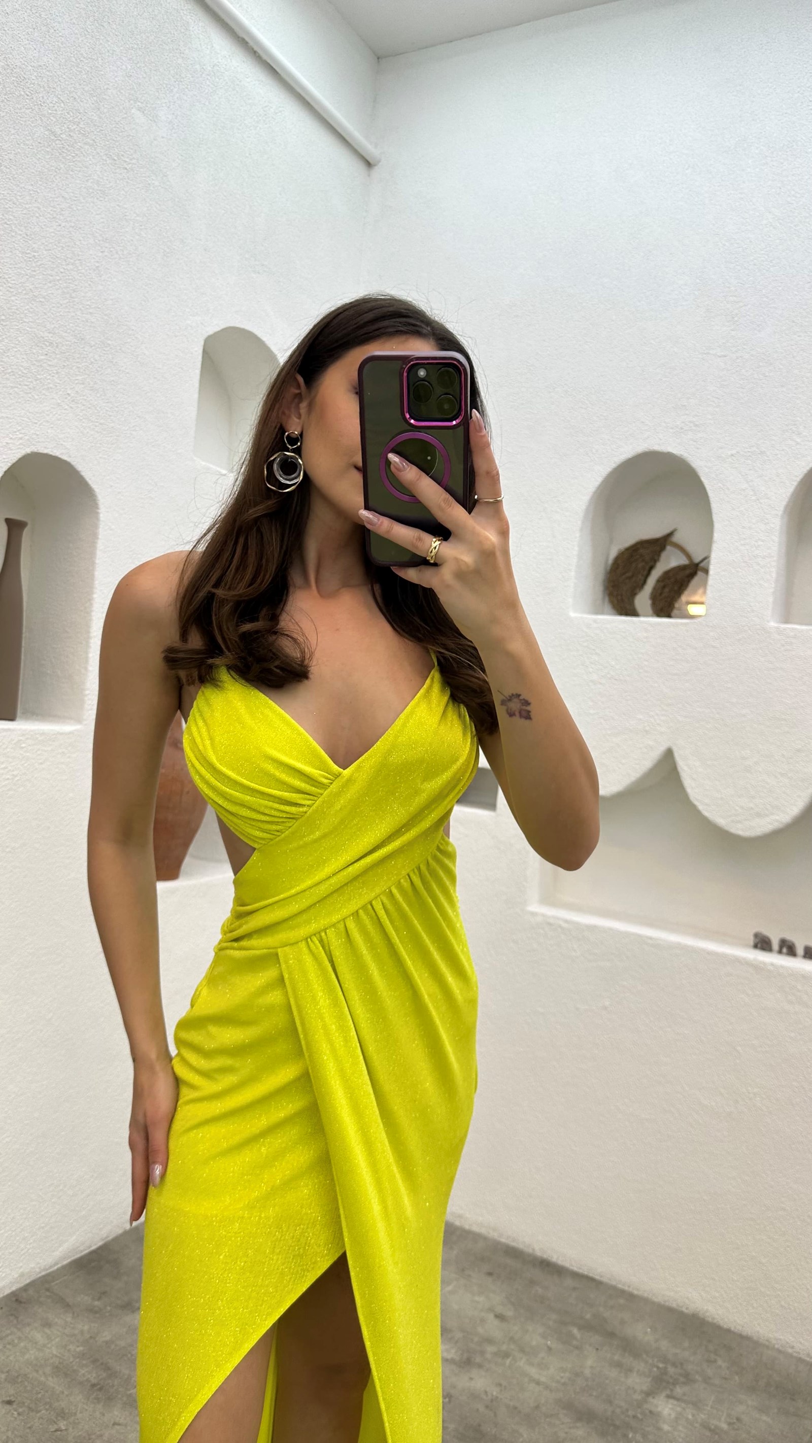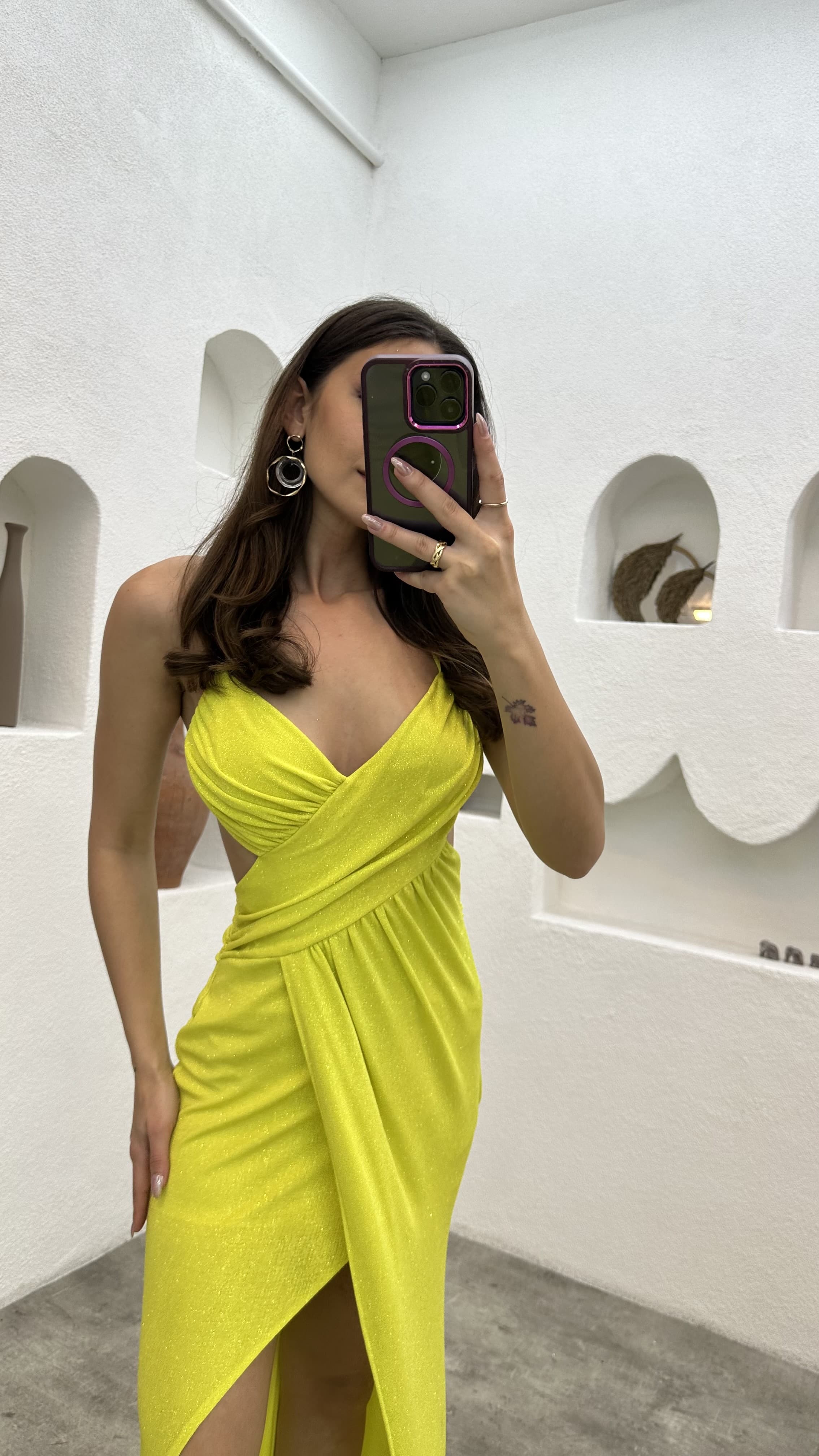 • Zümrüt İp Askılı Simli Abiye Elbise