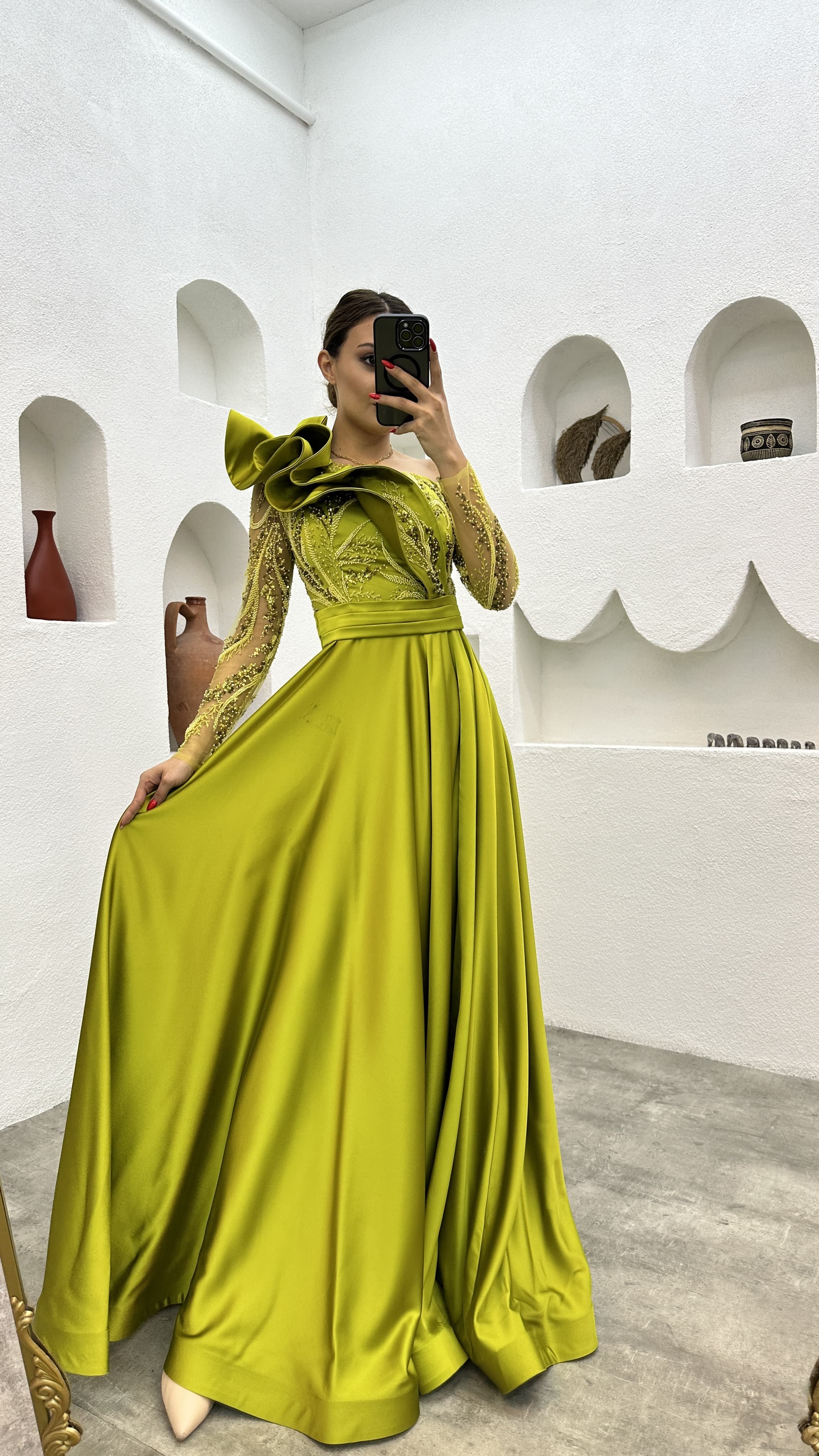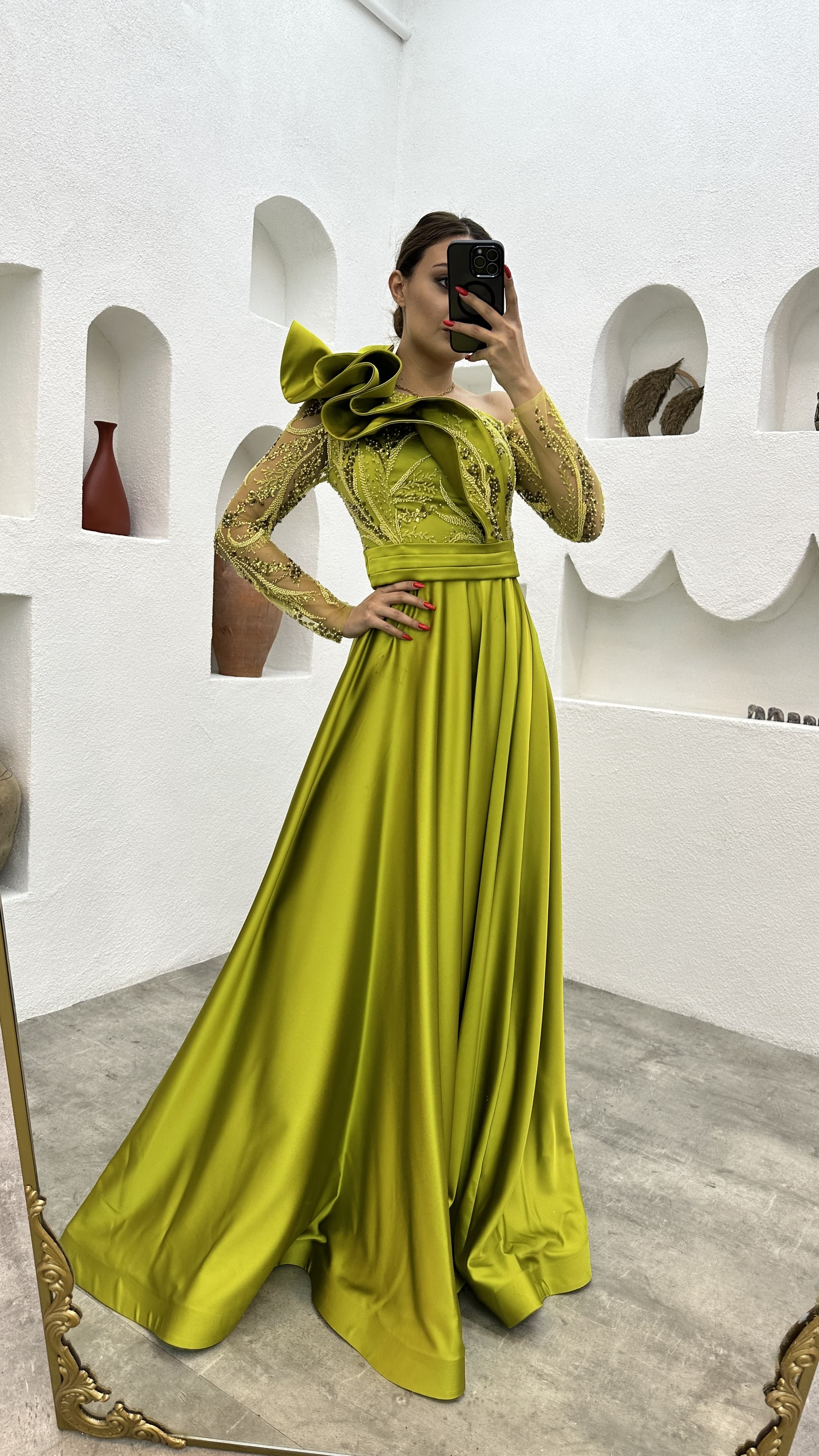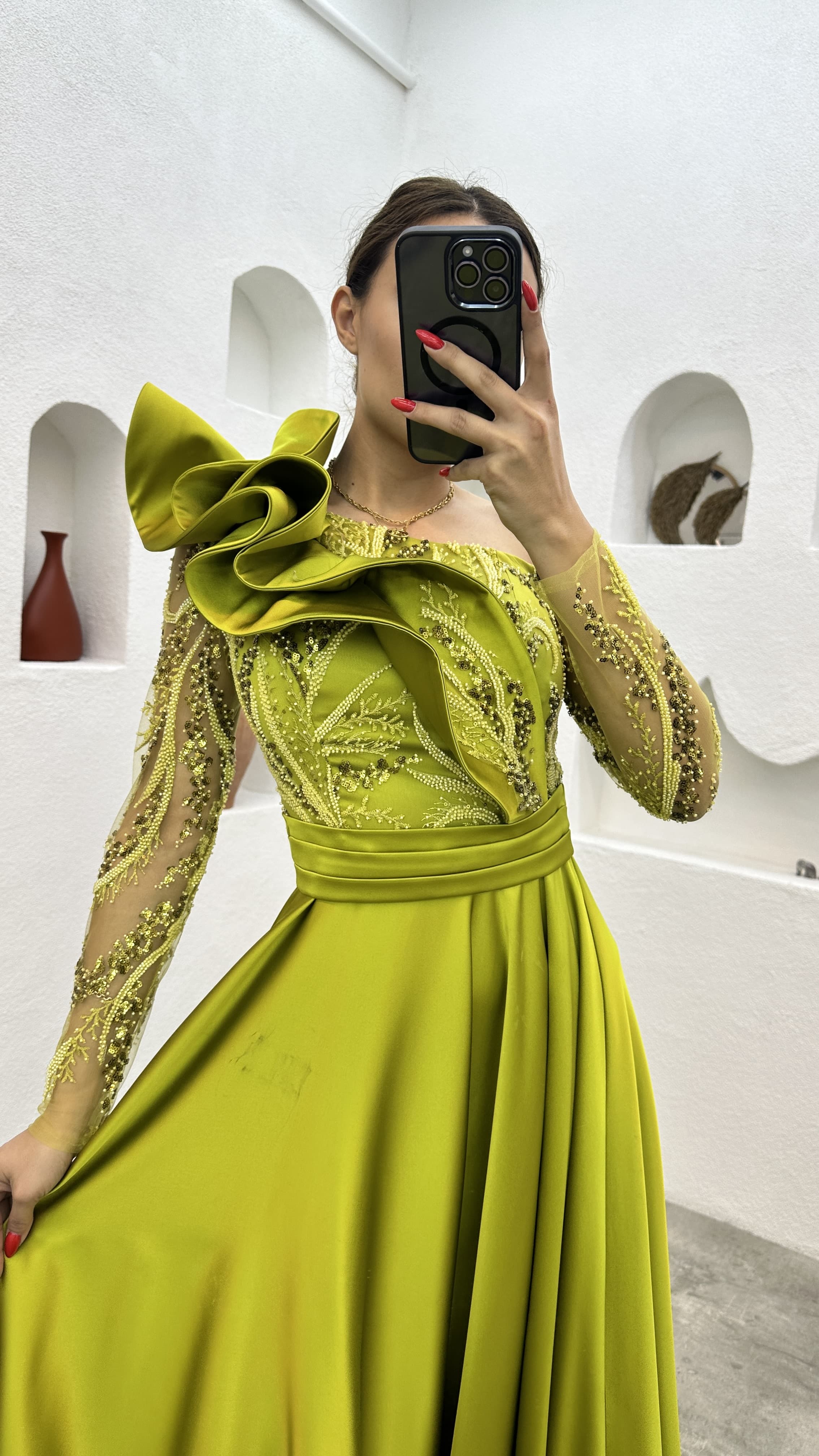 • Sarı Tek Kol Volanlı İşlemeli Abiye Elbise